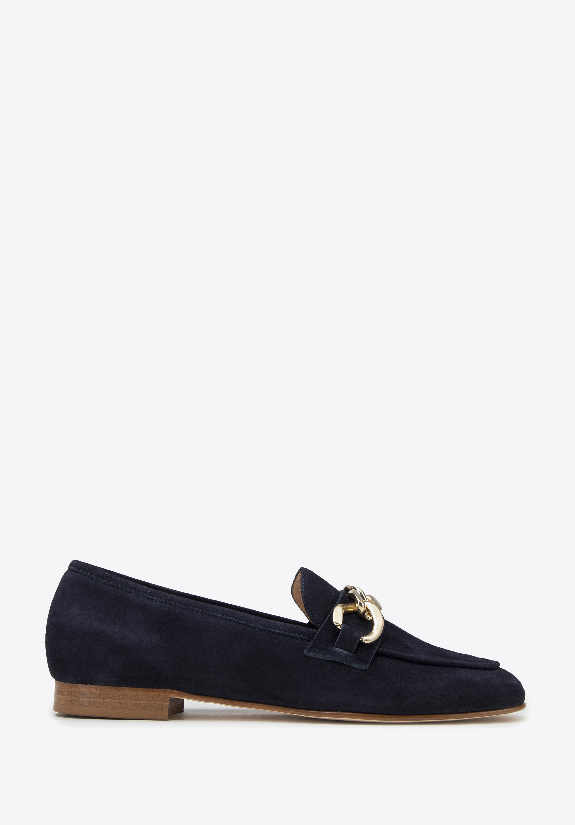 Ці жіночі мокасани - чудовий вибір для повсякденного носіння. Вони мають витончену форму, з характерним обшитим носом і блискучим ланцюжком з товстими ланками. Вони виготовлені з високоякісної замшевої шкіри. Вони досить м''які, легкі і мають шкіряну устілку, яка забезпечить комфорт ваших ніг. Низький каблук додасть кілька сантиметрів до вашого зросту. Ця класична модель чудово виглядатиме як з брюками, так і з сукнею. Прості жіночі замшеві мокасини з ланцюжком - елегантний аксесуар на багато сезонів, який варто мати у своєму гардеробі.