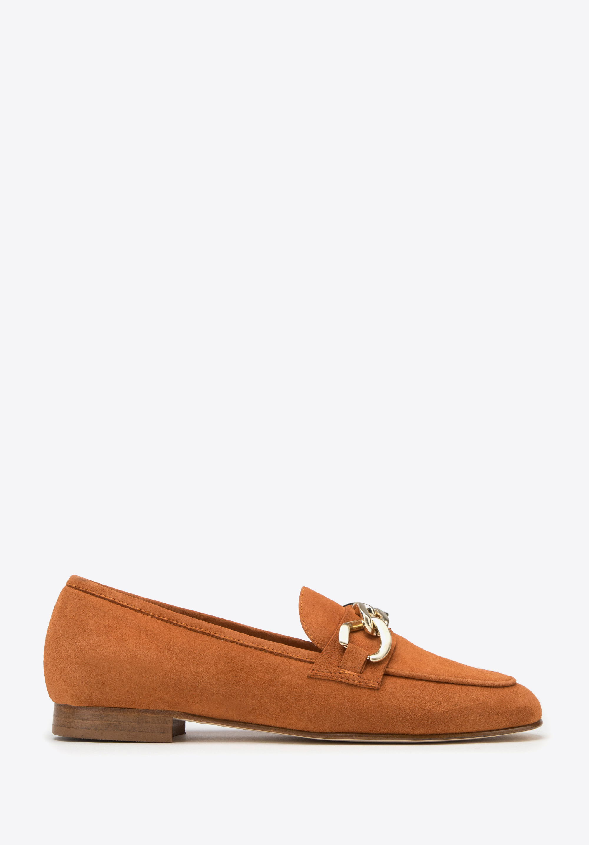 Ці жіночі мокасани - чудовий вибір для повсякденного носіння. Вони мають витончену форму, з характерним обшитим носом і блискучим ланцюжком з товстими ланками. Вони виготовлені з високоякісної замшевої шкіри. Вони досить м''які, легкі і мають шкіряну устілку, яка забезпечить комфорт ваших ніг. Низький каблук додасть кілька сантиметрів до вашого зросту. Ця класична модель чудово виглядатиме як з брюками, так і з сукнею. Прості жіночі замшеві мокасини з ланцюжком - елегантний аксесуар на багато сезонів, який варто мати у своєму гардеробі.