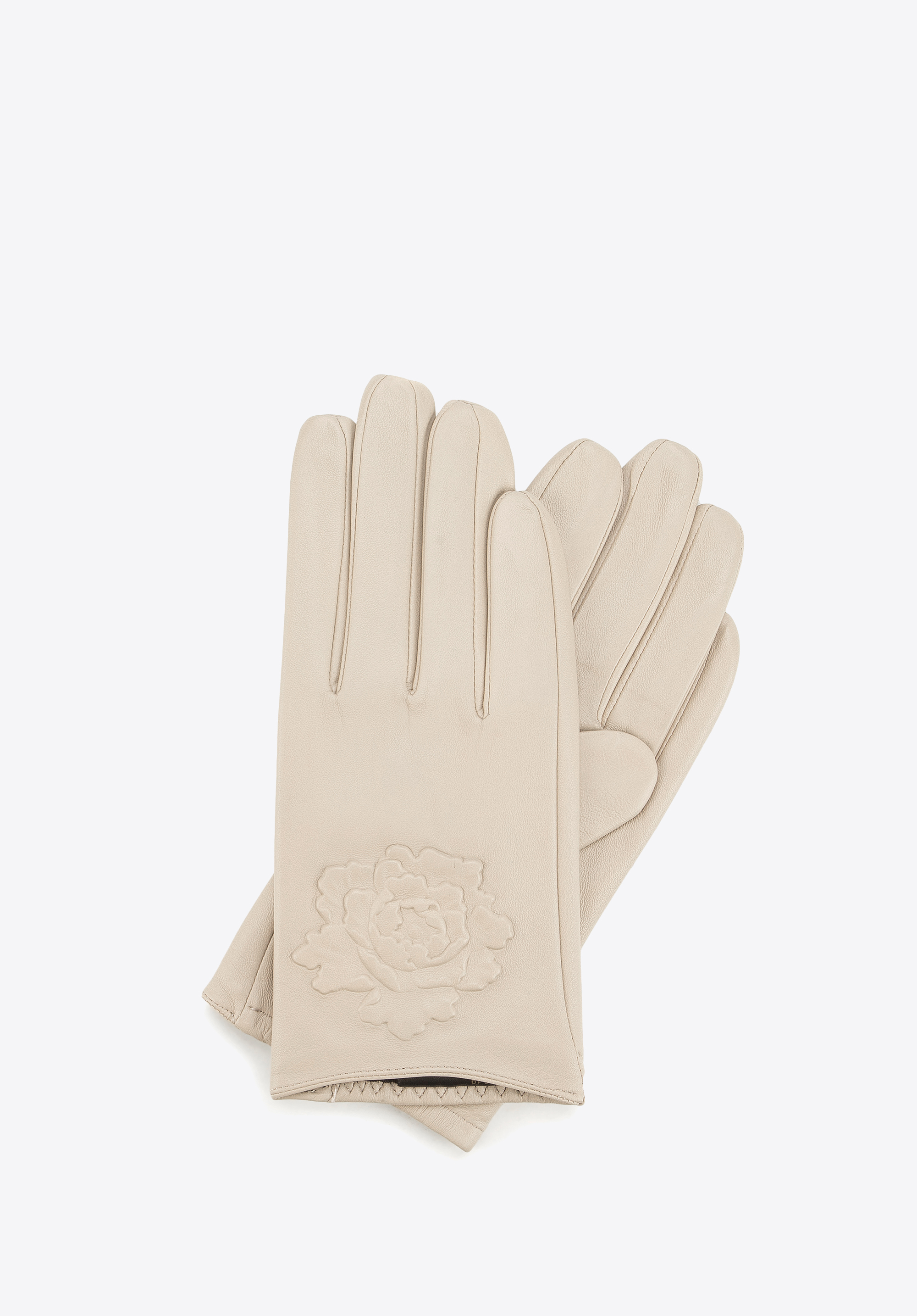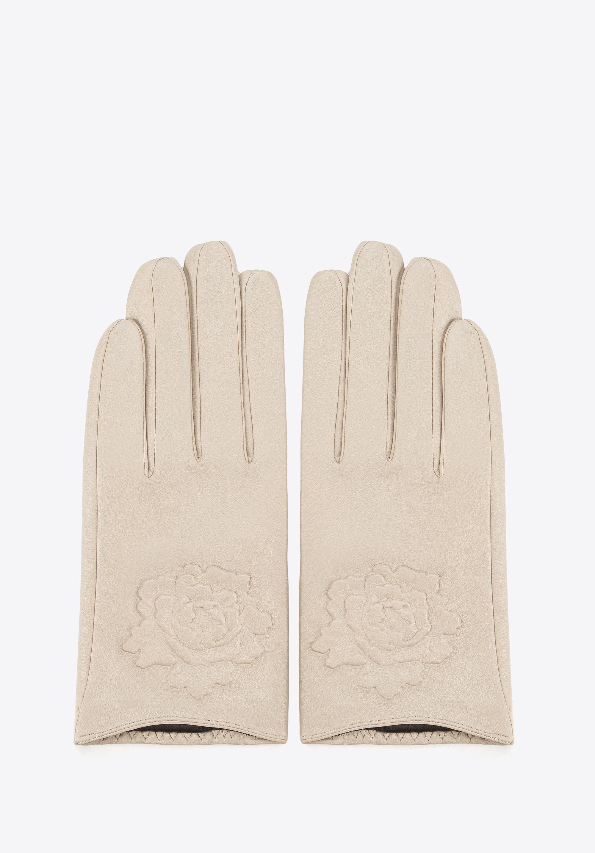 Елегантні жіночі рукавички, виготовлені з високоякісної овчини. Шикарне тиснення троянди на шкірі надає моделі виключно жіночний характер. Завдяки вшитій гумці з внутрішньої сторони, модель пристосовується до руки. Пропонується кілька колірних варіантів: зелений, чорний, темно-синій і світло-бежевий.