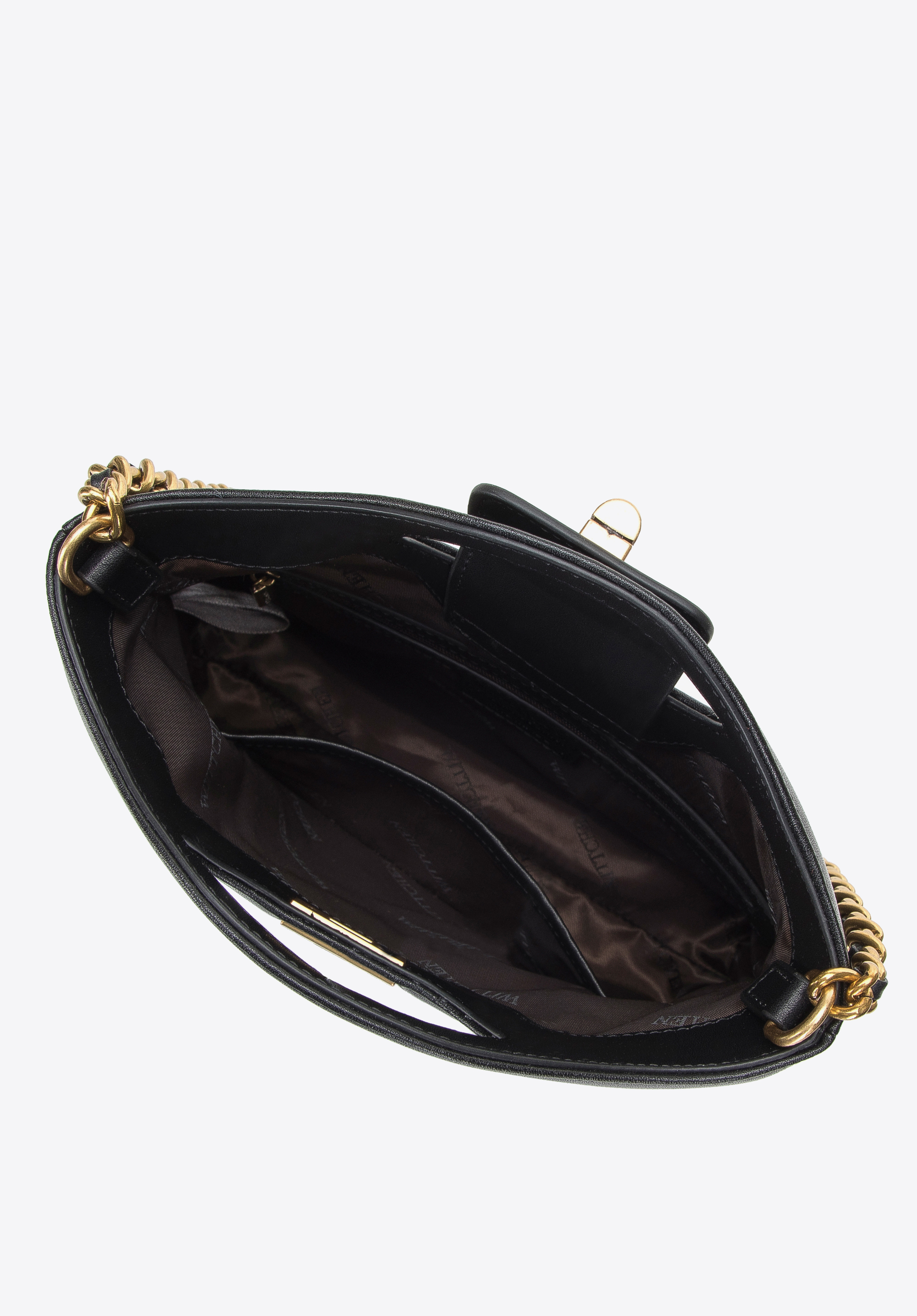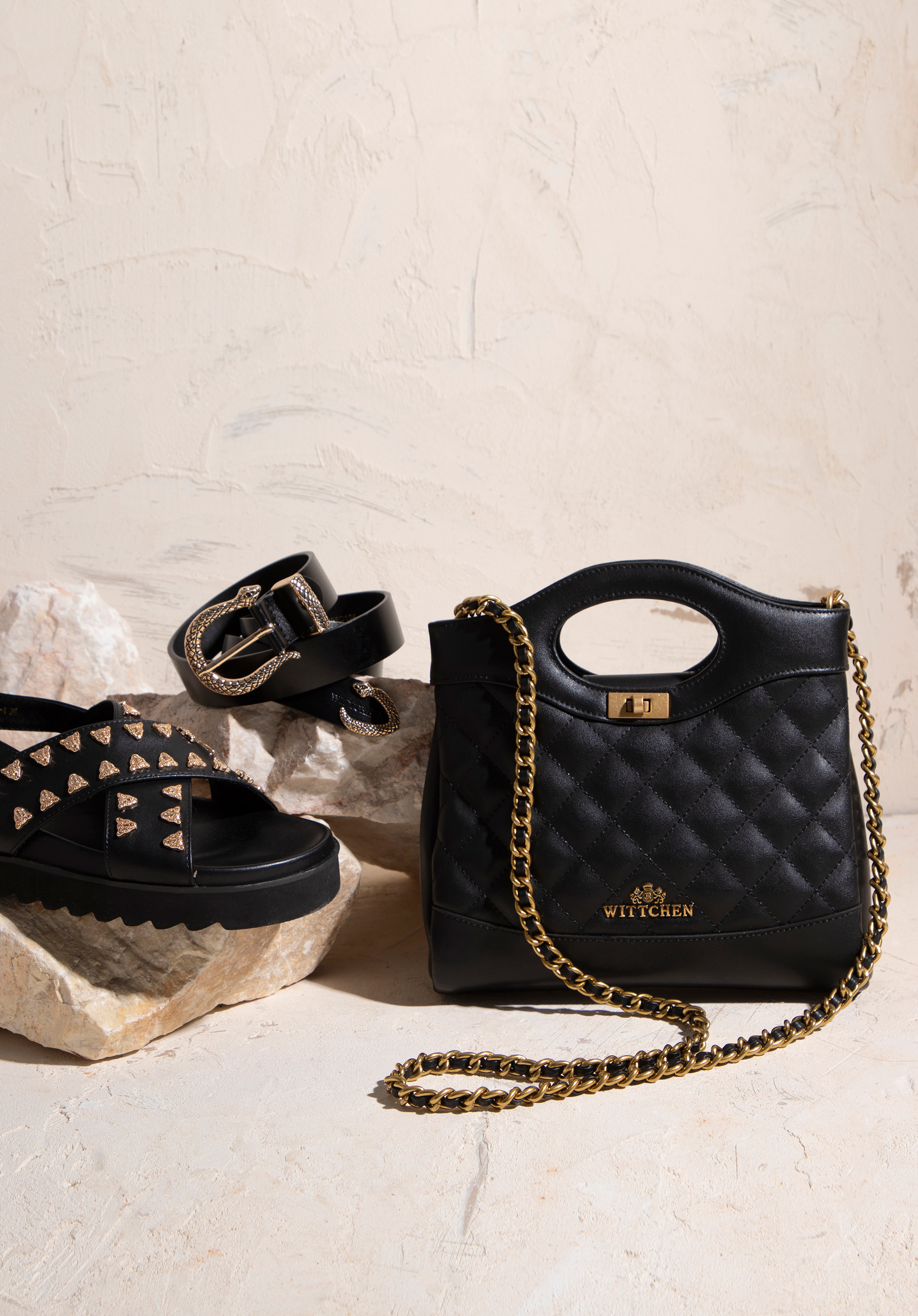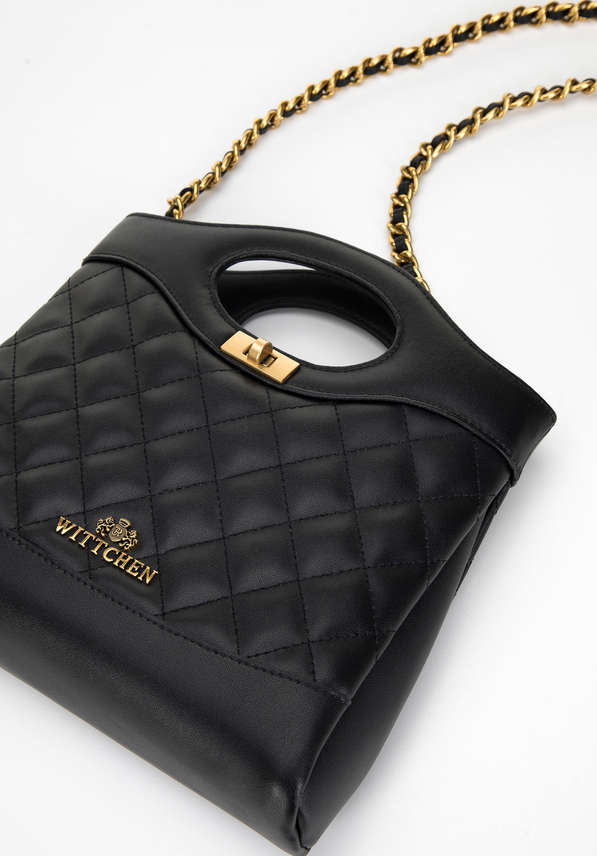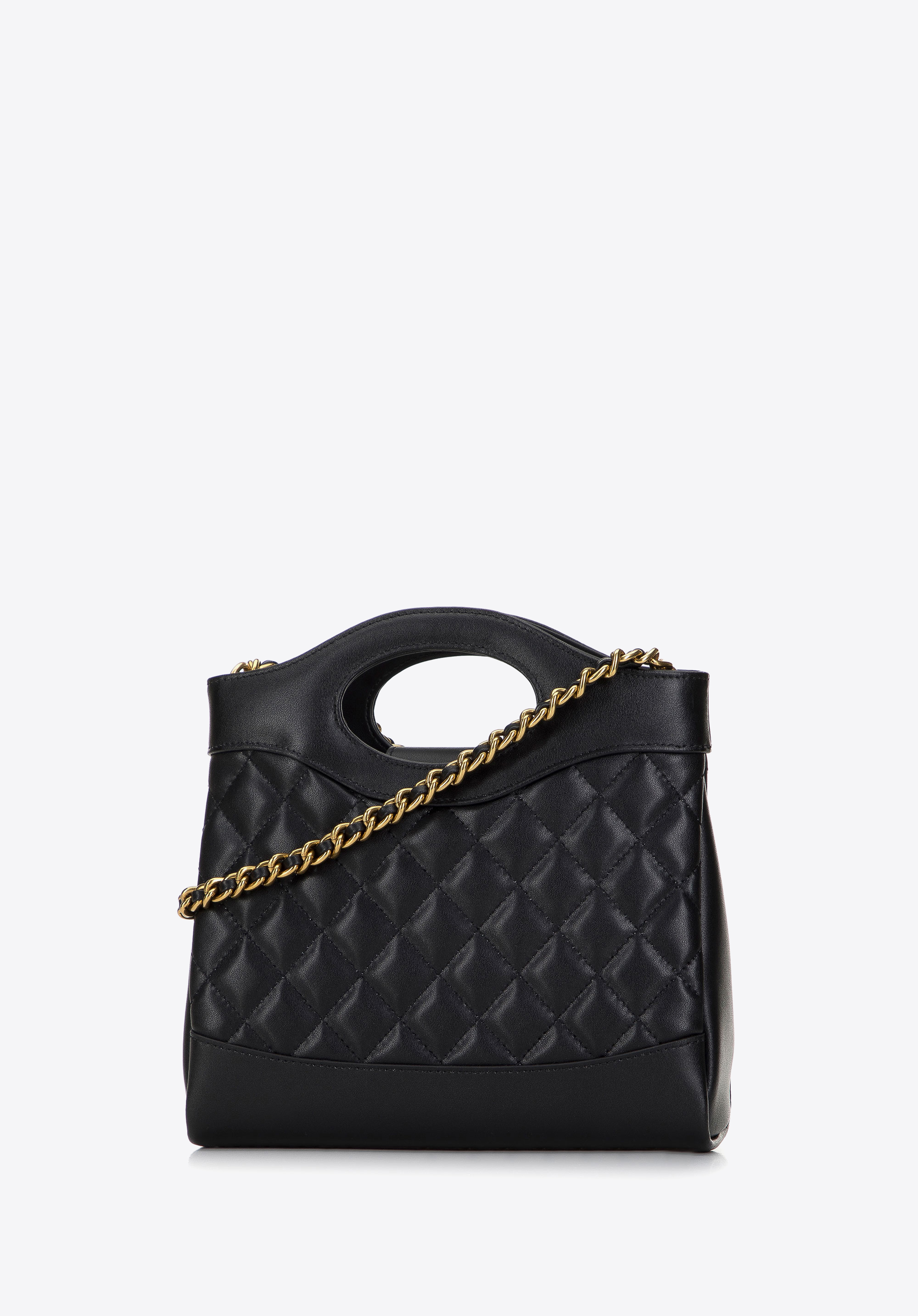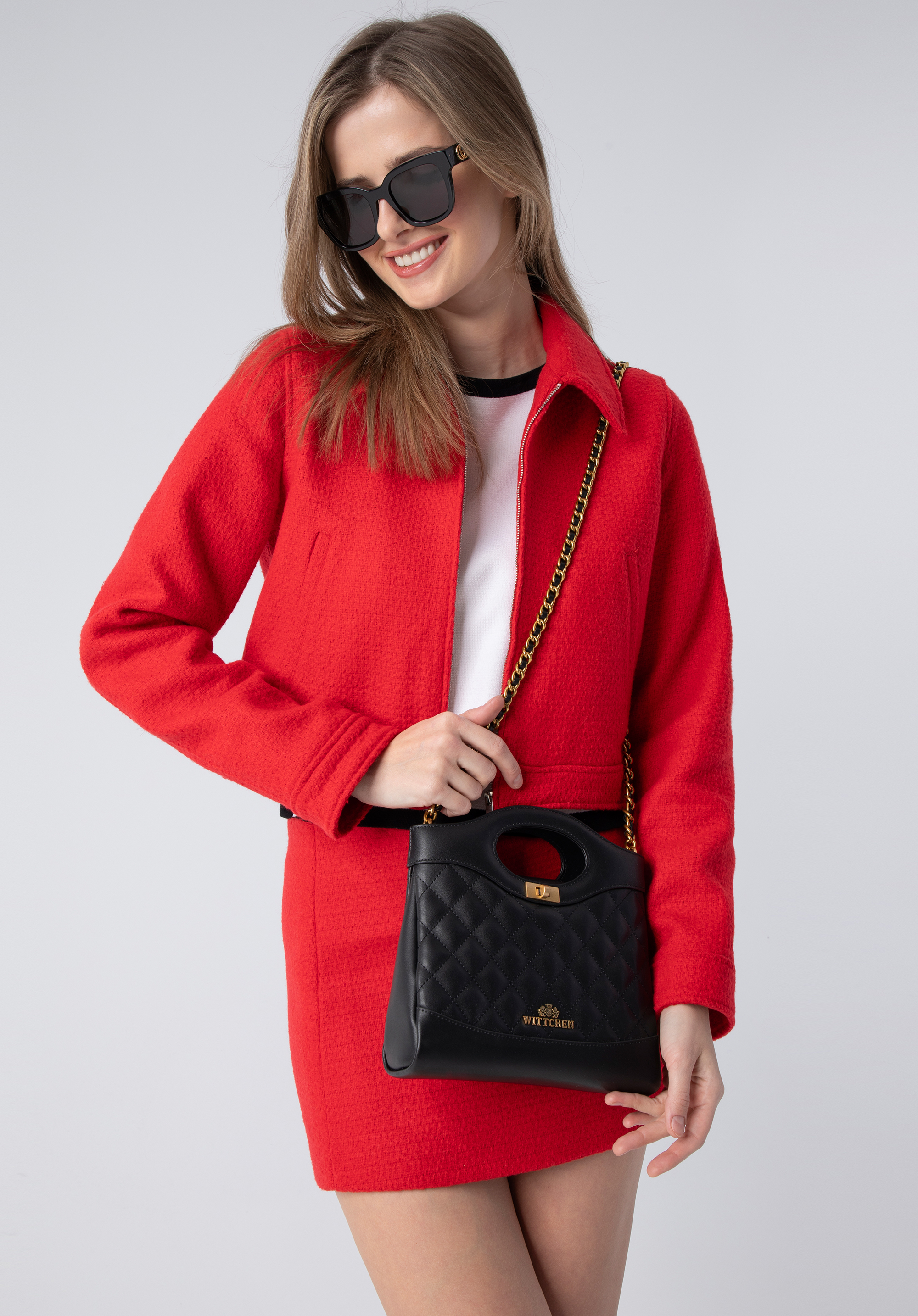 Ця оригінальна сумка на ланцюжку - ретро аксесуар, який варто мати у своєму гардеробі. Вона має жорстку та вузьку конструкцію, тому збереже гарну форму незалежно від наповнення. Виготовлена з високоякісної натуральної шкіри, геометрично стьобана спереду та ззаду. Латунна фурнітура та пряжка надають їй унікального характеру. Її можна носити в руці або повісити на плече на довгому ланцюжку. Чудово виглядатиме з елегантним маленьким чорним платтям, а джинсам і шкіряній косухі додасть жіночності. Шкіряна стьобана міні-сумка на ланцюжку - аксесуар з характером, який приверне багато уваги.