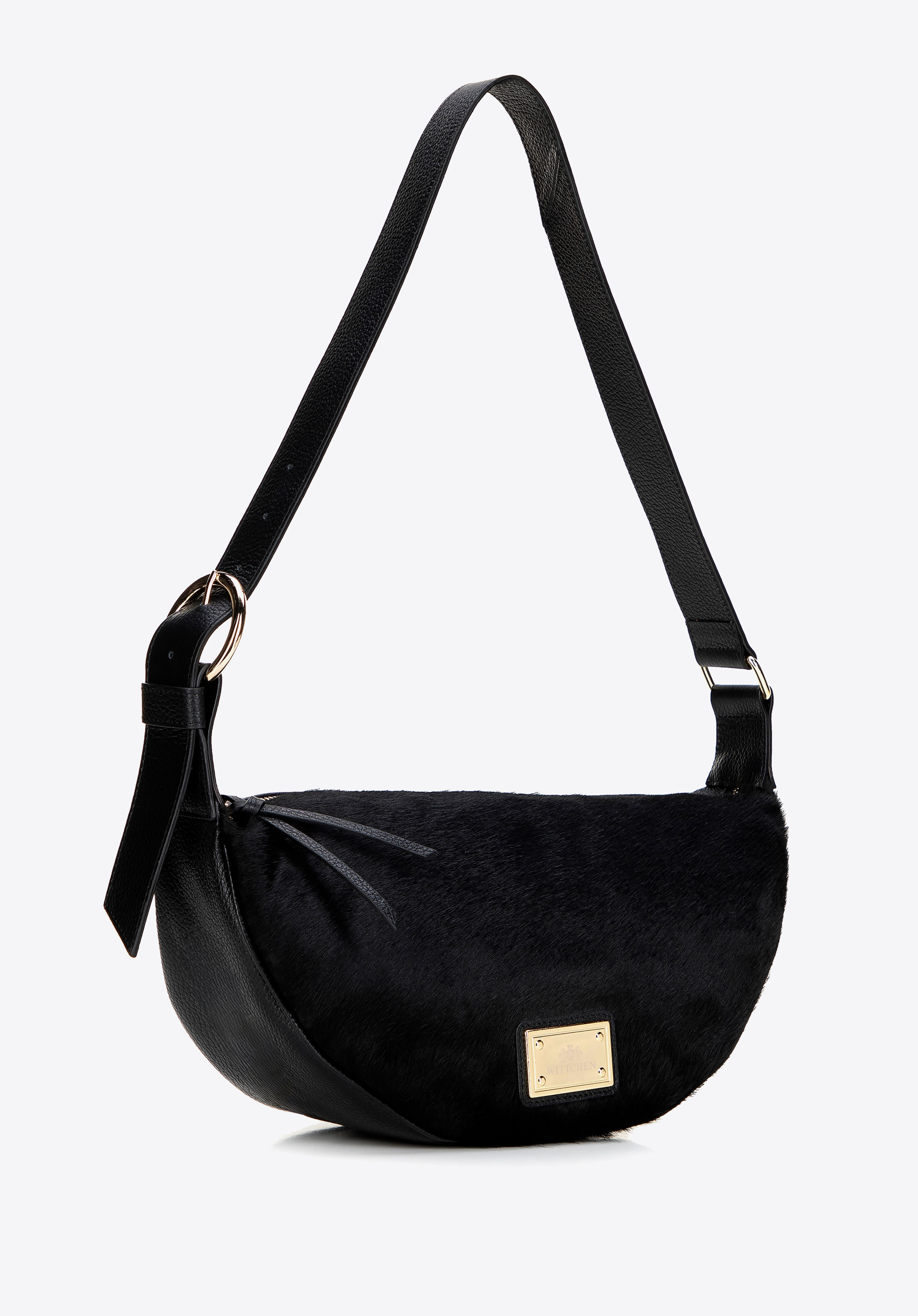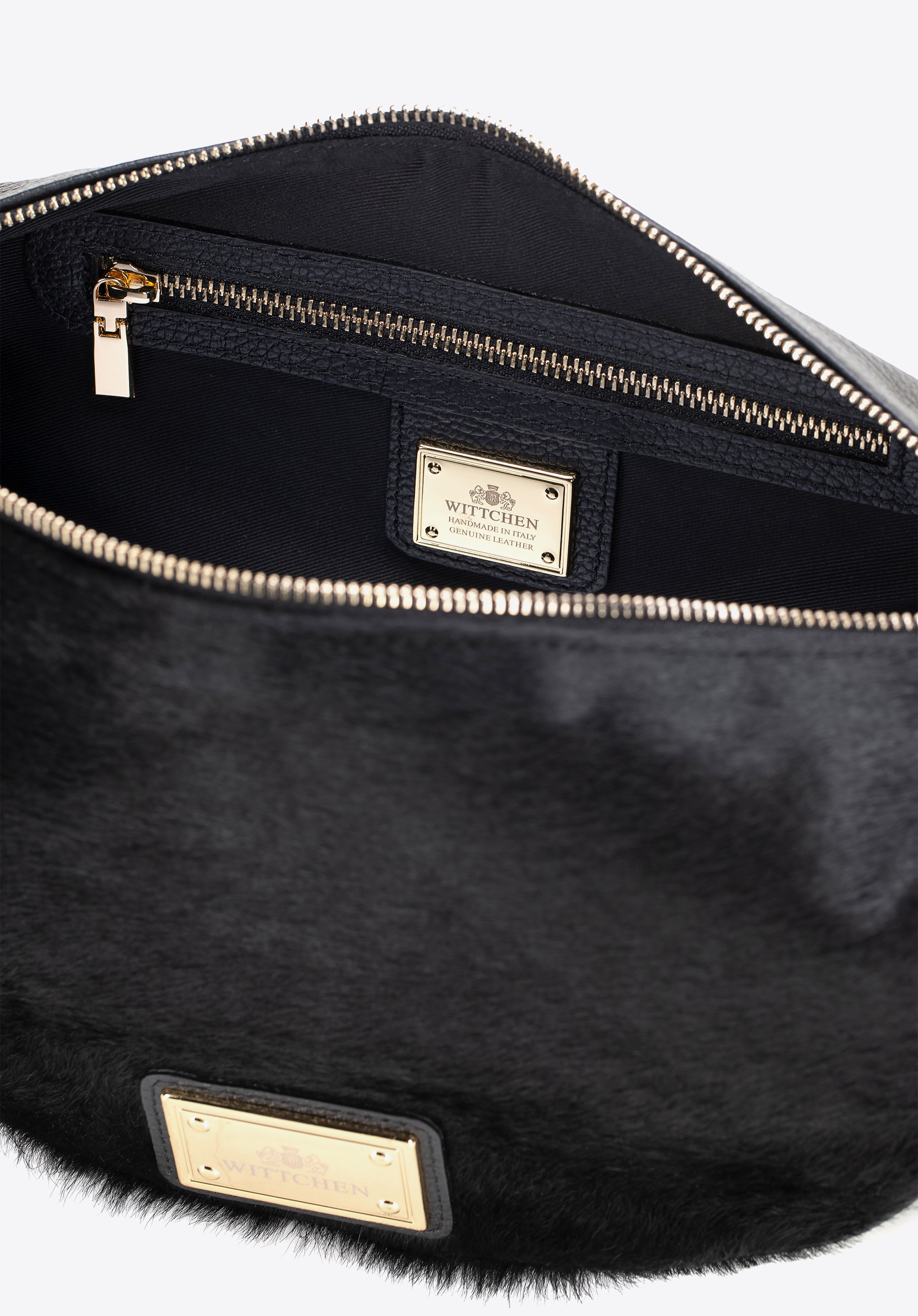 - Матеріал: Натуральна теляча шкіра – м’яка, міцна та елегантна, з волосяним оздобленням передньої панелі для розкішного, самобутнього вигляду.