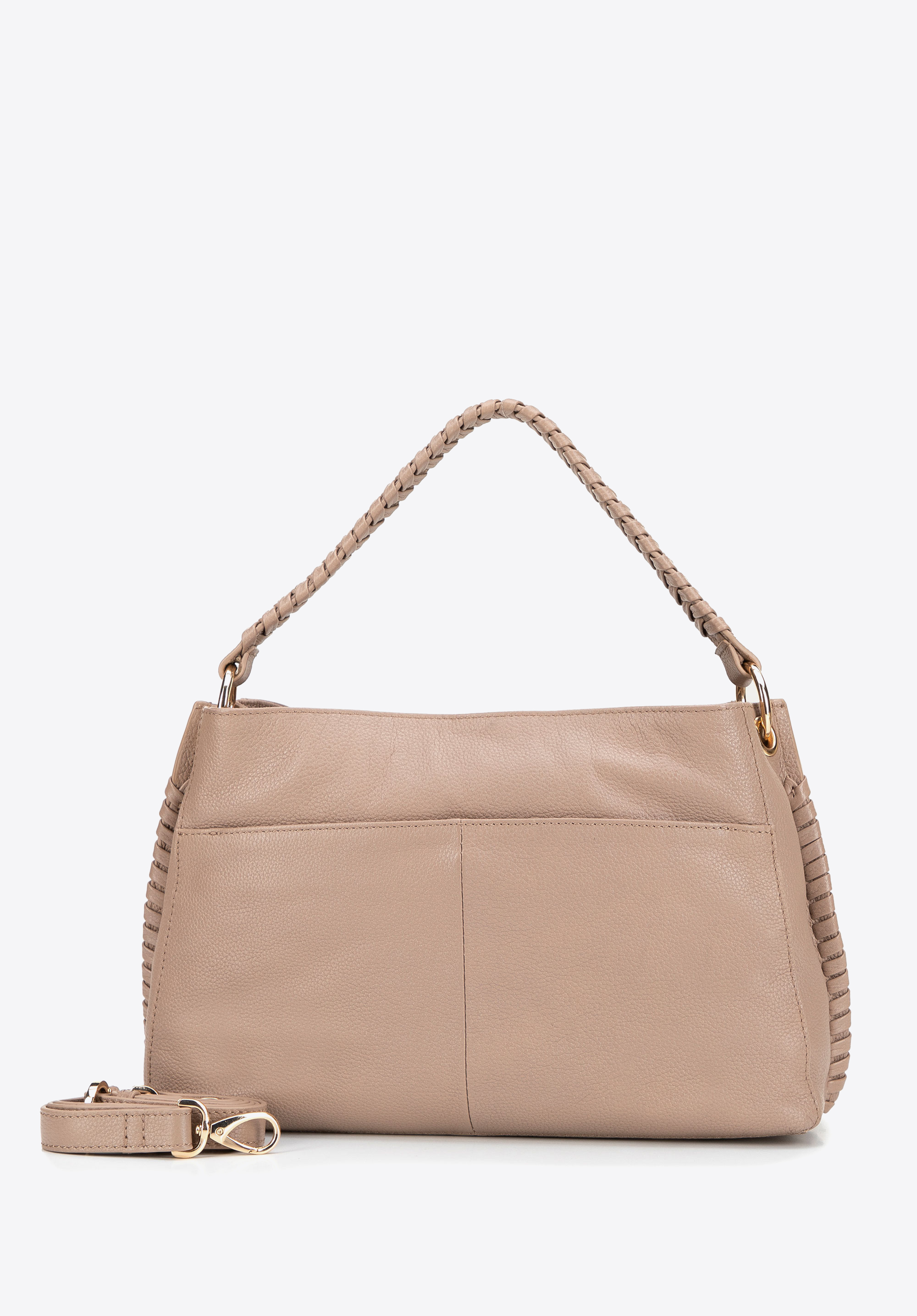 Оберіть аксесуар, який поєднує сучасний дизайн із функціональністю. Ця жіноча сумка з натуральної шкіри вирізняється своєю міцністю та вишуканим оздобленням. Плетена ручка додає характеру, а знімний регульований ремінець дозволяє налаштувати довжину для вашого комфорту. Застібка на блискавку та добре організований інтер'єр – два відділення та три кишені, включаючи одну на блискавці – допоможуть вам зберігати необхідні речі в порядку. Додаткова задня магнітна кишеня забезпечує швидкий доступ до дрібних предметів, а тиснений логотип із фірмовими ручками на блискавці додає вишуканості.