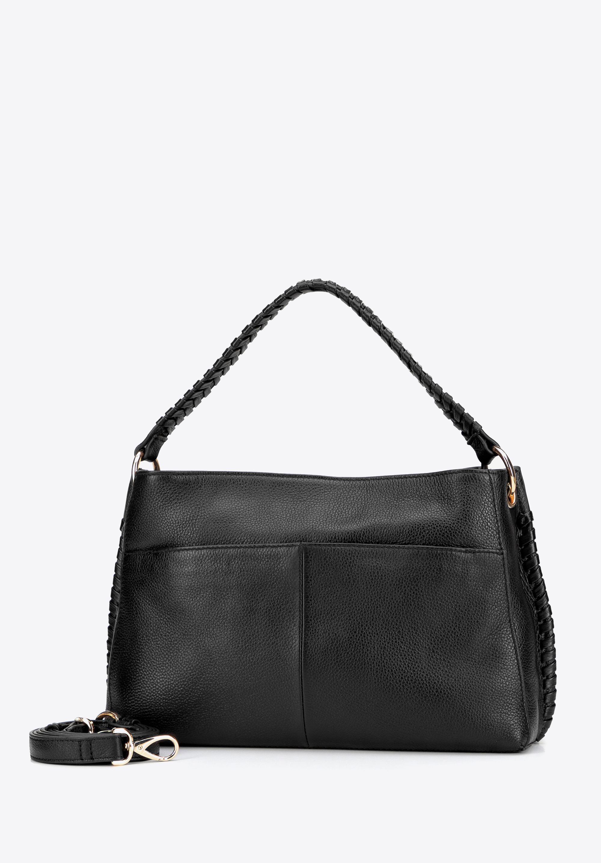 Оберіть аксесуар, який поєднує сучасний дизайн із функціональністю. Ця жіноча сумка з натуральної шкіри вирізняється своєю міцністю та вишуканим оздобленням. Плетена ручка додає характеру, а знімний регульований ремінець дозволяє налаштувати довжину для вашого комфорту. Застібка на блискавку та добре організований інтер'єр – два відділення та три кишені, включаючи одну на блискавці – допоможуть вам зберігати необхідні речі в порядку. Додаткова задня магнітна кишеня забезпечує швидкий доступ до дрібних предметів, а тиснений логотип із фірмовими ручками на блискавці додає вишуканості.