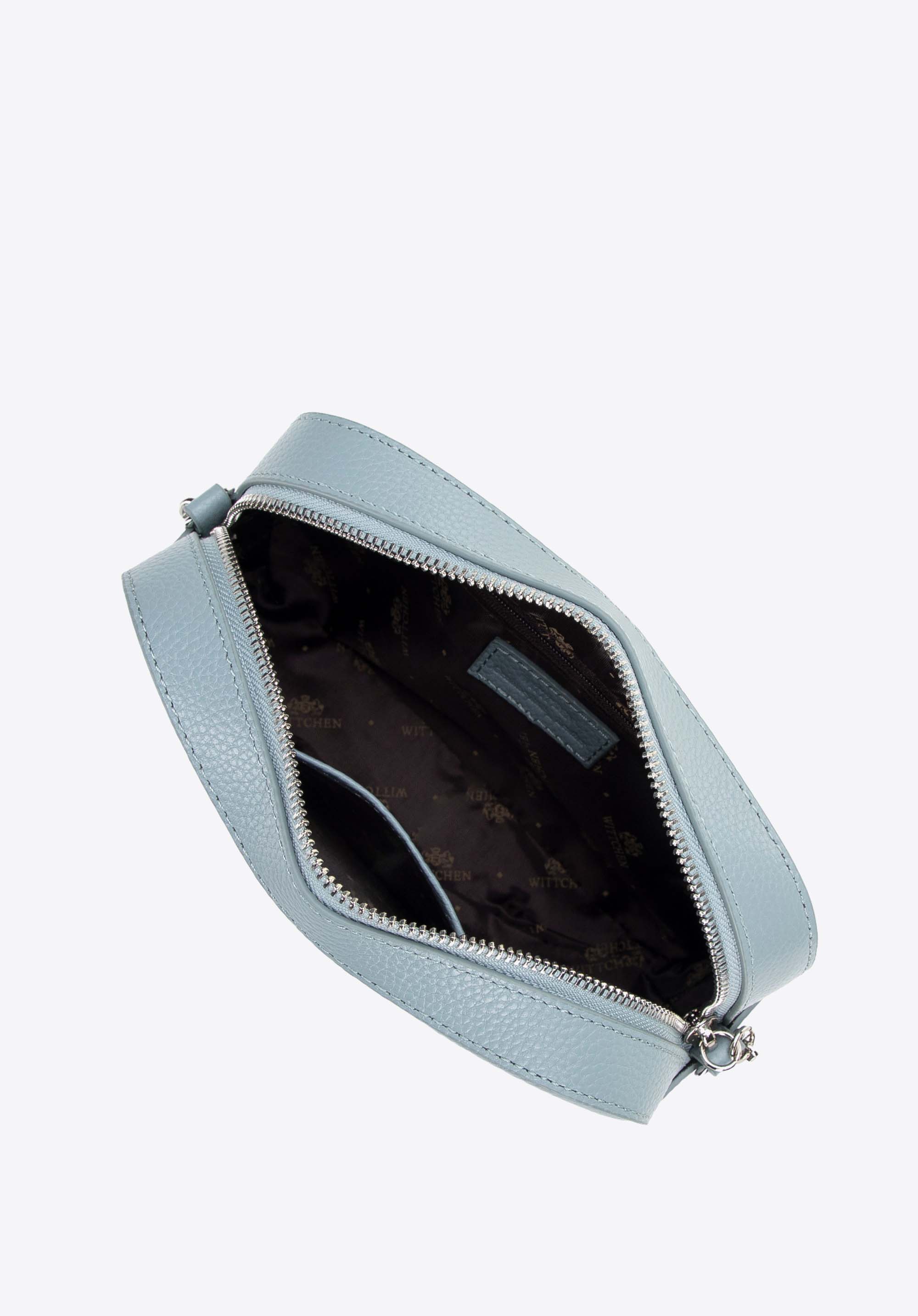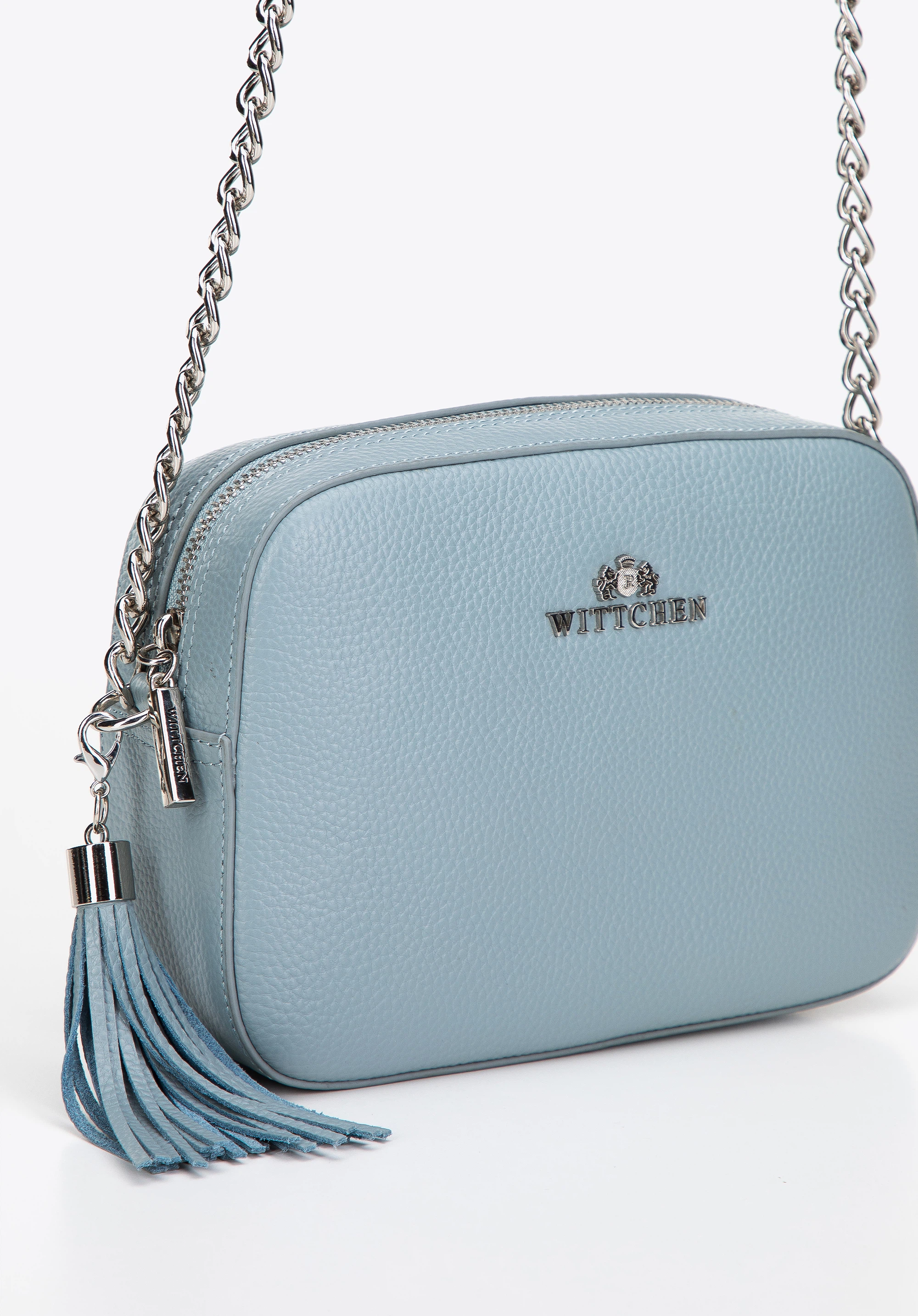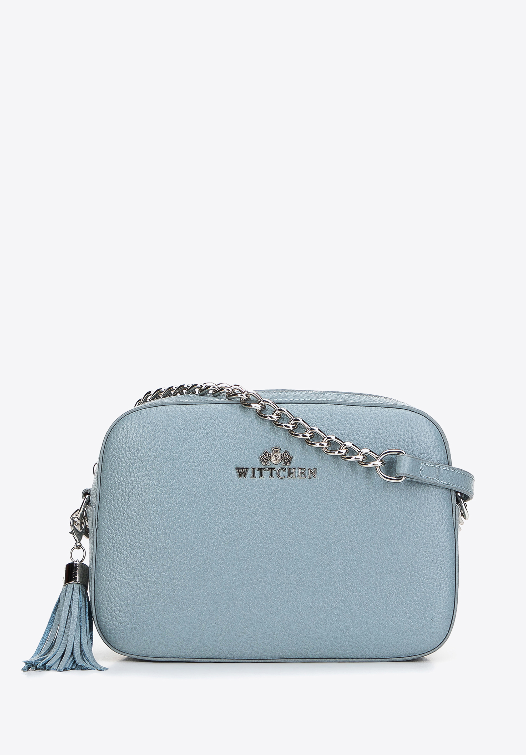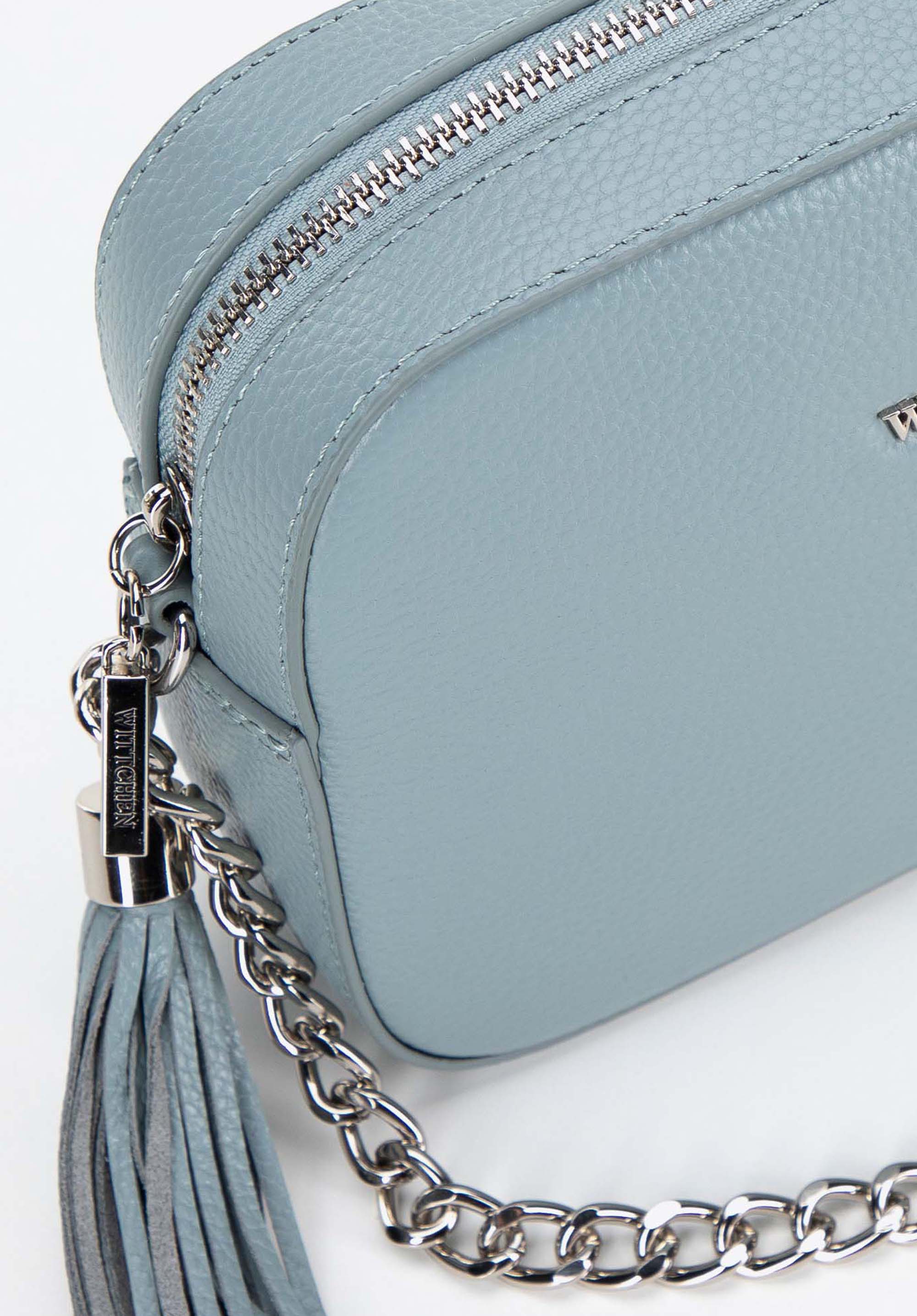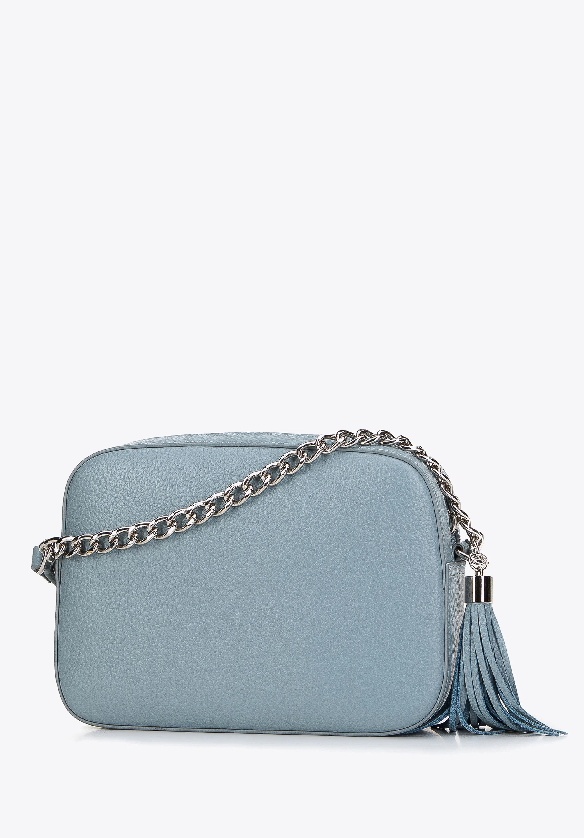 Шкіряна жіноча сумка через плече на ланцюжку світло-блакитна