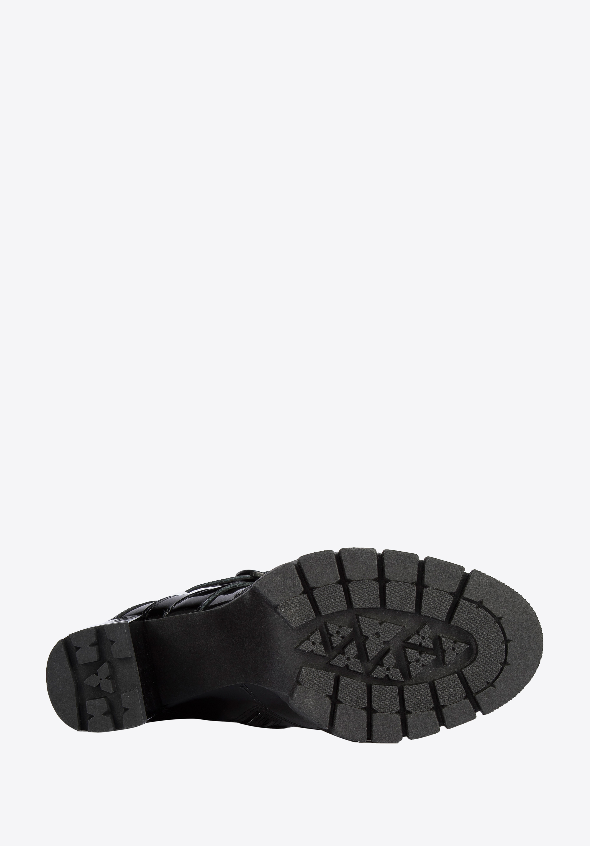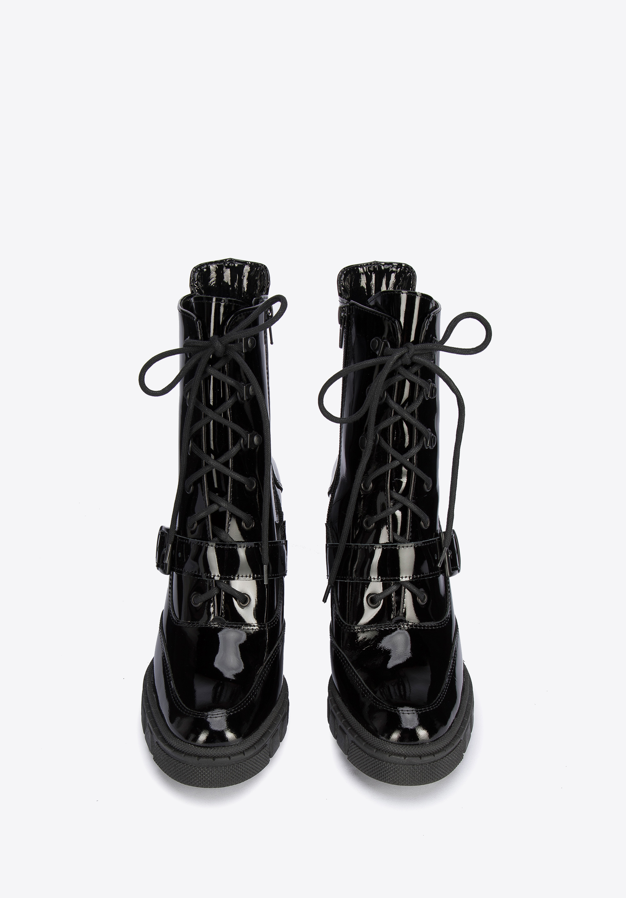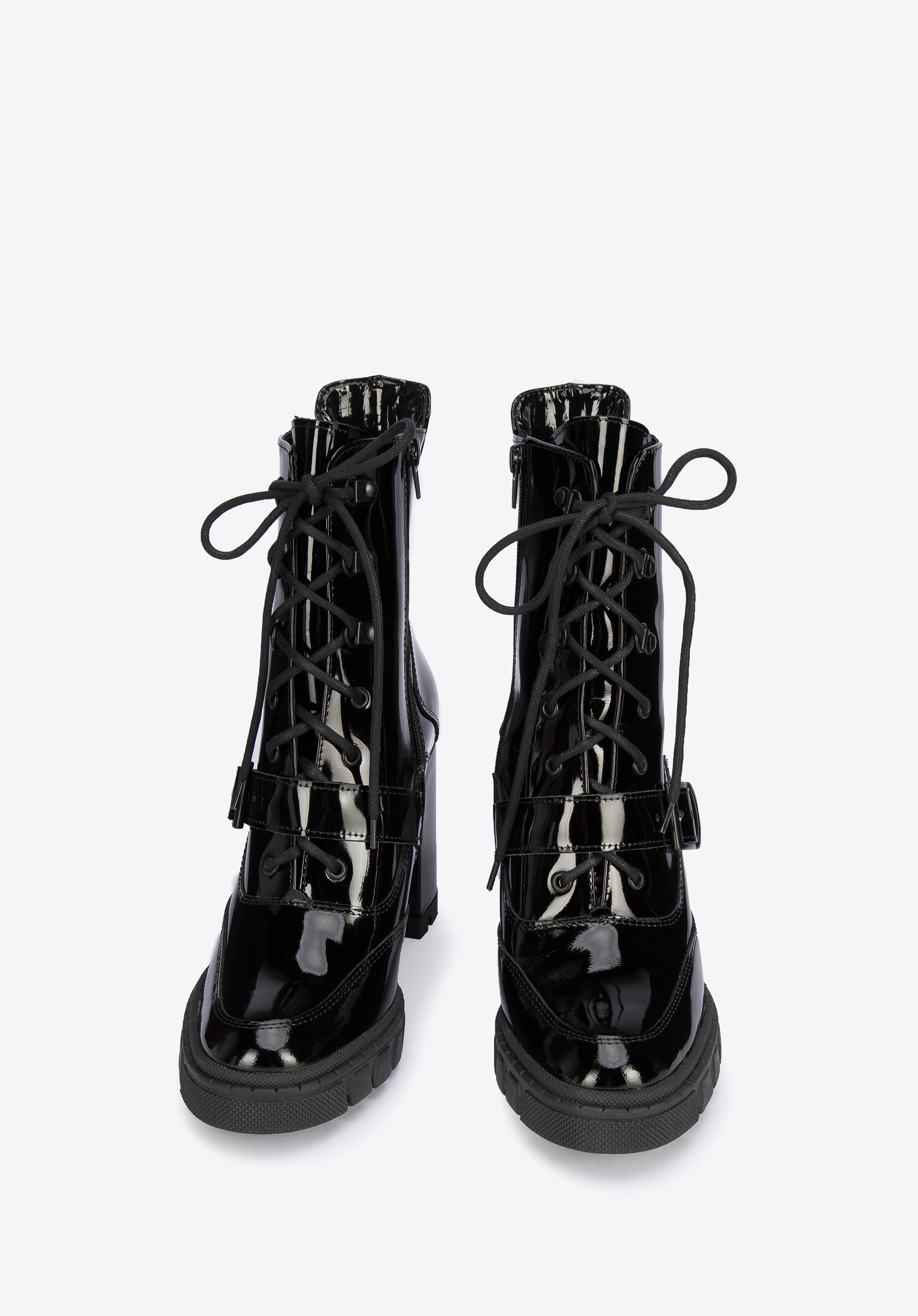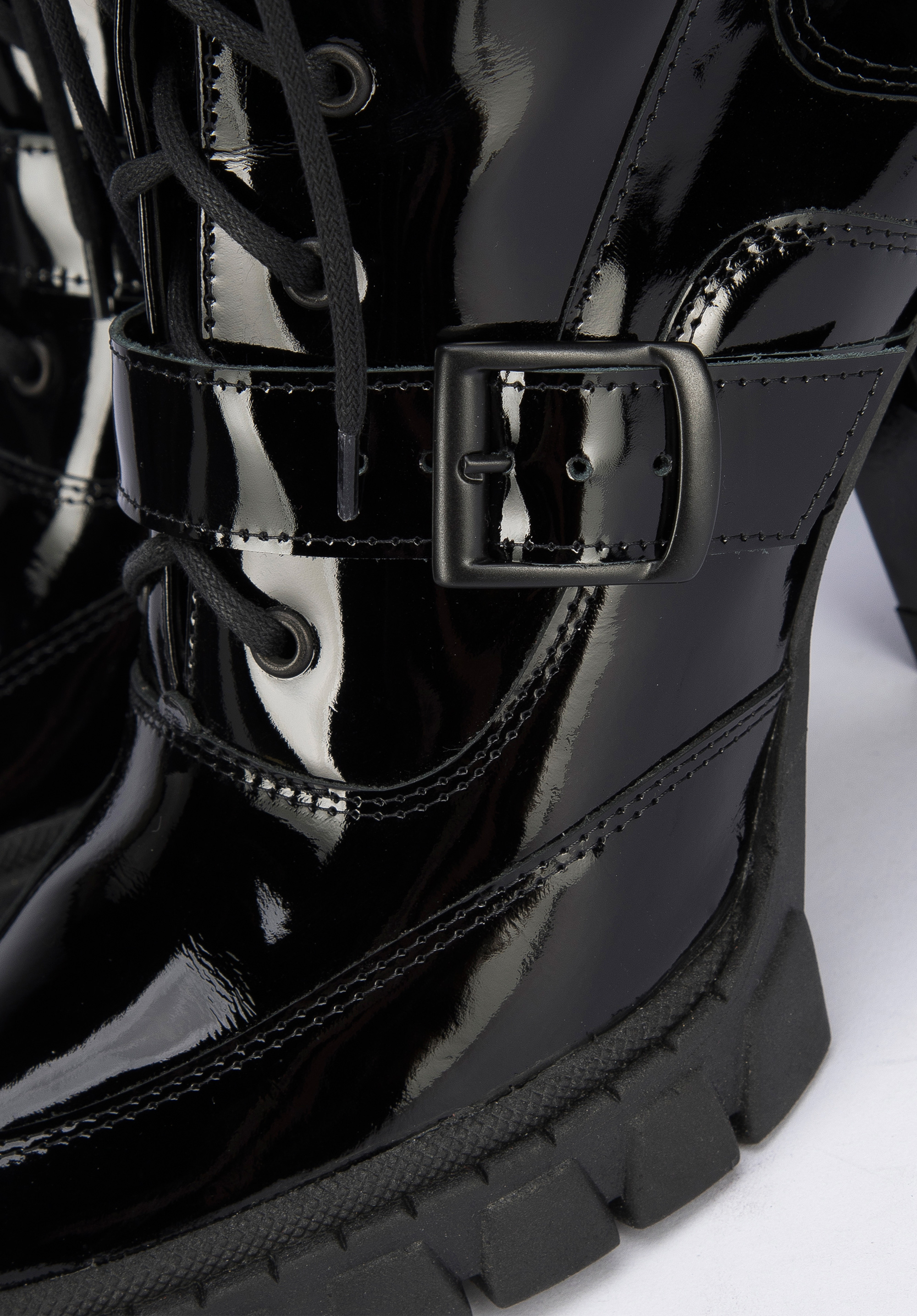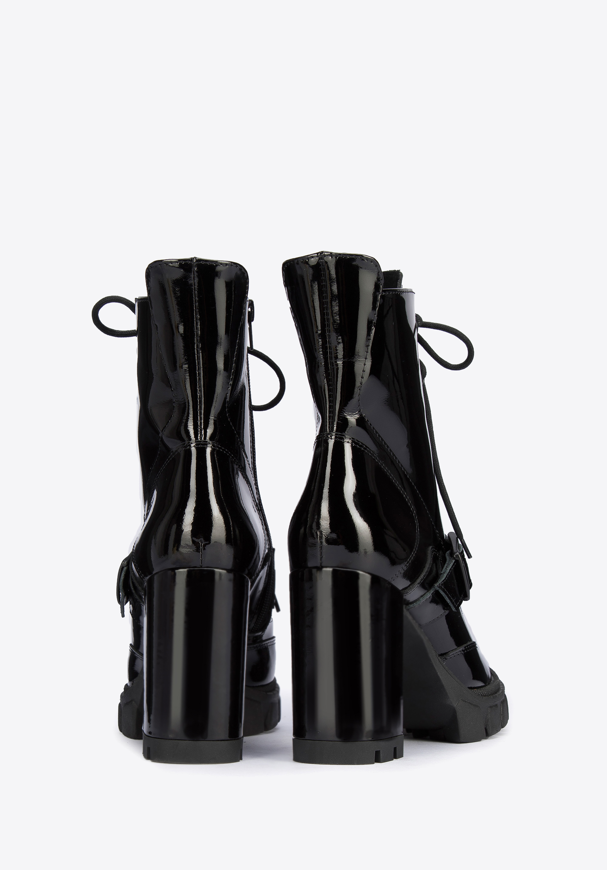 Характерне взуття для жінки, яка любить привертати увагу. Вони виготовлені з високоякісної натуральної шкіри, тому прослужать вам багато сезонів. Каблук, оброблений лакованою шкірою, забезпечить комфортну ходьбу і додасть кілька сантиметрів росту. Декоративна задня частина взуття та пряжка на поясі стильно підкреслюють все. Вони чудово виглядатимуть як з приталеними джинсами, так і з короткою сукнею – стильно доповнять ваш наряд у будь-якій ситуації. Шкіряні чоботи з пряжкою на підборах - доповнення з характером для кожної сучасної жінки.