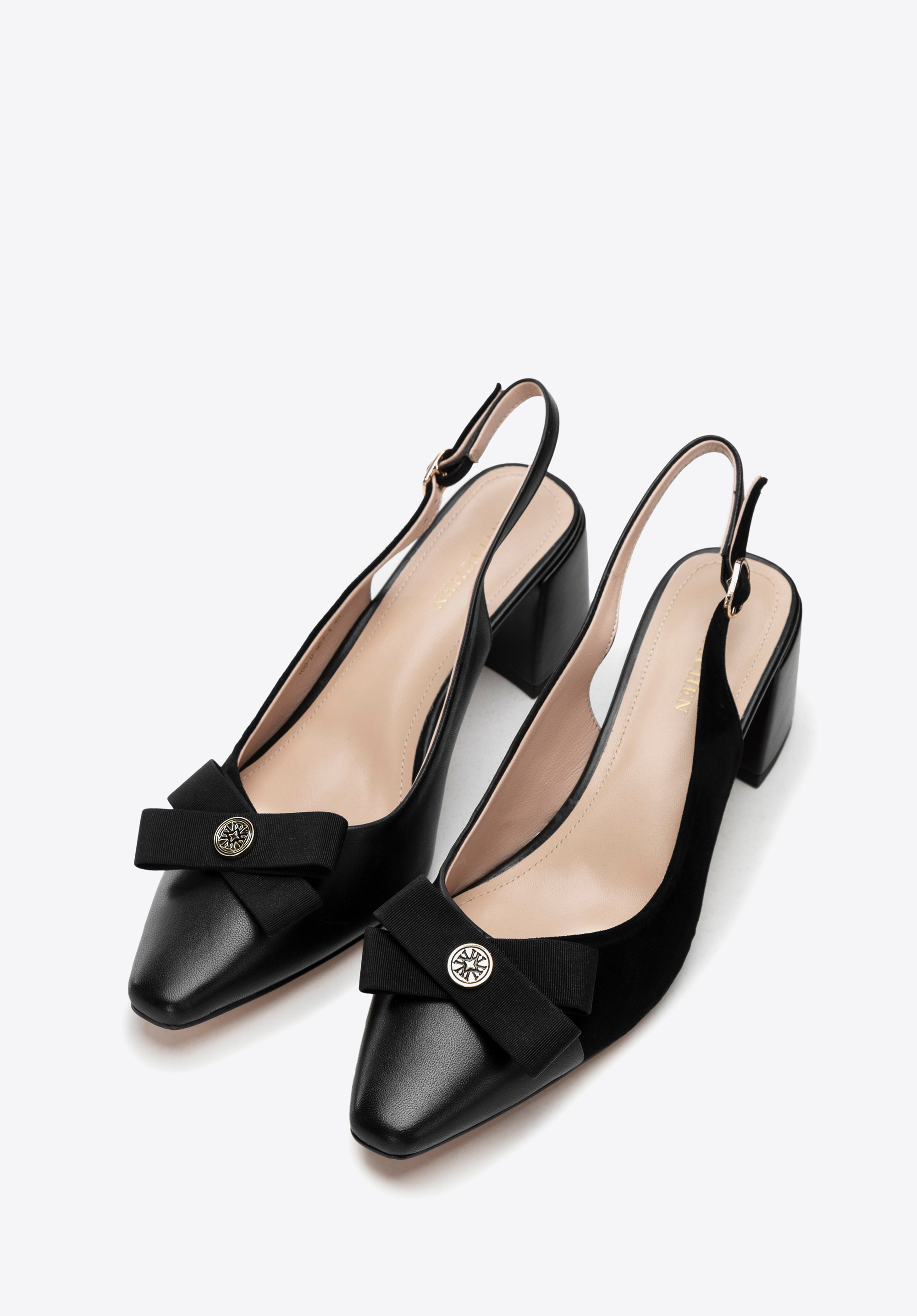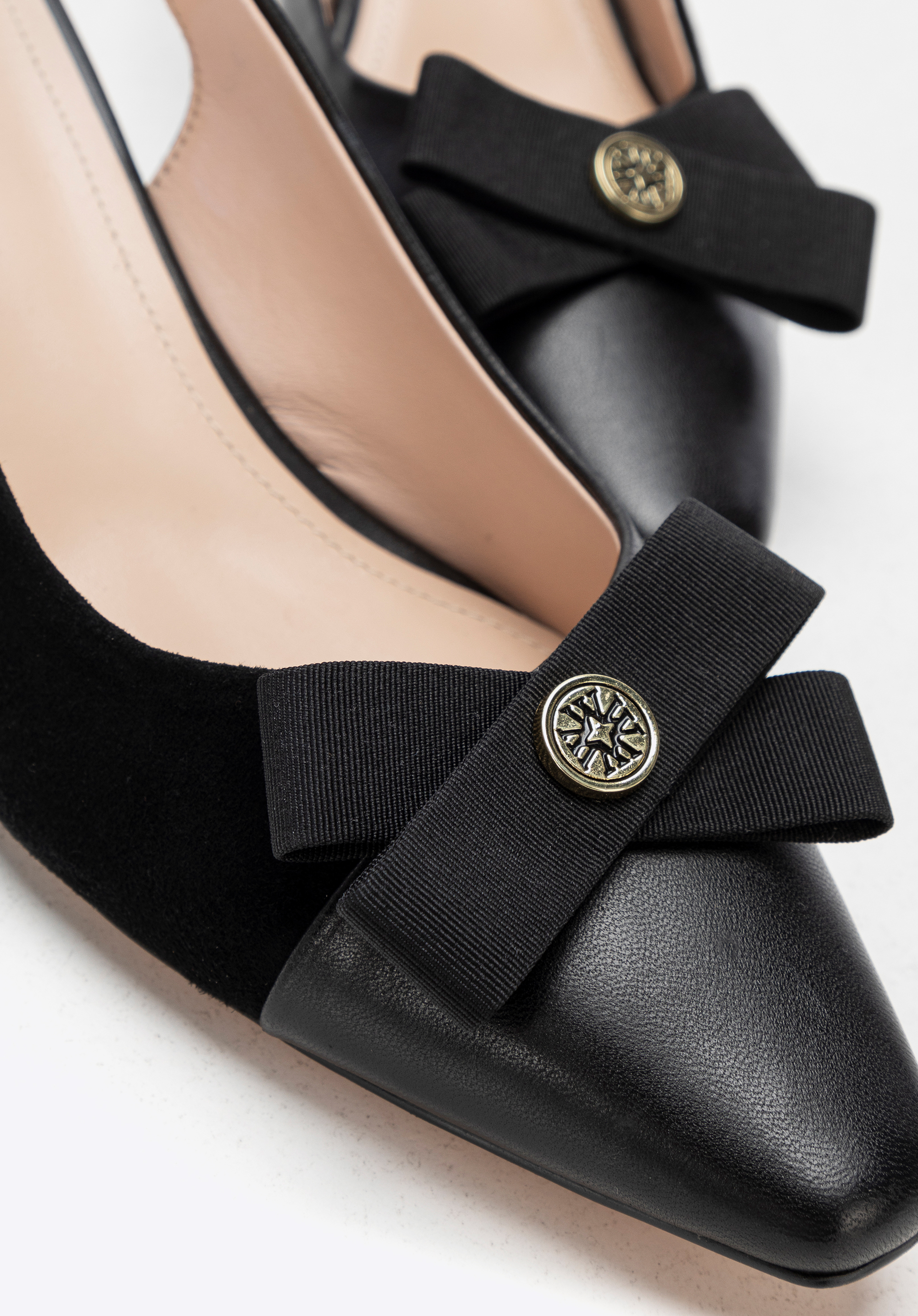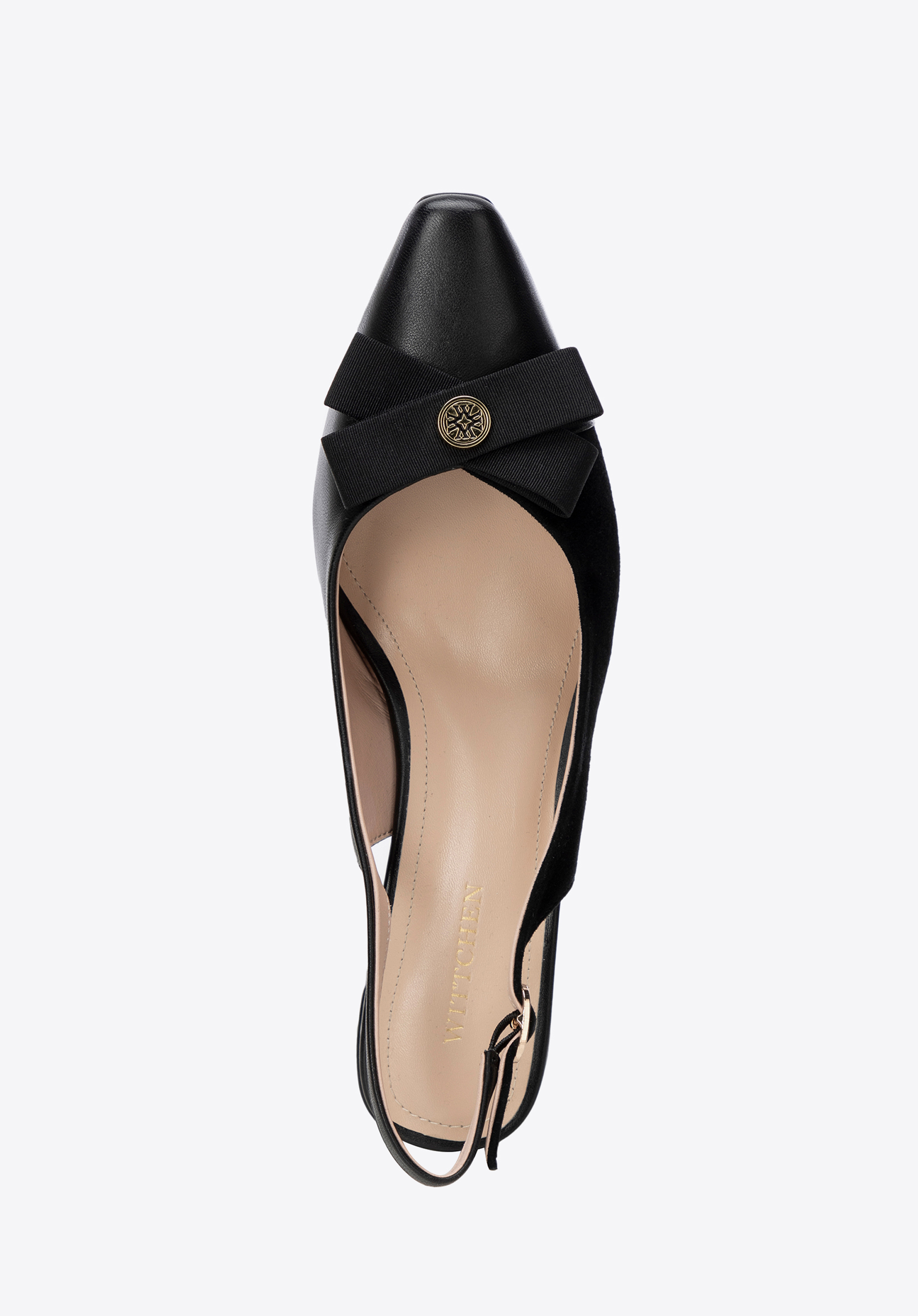Туфлі з натуральної шкіри - ідеальне поєднання класичного стилю та сучасної вишуканості. Тонкий гострий носок і каблук забезпечують елегантність і комфорт протягом усього дня. Витончене поєднання матової та лакованої шкіри надає взуття неповторного характеру, а декоративний бант і золотий логотип виробника додають розкішний акцент. Крім того, відкрита п’ята та ремінець із декоративною пряжкою вносять сміливу, але ледь помітну нотку сучасності.