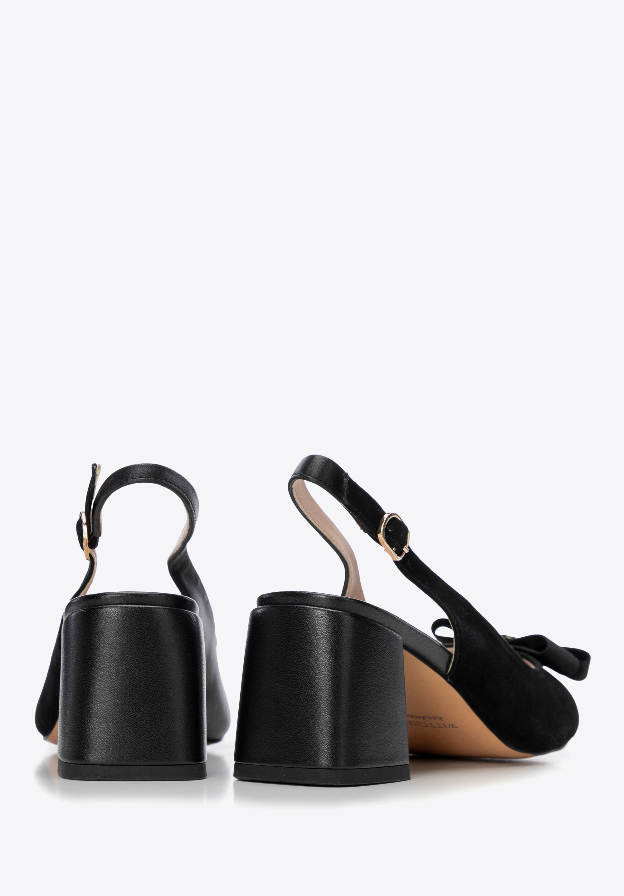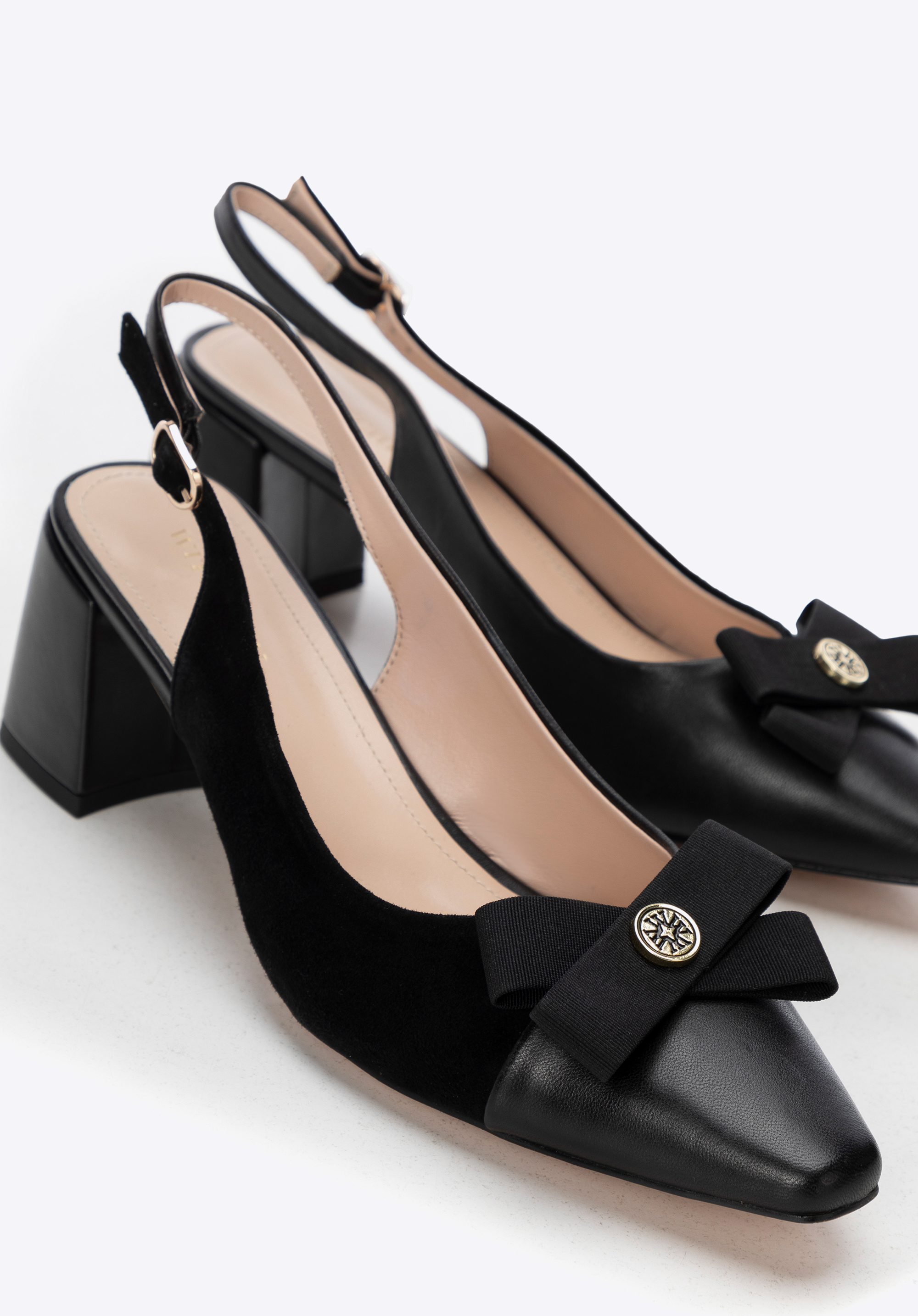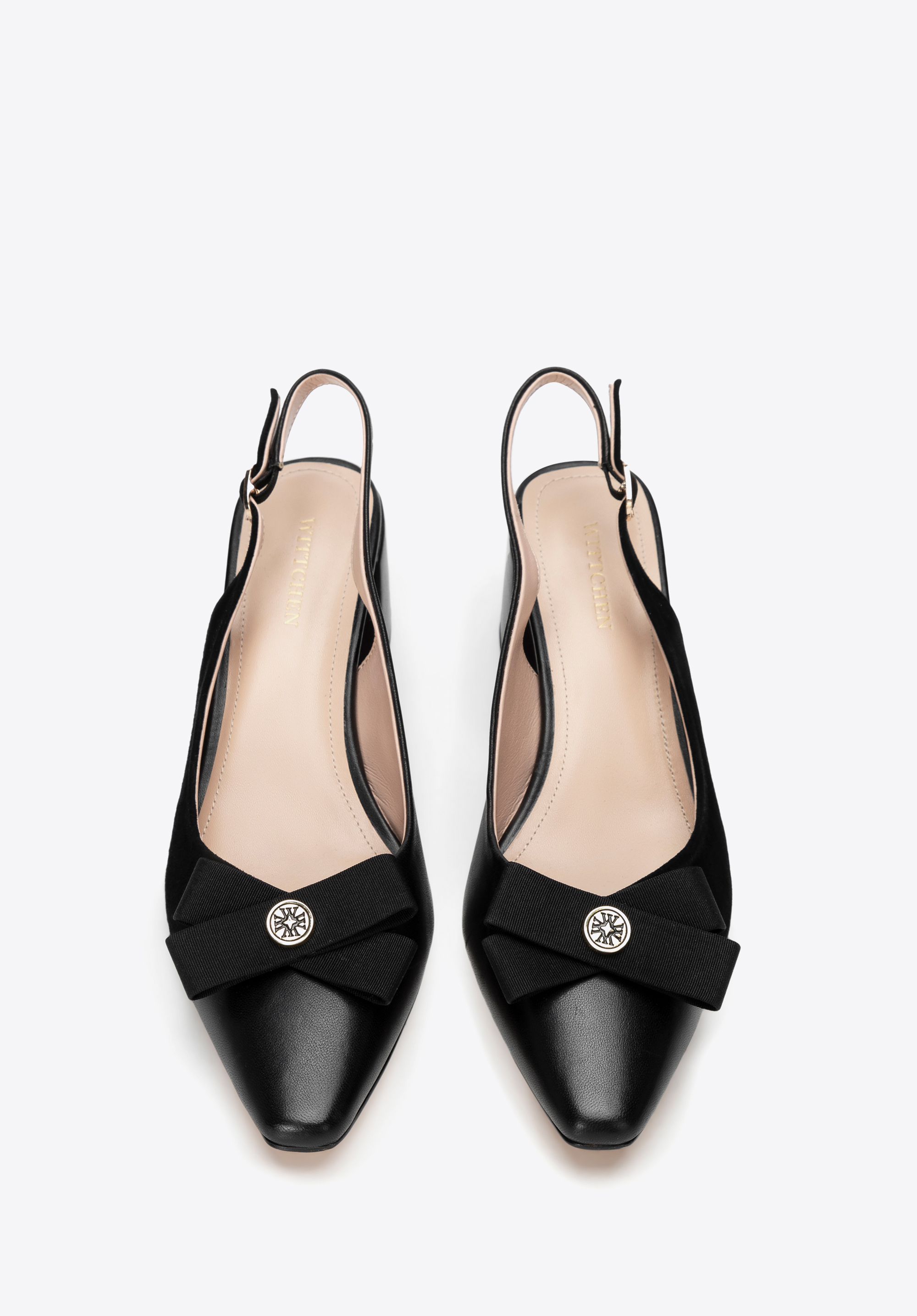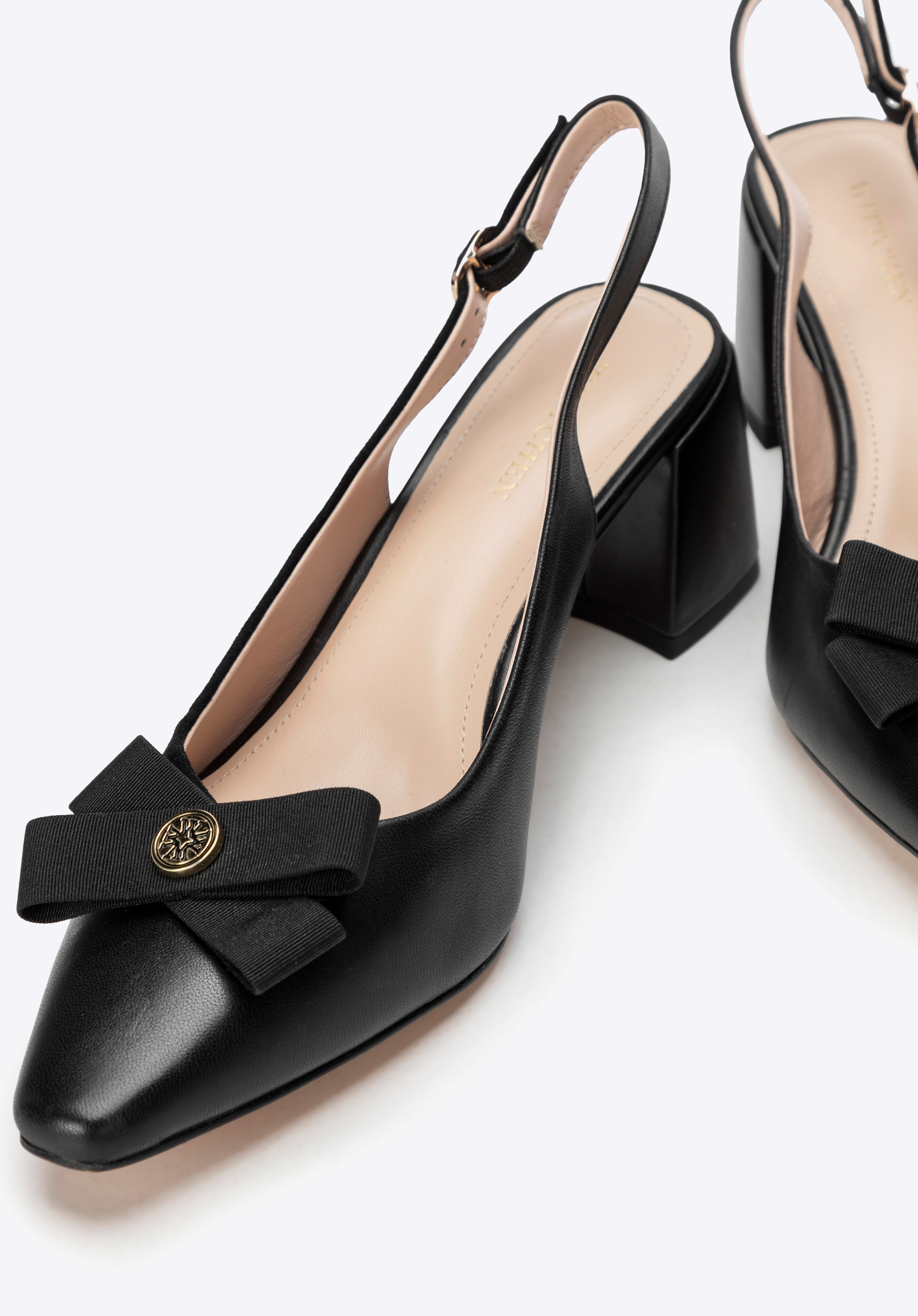 Туфлі з натуральної шкіри - ідеальне поєднання класичного стилю та сучасної вишуканості. Тонкий гострий носок і каблук забезпечують елегантність і комфорт протягом усього дня. Витончене поєднання матової та лакованої шкіри надає взуття неповторного характеру, а декоративний бант і золотий логотип виробника додають розкішний акцент. Крім того, відкрита п’ята та ремінець із декоративною пряжкою вносять сміливу, але ледь помітну нотку сучасності.