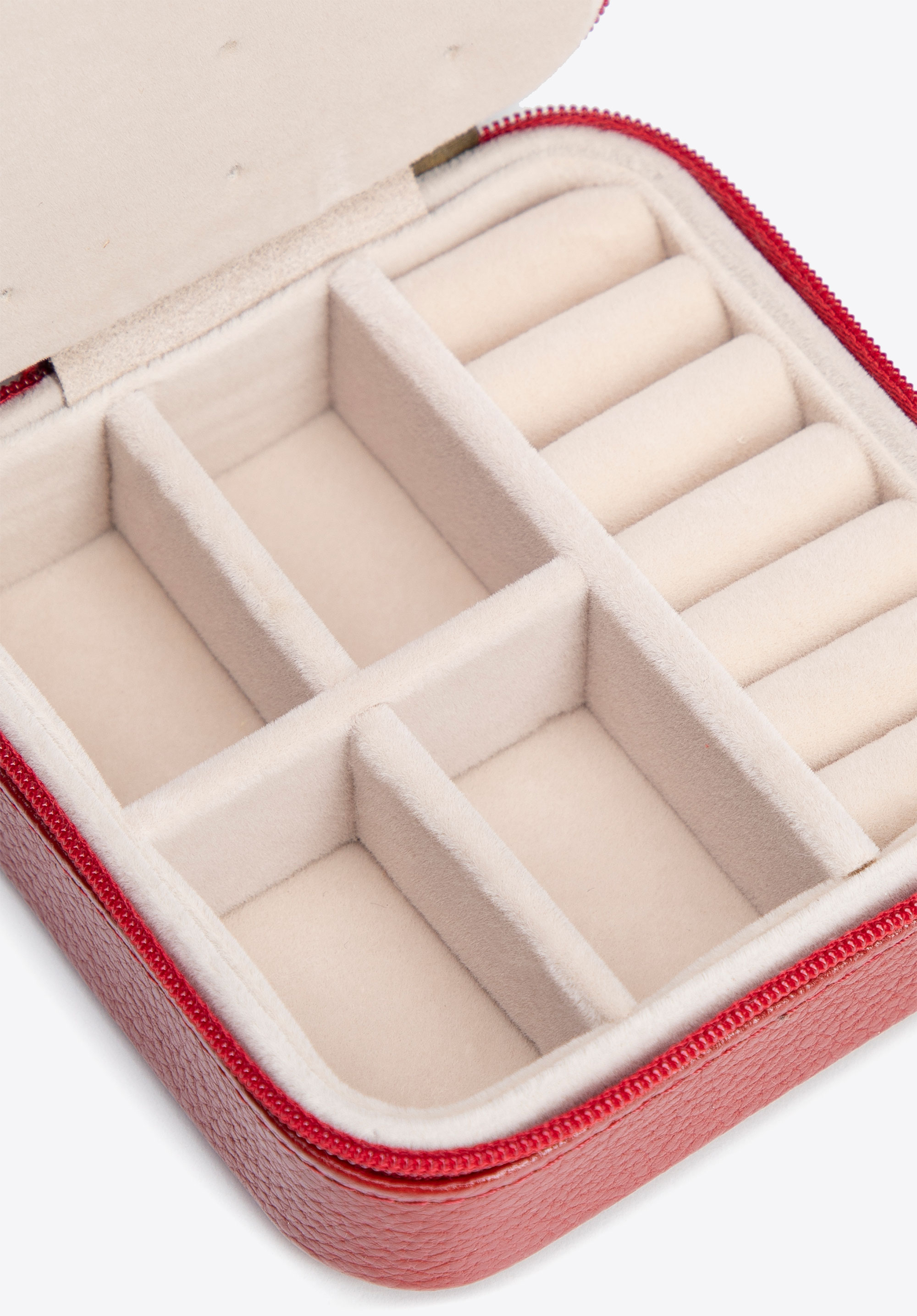 Зберігайте свої прикраси ідеально організованими та безпечними в будь-який час. Цей елегантний футляр з колекції Italy , виготовлений з натуральної шкіри з рифленою текстурою , захоплює не лише своїм зовнішнім виглядом, але й практичністю. Компактну скриньку , що застібається на міцну блискавку, легко упакувати для подорожей або акуратно зберігати в шухляді. Внутрішня частина, підкладена м’яким легким велюром , захищає ваші прикраси від подряпин, а продумане планування забезпечує швидкий доступ до ваших улюблених прикрас: 4 компактні відділення для ланцюжків, сережок та витончених браслетів, а також 6 спеціальних відділень для кілець, призначених для надійного кріплення кожної каблучки.