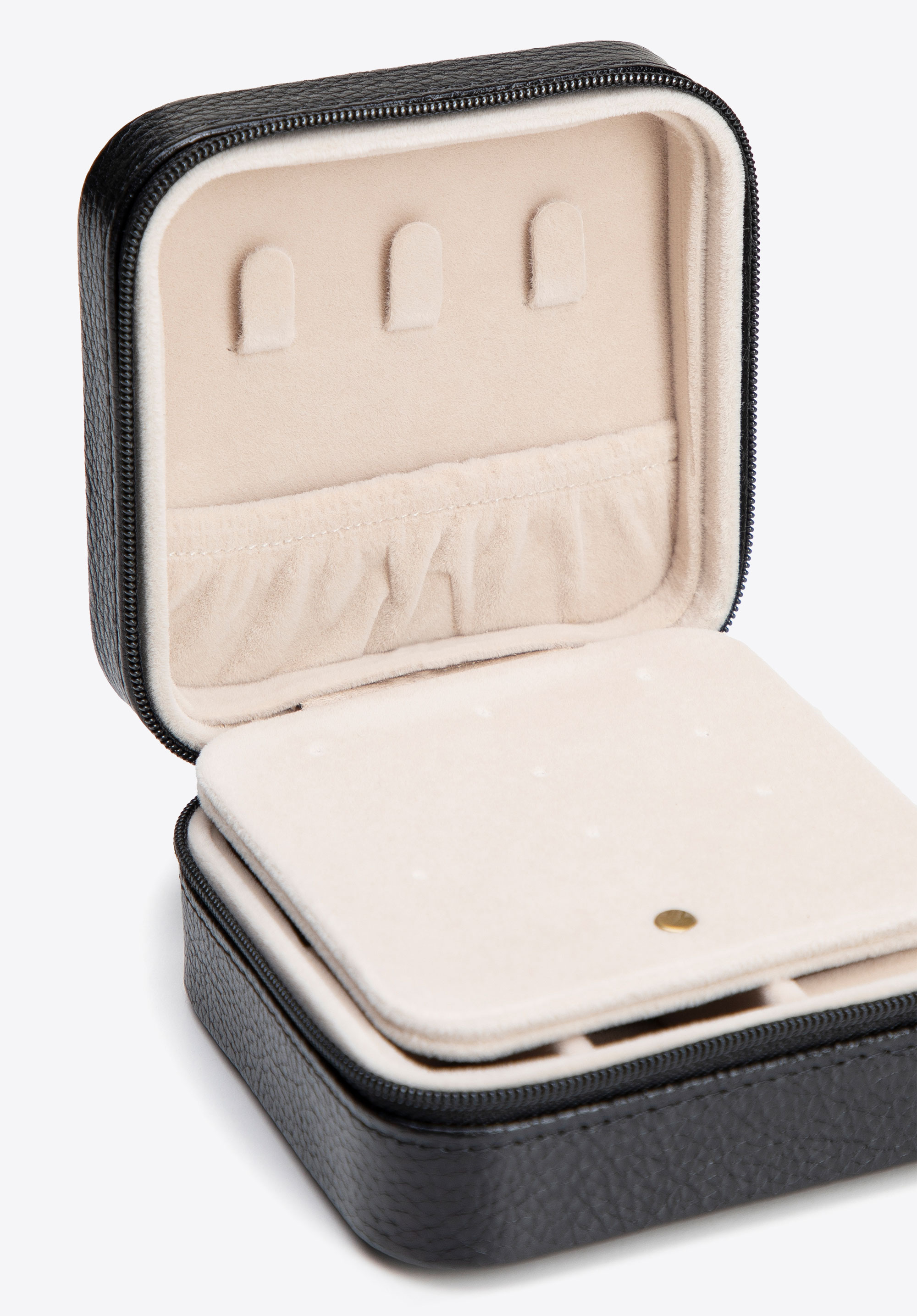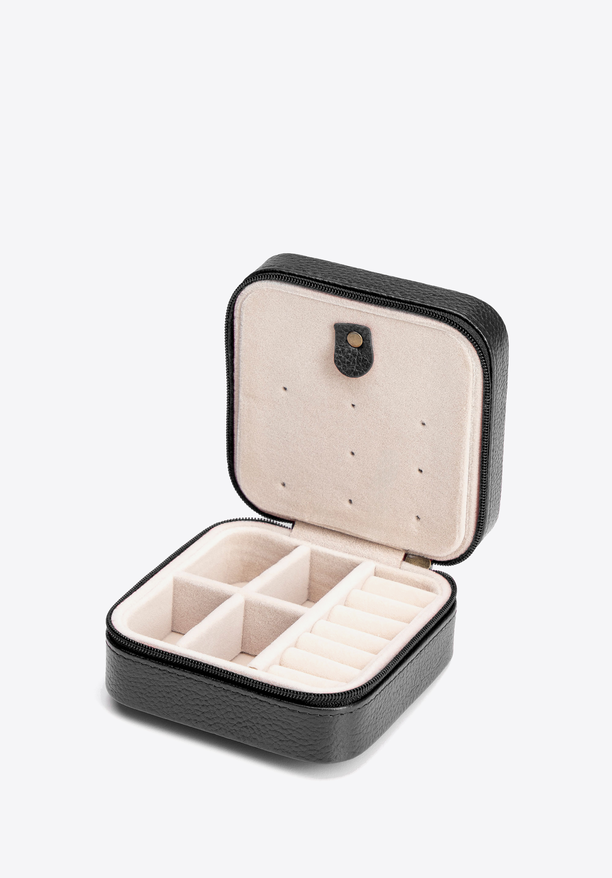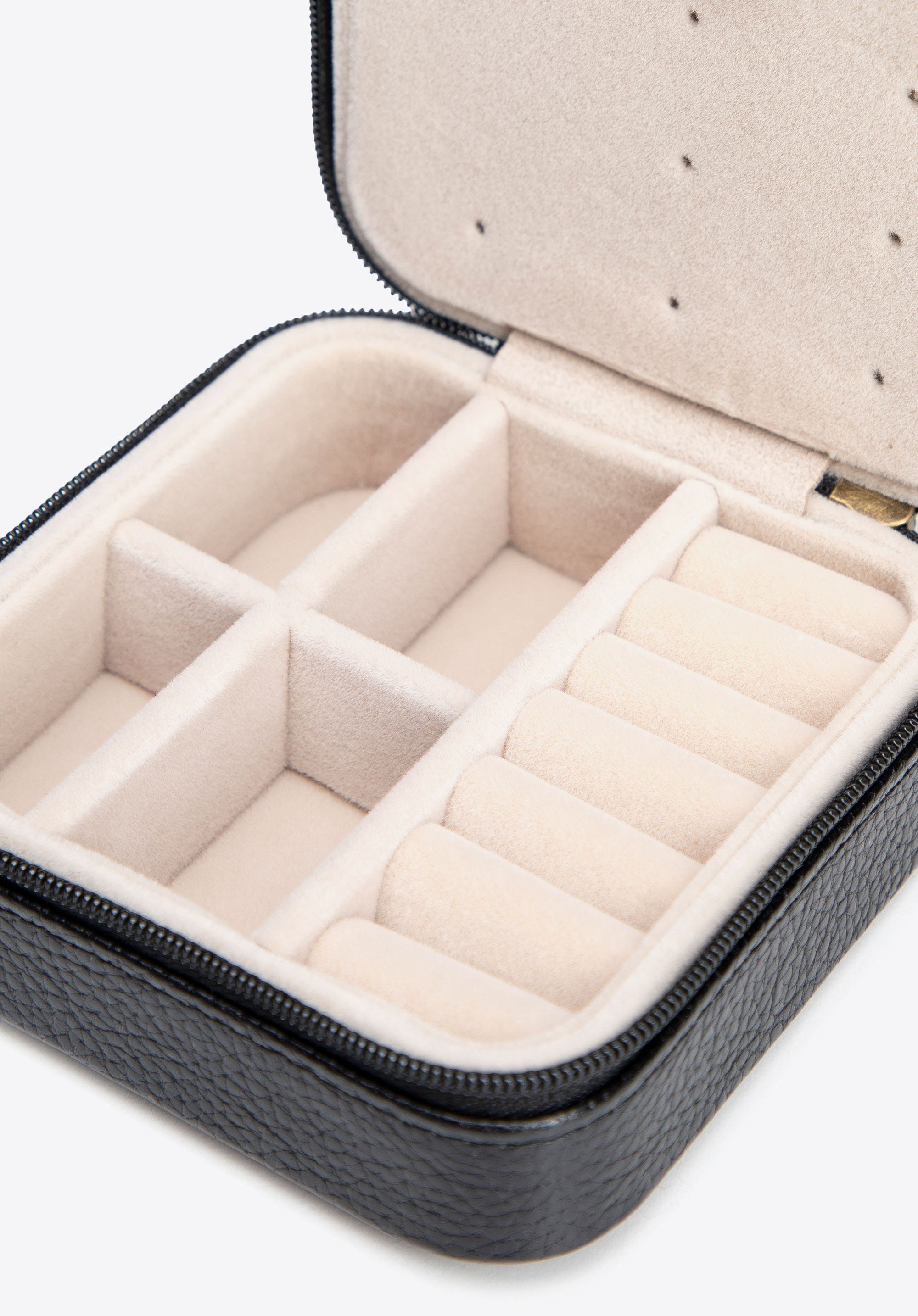 Зберігайте свої прикраси ідеально організованими та безпечними в будь-який час. Цей елегантний футляр з колекції Italy , виготовлений з натуральної шкіри з рифленою текстурою , захоплює не лише своїм зовнішнім виглядом, але й практичністю. Компактну скриньку , що застібається на міцну блискавку, легко упакувати для подорожей або акуратно зберігати в шухляді. Внутрішня частина, підкладена м’яким легким велюром , захищає ваші прикраси від подряпин, а продумане планування забезпечує швидкий доступ до ваших улюблених прикрас: 4 компактні відділення для ланцюжків, сережок та витончених браслетів, а також 6 спеціальних відділень для кілець, призначених для надійного кріплення кожної каблучки.