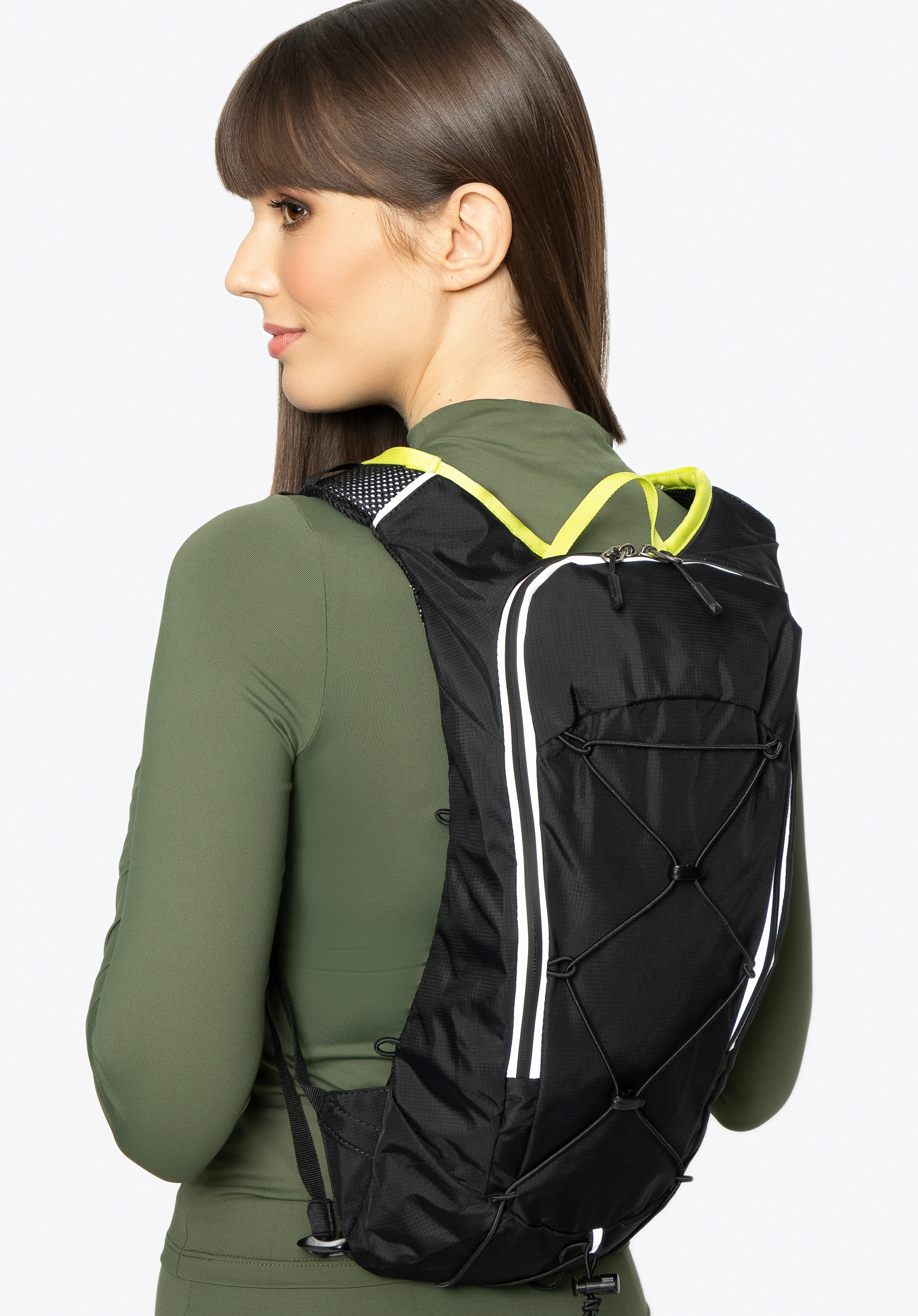 - Еластичні ремені спереду: дозволяють прикріпити додаткове спорядження, наприклад велосипедний шолом або куртку, зберігаючи руки вільними, і все надійно закріплено.