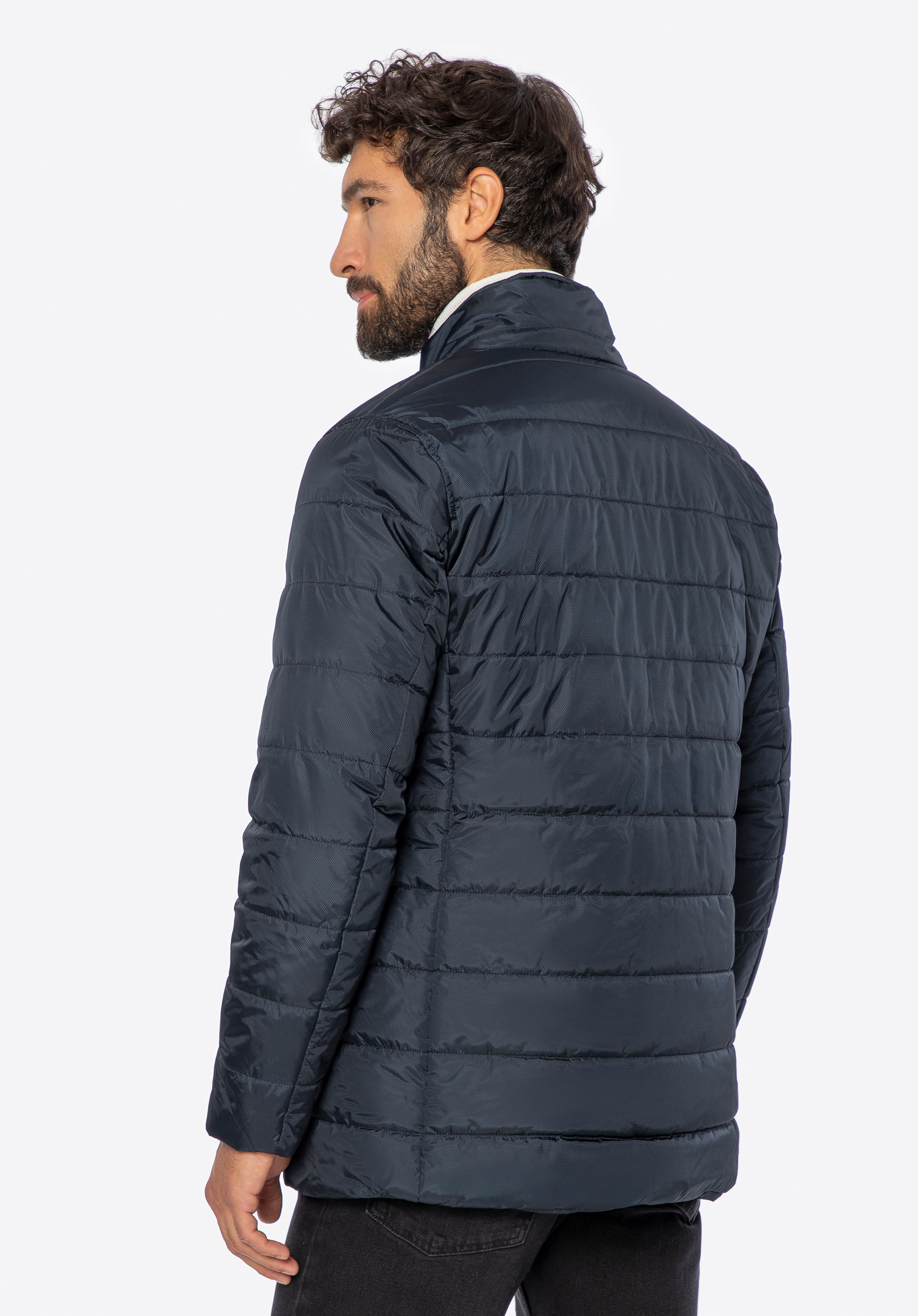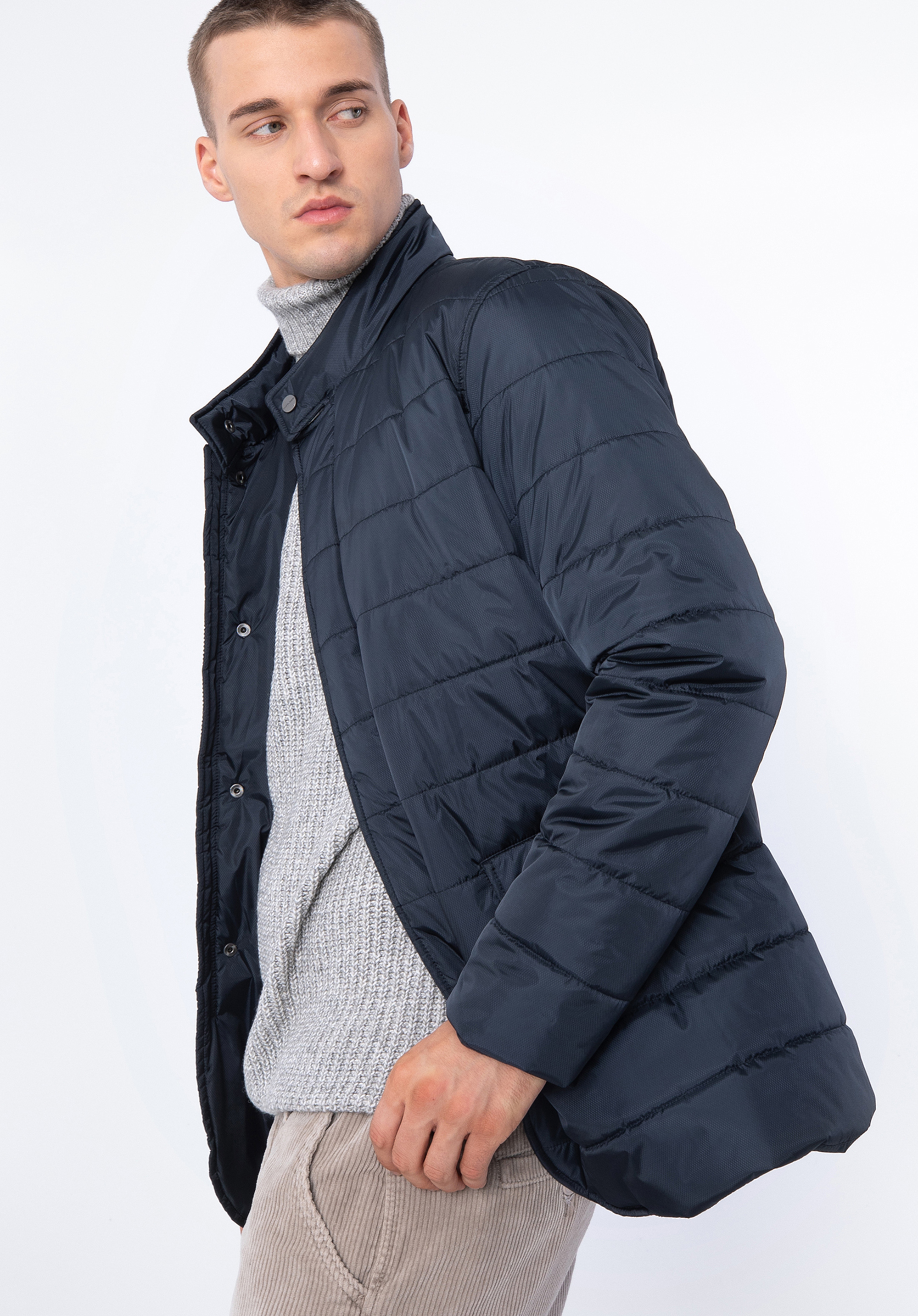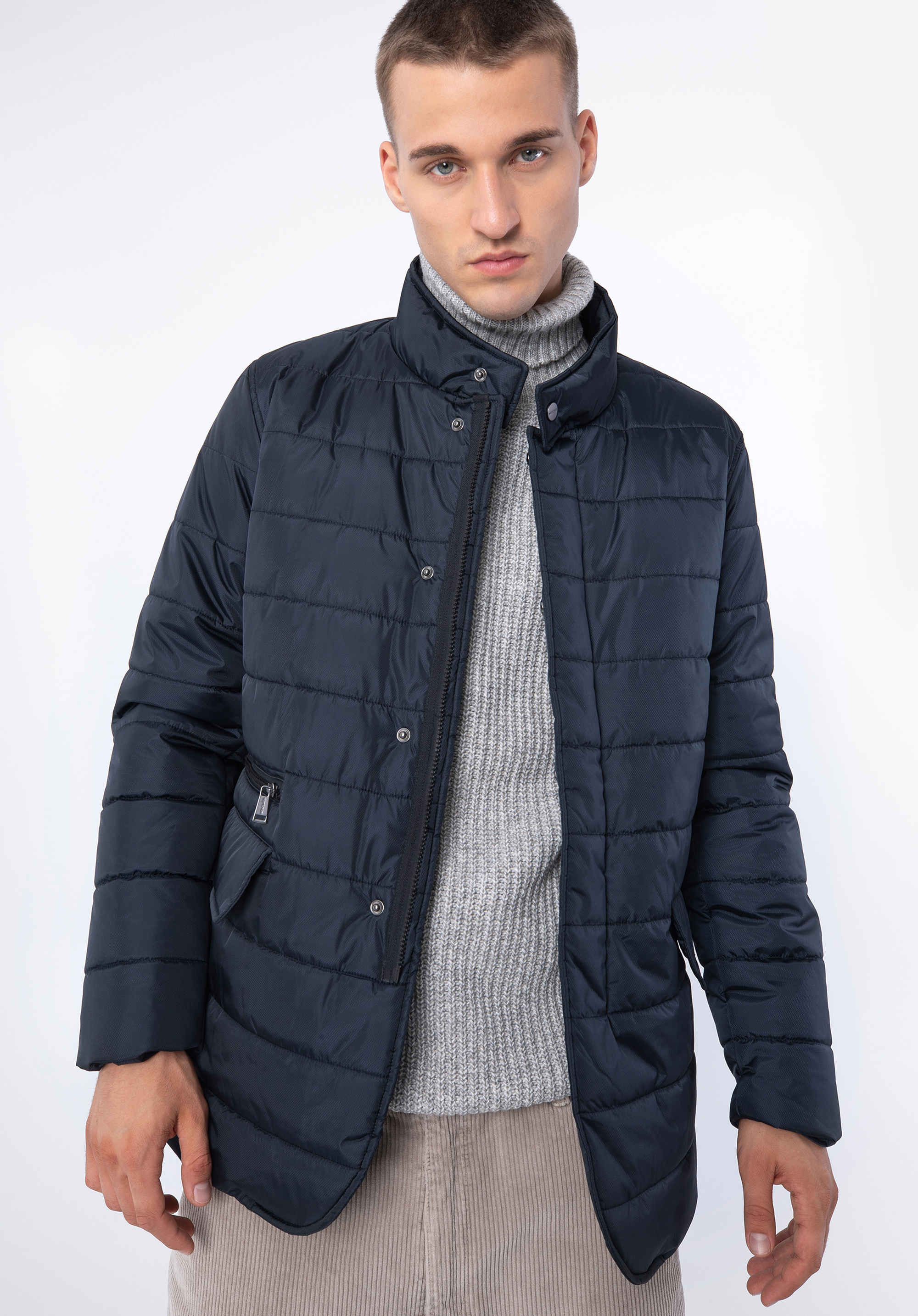 Ця тепла чоловіча куртка обов''язкова для кожного елегантного чоловіка. Виготовлена з нейлону, з ніжним блиском і дрібним малюнком. Застібка-блискавка прихована під клапаном, яка злегка закруглена внизу куртки. Завдяки коміру-стійці, що застібається на кнопку, можна захистити шию від холоду, а руки зручно розмістити у вертикальних кишенях, що закриваються на кнопку. Стьобана чоловіча нейлонова куртка - це незамінний аксесуар, який можна носити багато сезонів.