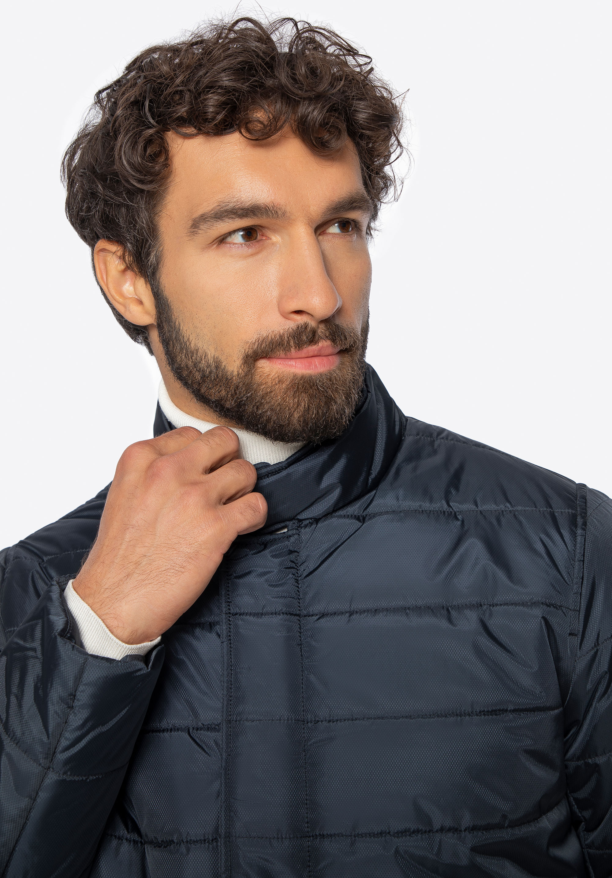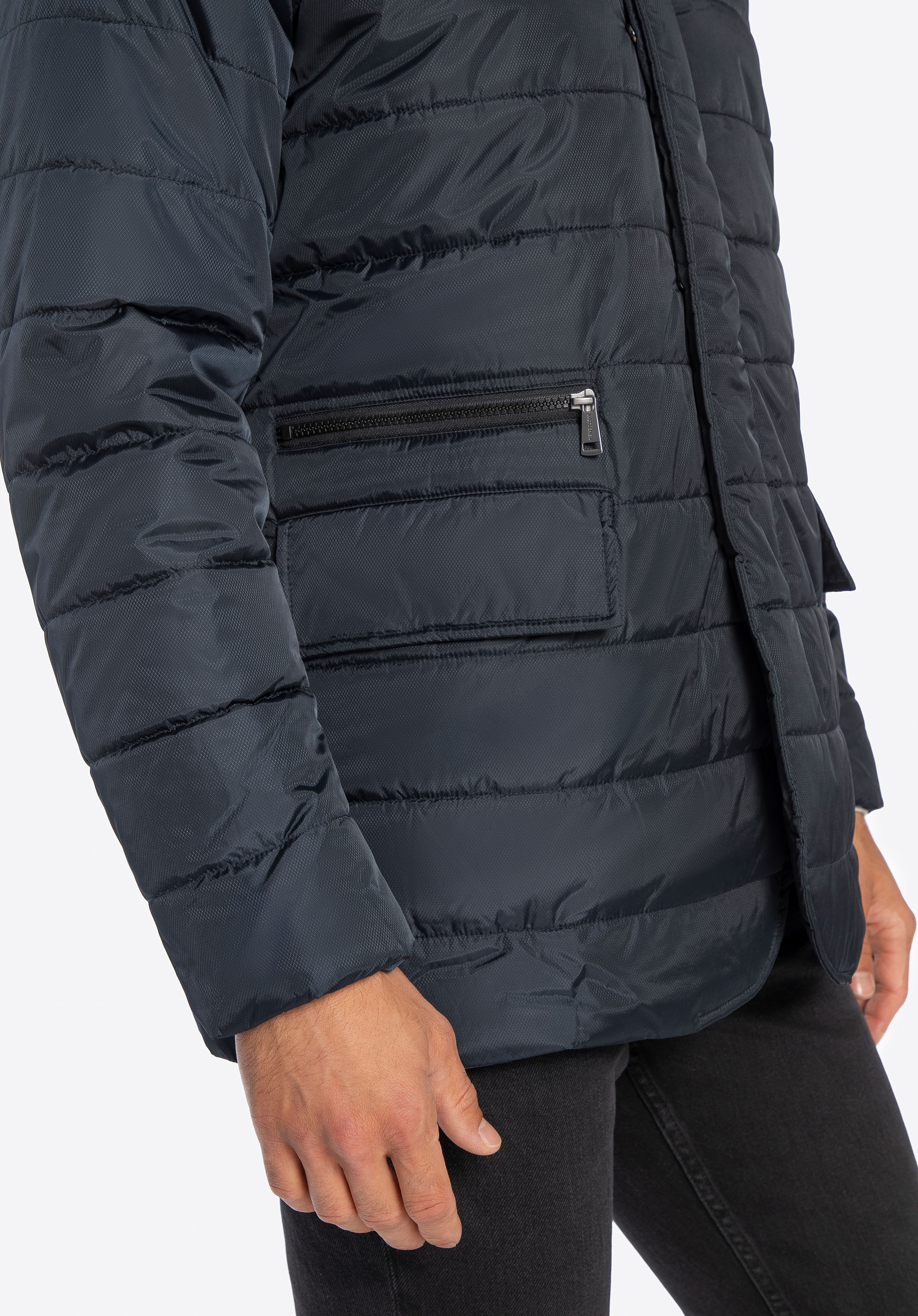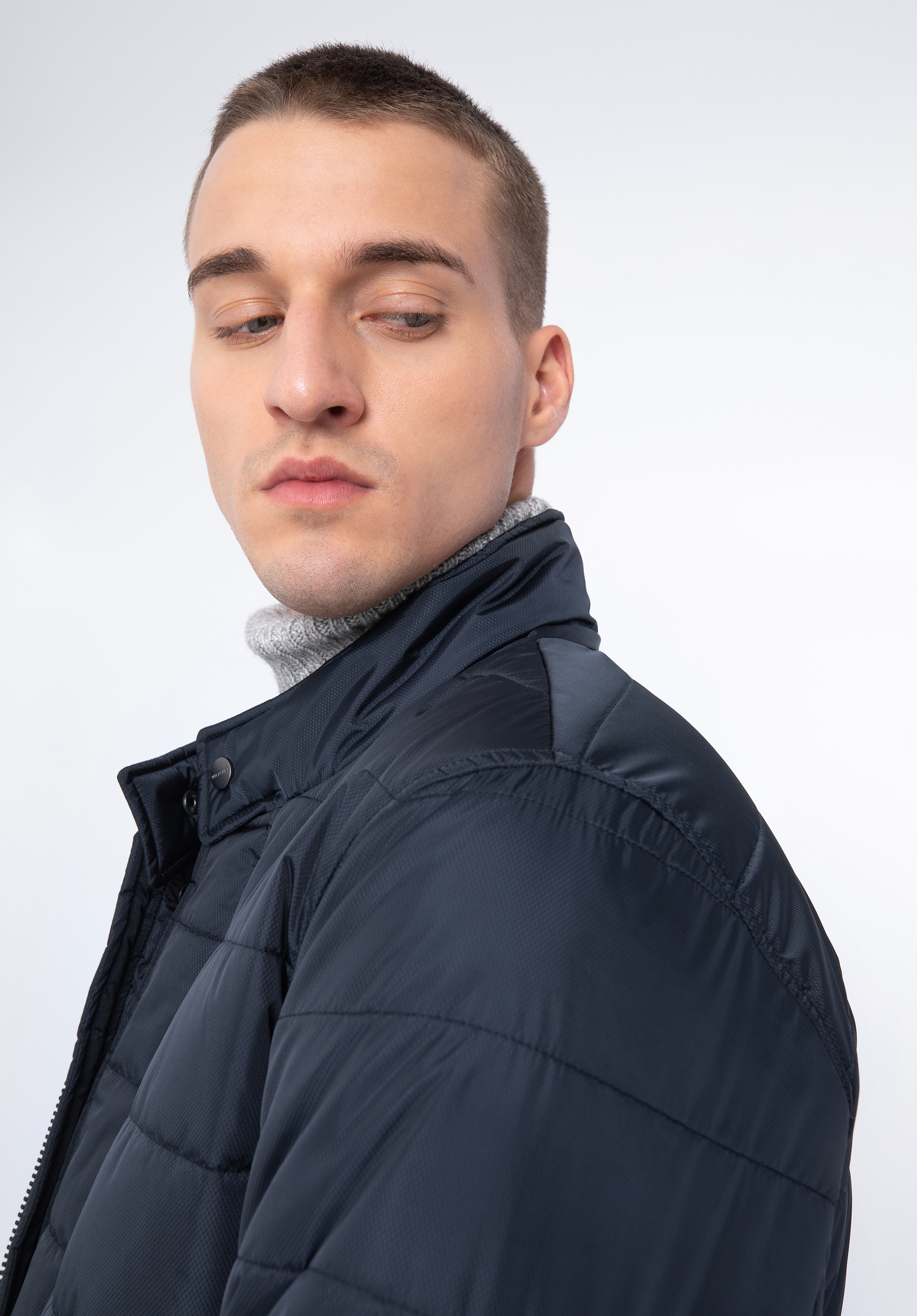 Ця тепла чоловіча куртка обов''язкова для кожного елегантного чоловіка. Виготовлена з нейлону, з ніжним блиском і дрібним малюнком. Застібка-блискавка прихована під клапаном, яка злегка закруглена внизу куртки. Завдяки коміру-стійці, що застібається на кнопку, можна захистити шию від холоду, а руки зручно розмістити у вертикальних кишенях, що закриваються на кнопку. Стьобана чоловіча нейлонова куртка - це незамінний аксесуар, який можна носити багато сезонів.