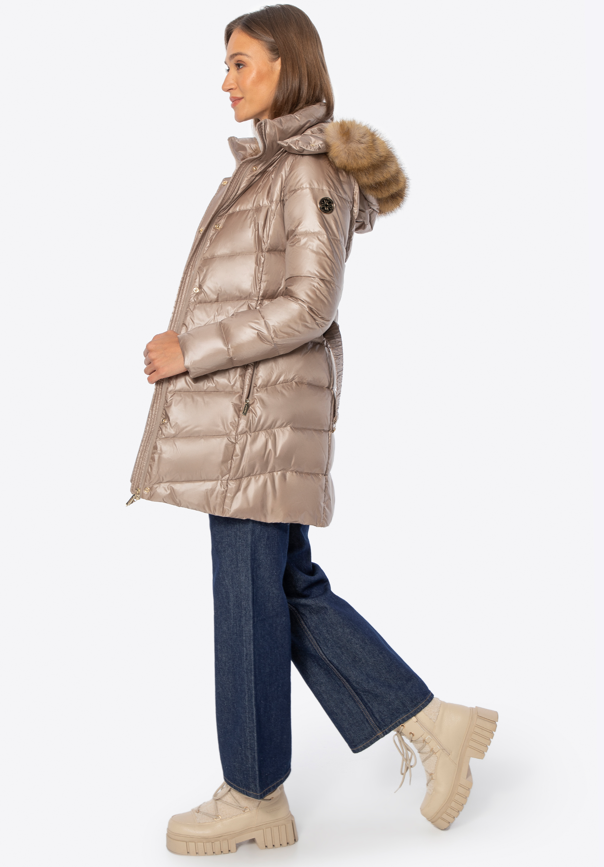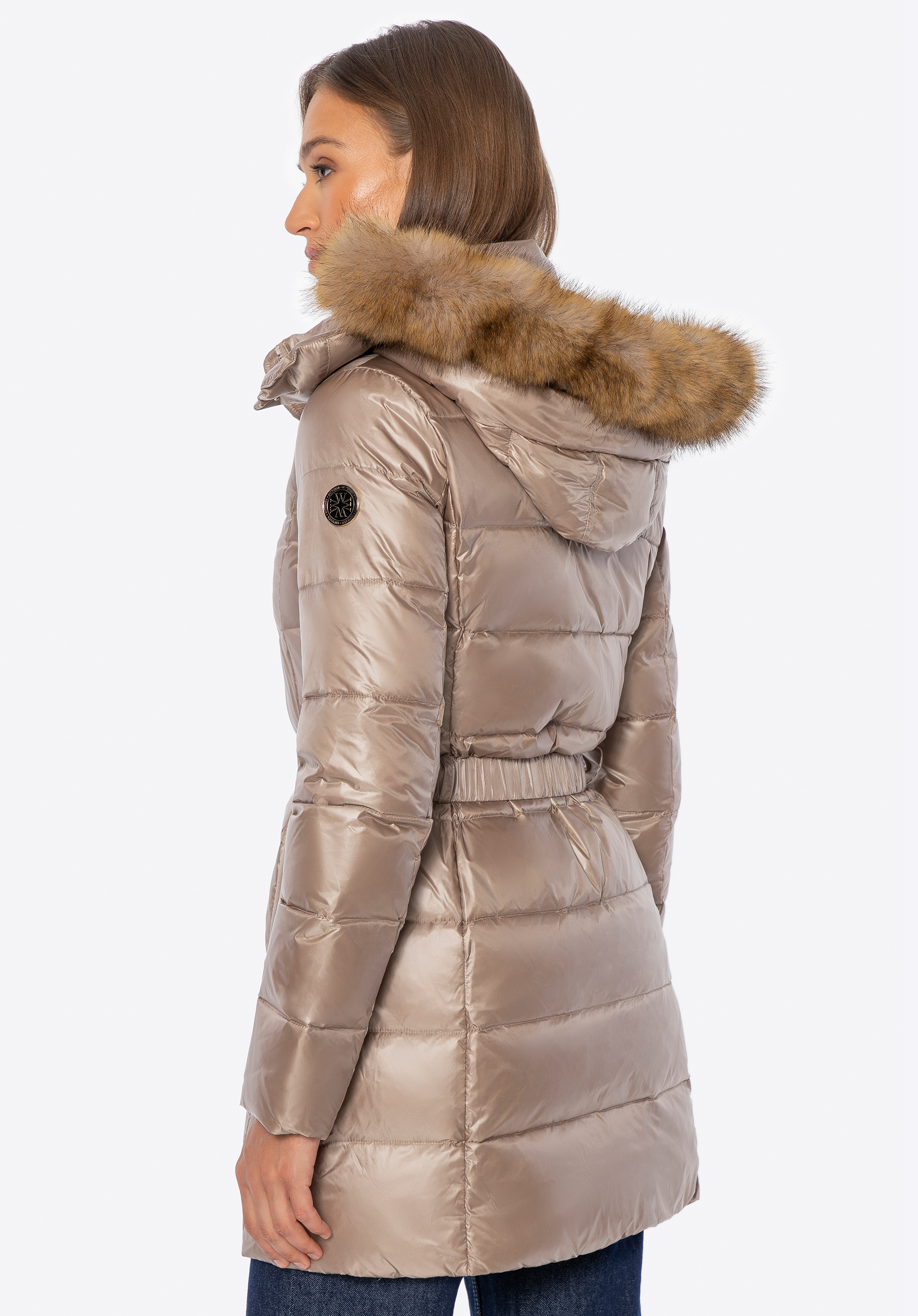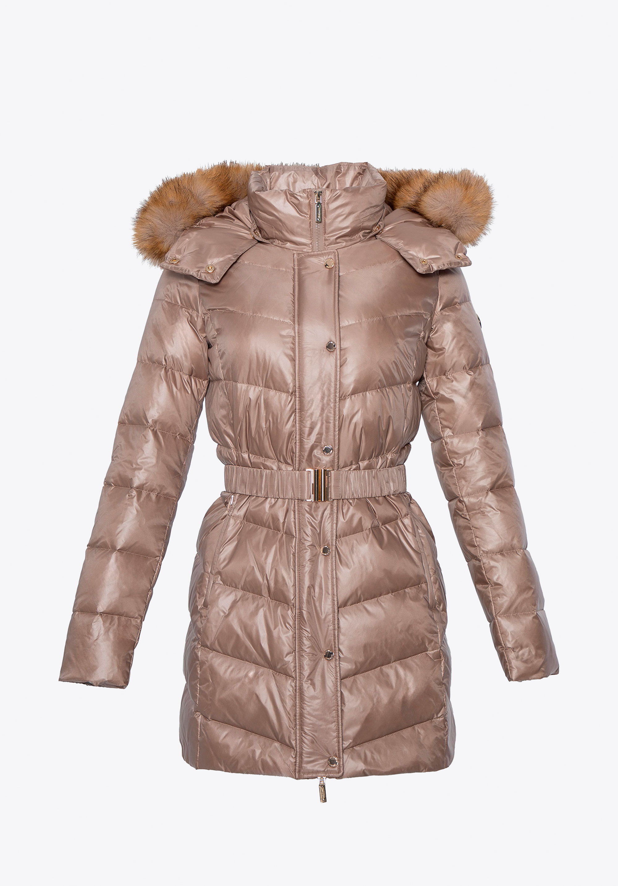 Ця жіноча куртка поєднує стиль і комфорт у холодні дні. Наповнювач з натурального пуху та пір''я забезпечує чудову ізоляцію, а стьобаний крій красиво облягає фігуру. Міцний нейлон захищає від вітру та вологи, а легка підкладка гарантує комфорт при носінні. Куртка відрізняється практичними деталями – блискавкою та кнопками, двома кишенями на блискавці, поясом на талії, що підкреслює жіночний силует, та відстібним капюшоном зі штучним хутром, ідеальним для різних випадків.