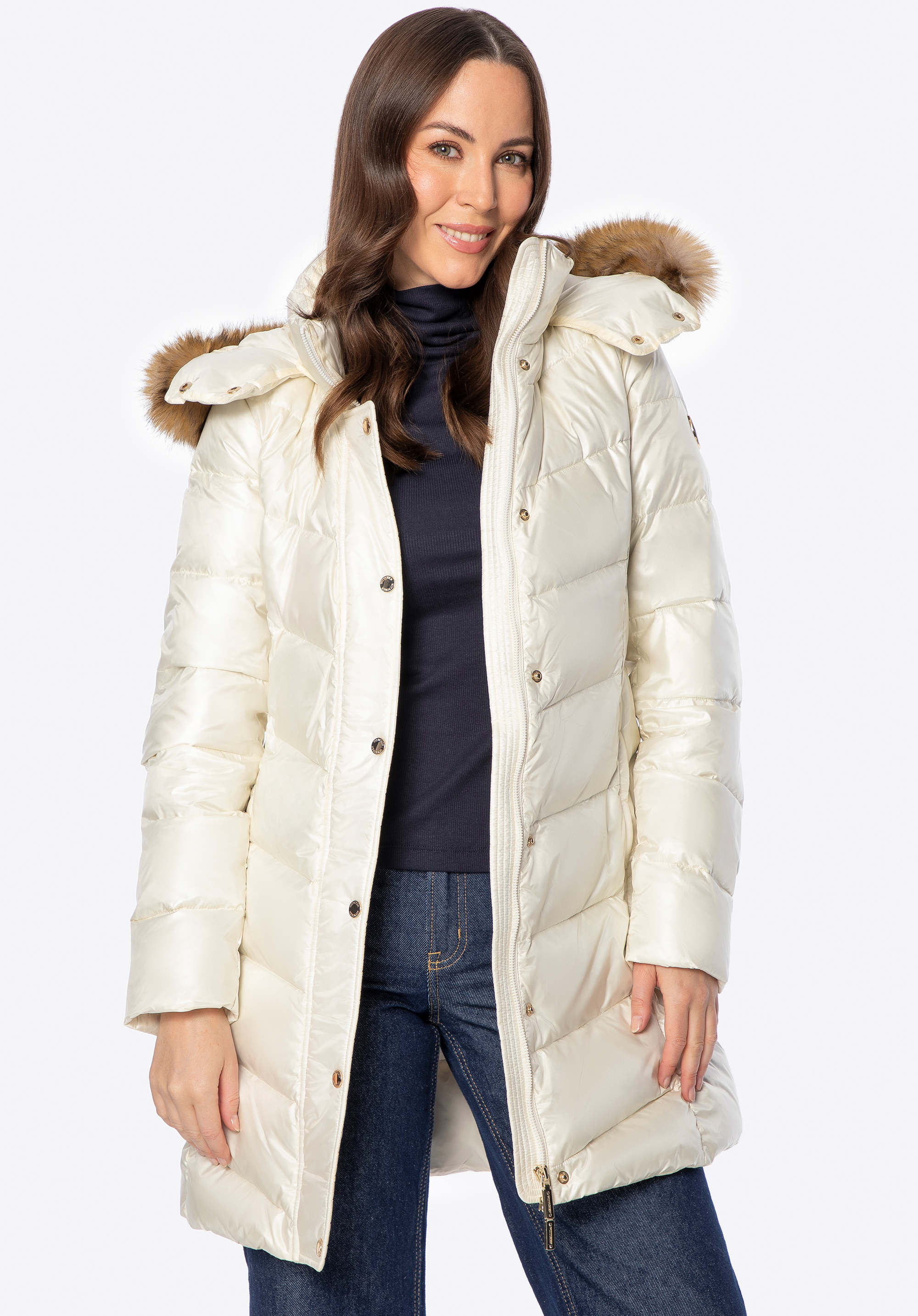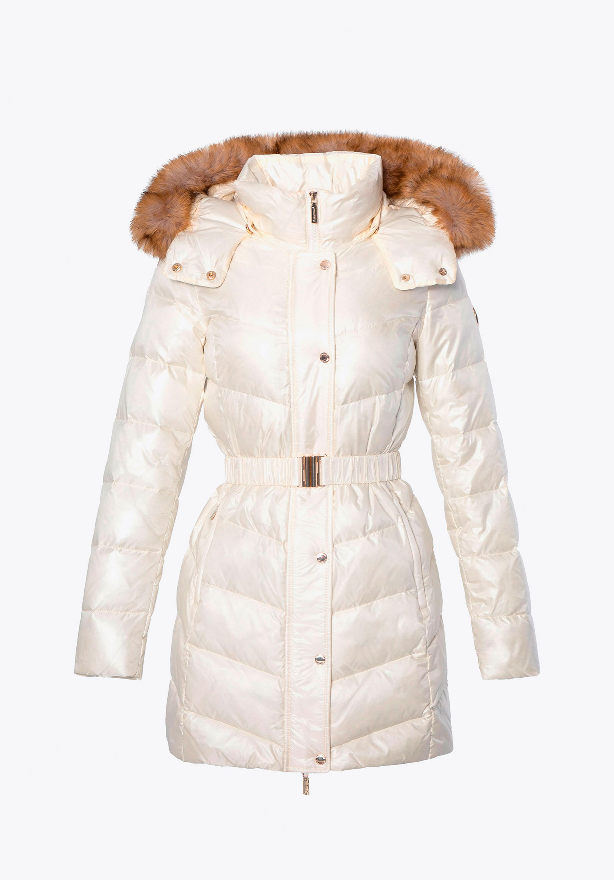 Ця жіноча куртка поєднує стиль і комфорт у холодні дні. Наповнювач з натурального пуху та пір''я забезпечує чудову ізоляцію, а стьобаний крій красиво облягає фігуру. Міцний нейлон захищає від вітру та вологи, а легка підкладка гарантує комфорт при носінні. Куртка відрізняється практичними деталями – блискавкою та кнопками, двома кишенями на блискавці, поясом на талії, що підкреслює жіночний силует, та відстібним капюшоном зі штучним хутром, ідеальним для різних випадків.
