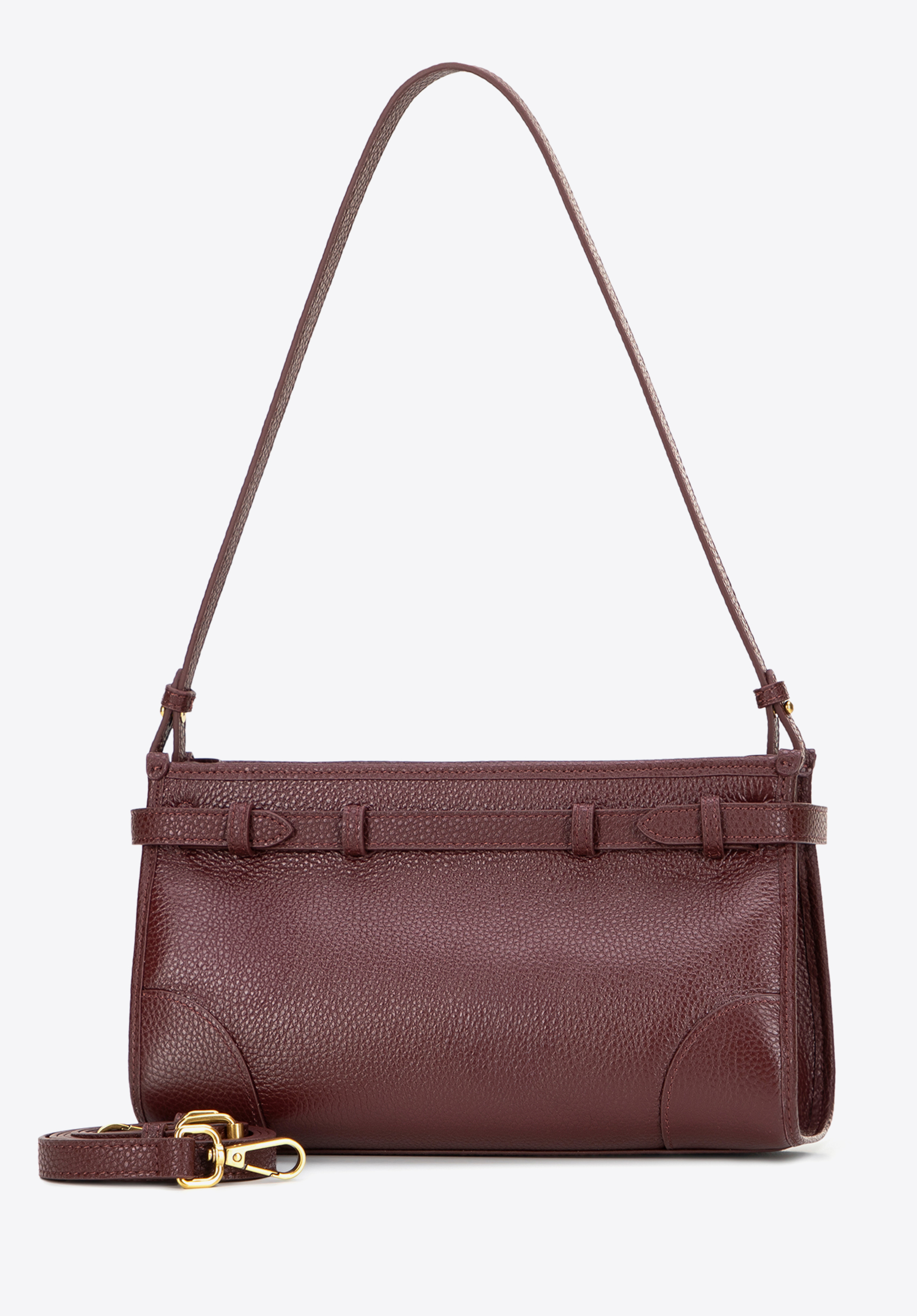 Відкрийте для себе цю сумку на плече, яка поєднує класичний дизайн із практичними функціями. Виготовлена з натуральної шкіри з ніжною зернистою текстурою, вона вирізняється елегантним оздобленням та довговічністю. Ремінець, внутрішня підкладка та дно виготовлені з екошкіри, яка чудово імітує шкіру, забезпечуючи легкість, комфорт та збереження форми навіть при щоденному використанні. Основне відділення з двома кишенями, включаючи одну на блискавці, допоможе організувати ваші необхідні речі, а декоративний ремінець із застібкою додає сучасного вигляду.