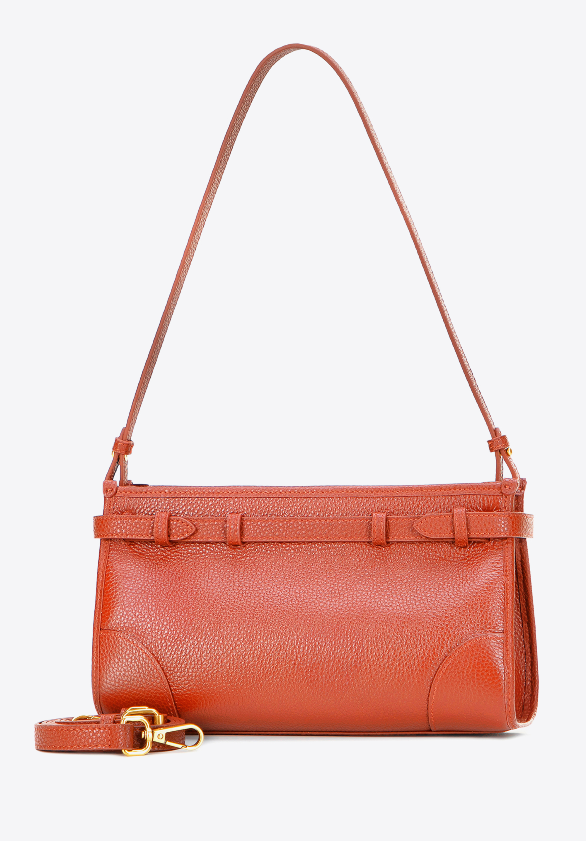 Відкрийте для себе цю сумку на плече, яка поєднує класичний дизайн із практичними функціями. Виготовлена з натуральної шкіри з ніжною зернистою текстурою, вона вирізняється елегантним оздобленням та довговічністю. Ремінець, внутрішня підкладка та дно виготовлені з екошкіри, яка чудово імітує шкіру, забезпечуючи легкість, комфорт та збереження форми навіть при щоденному використанні. Основне відділення з двома кишенями, включаючи одну на блискавці, допоможе організувати ваші необхідні речі, а декоративний ремінець із застібкою додає сучасного вигляду.