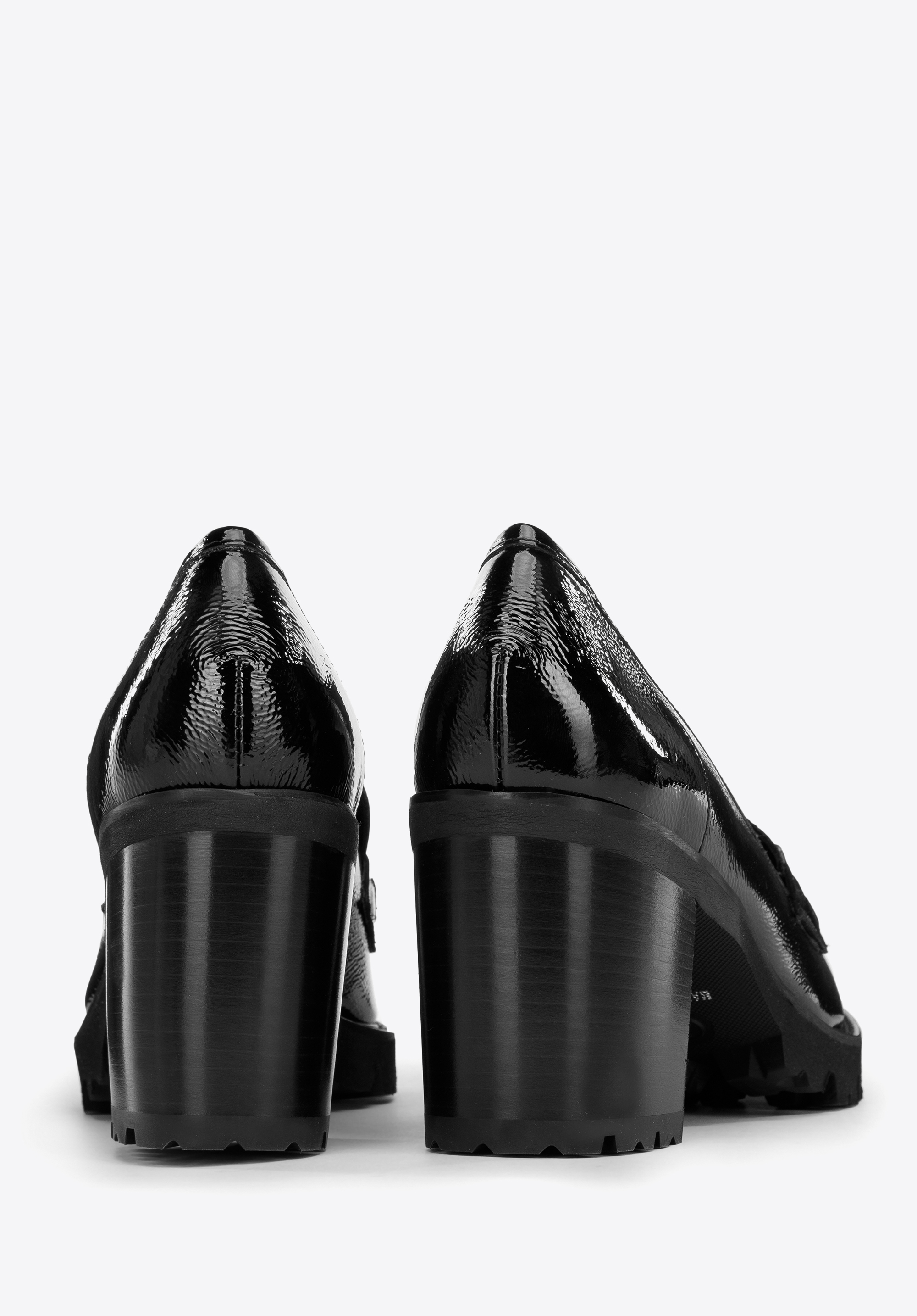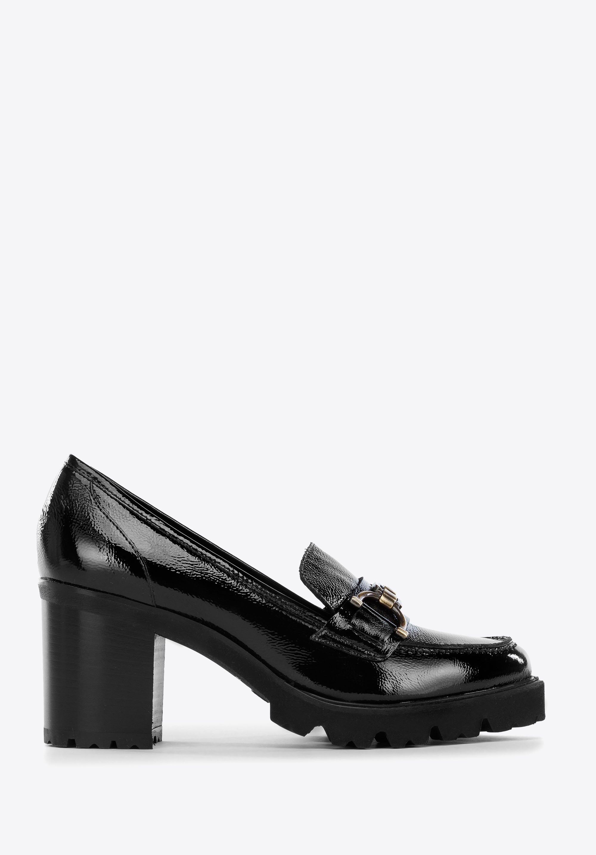 У гардеробі кожної жінки є елегантні та зручні туфлі на високих підборах. Дана модель виготовлена з високоякісної лакованої шкіри. Вони прикрашені пряжкою з латунного металу. Товстий каблук доповнюється рифленою платформою, яка забезпечує хороше зчеплення та комфортну ходьбу протягом багатьох годин. Лакові туфлі з пряжкою доповнять елегантний жіночий костюм і додадуть шику в укладку з чінос і сорочкою.