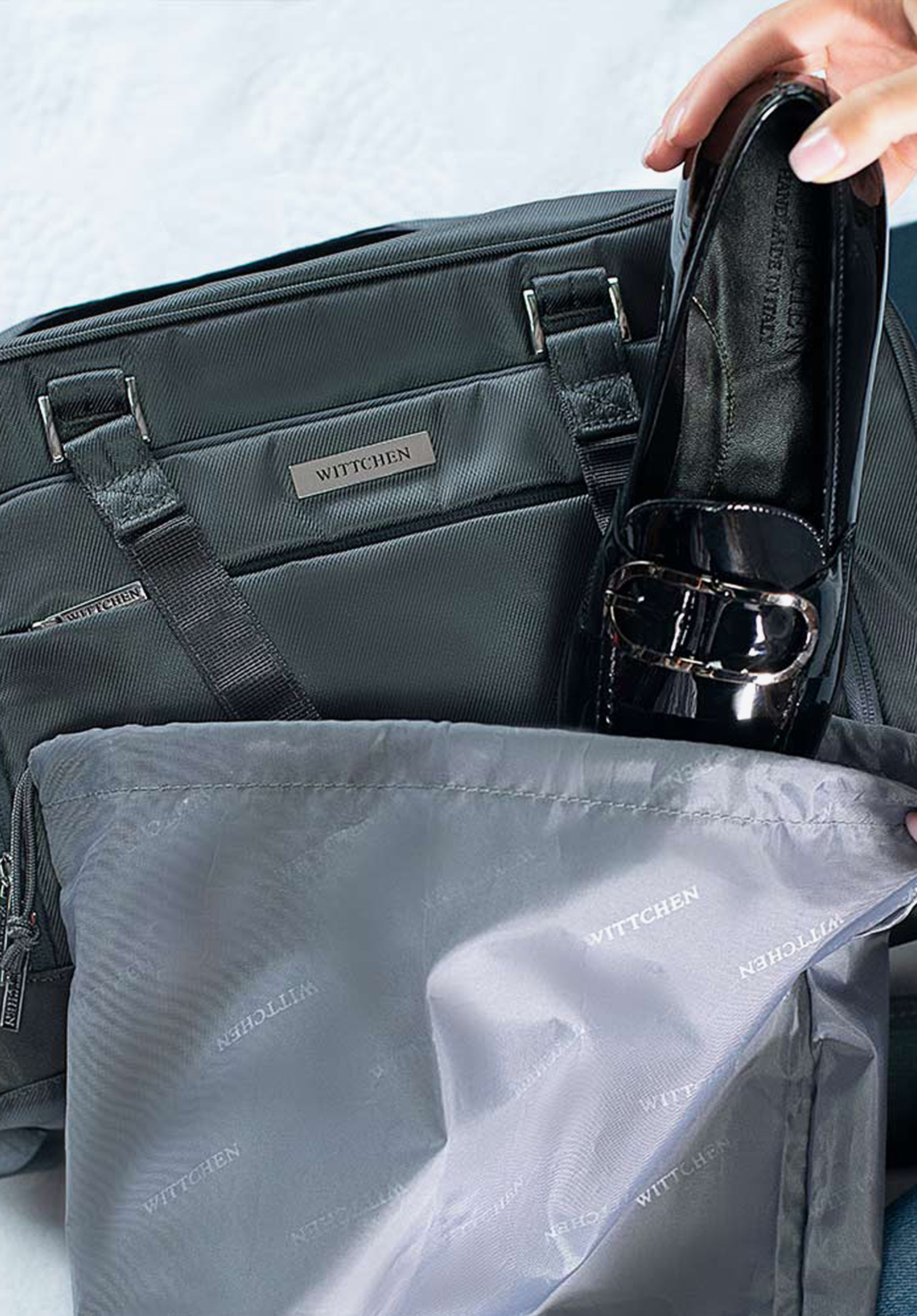 - у головному відсіку: знімна косметичка з прозорого пластика і сумка для білизни або взуття;