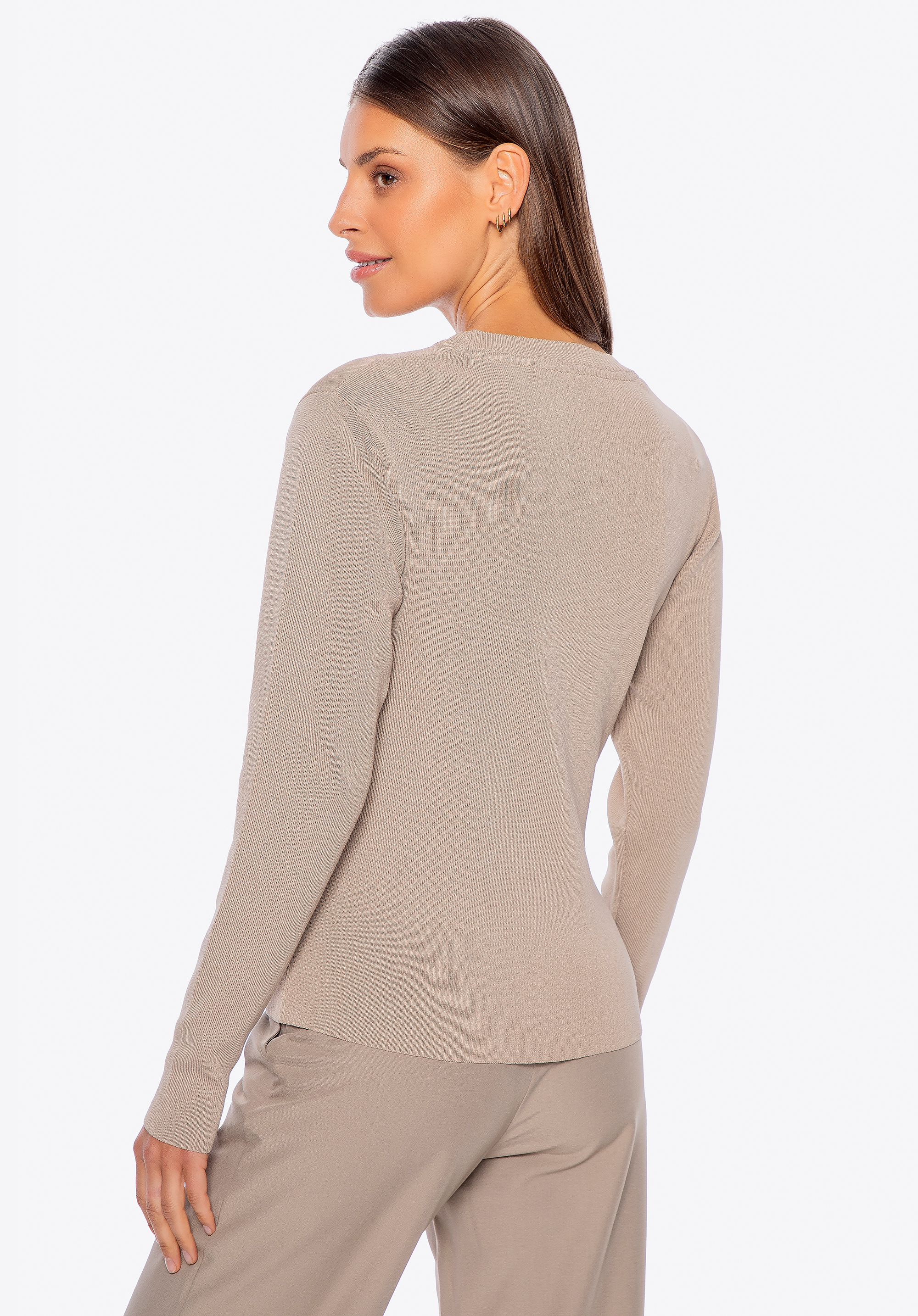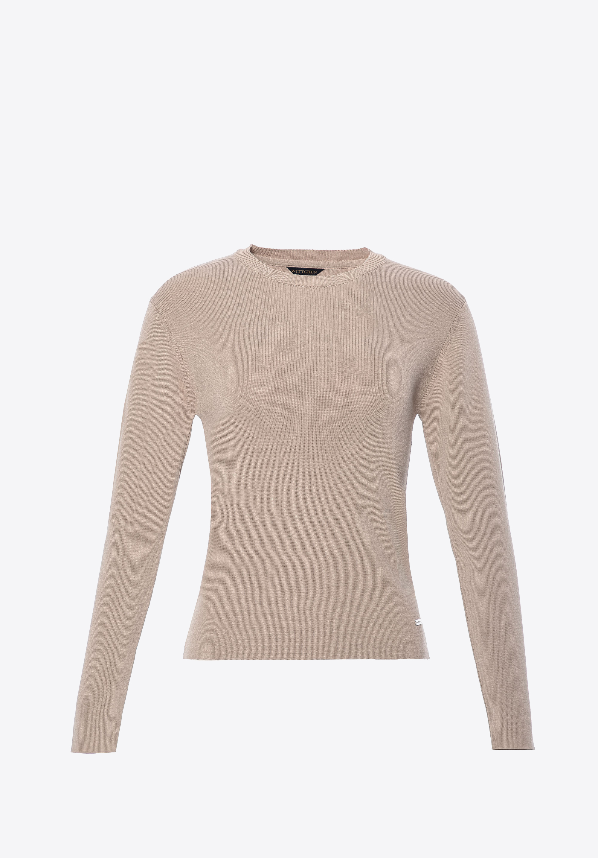 Цей светр — ідеальний вибір, якщо ви шукаєте комфорт у поєднанні з класичною елегантністю. Виготовлений з м''якої та легкої віскози з домішкою нейлону, він забезпечує комфорт протягом усього дня, незалежно від нагоди. Довгі, облягаючі рукави розроблені так, щоб ідеально прилягати до зап''ясть, що гарантує кращу посадку і елегантний вигляд. Ребристий виріз горловини додає светру витонченої структури та елегантності. Металева деталь внизу светра додає сучасного штриха, підкреслюючи увагу до деталей та додаючи модного шарму загальному образу.
