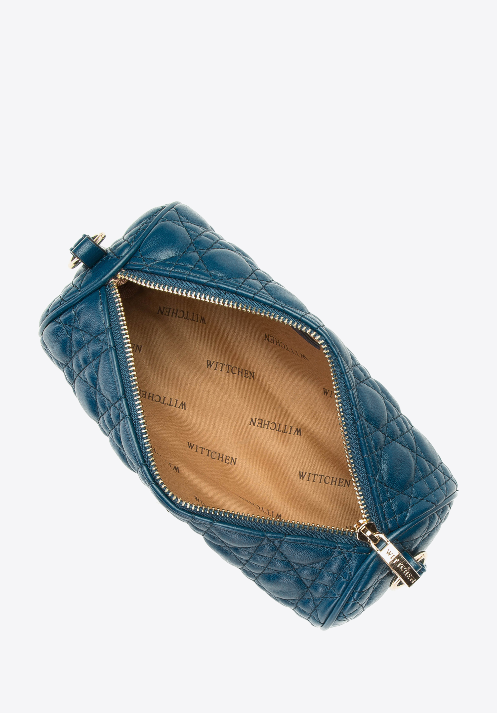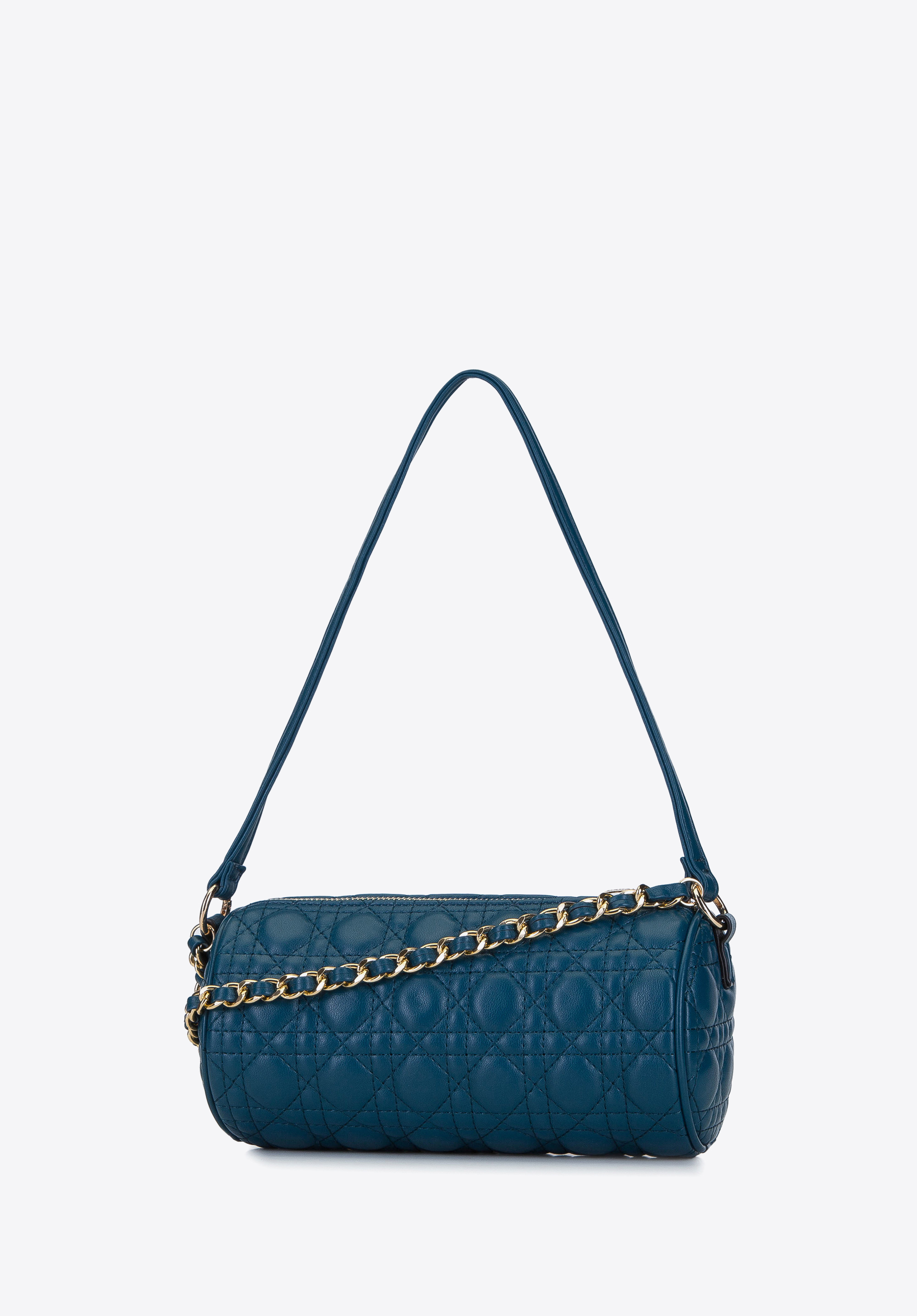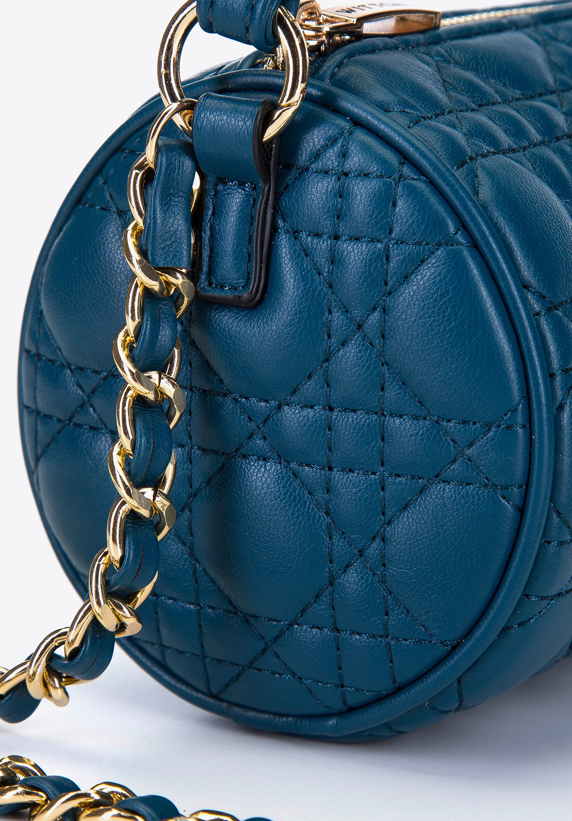 М''яка стьобана вечірня сумка на ланцюжку зі смаком сплетеним ремінцем і другим - коротким ремінцем до руки. Ви можете легко від’єднати та прикріпити їх до кільцеподібних карабінів. Матова, якісна екошкіра, з якої вона виготовлена, чудово виглядає в поєднанні з золотистими деталями. Цікава форма, прикрашена геометричними візерунками, набуває сучасного вигляду, який виділить ваш наряд з-поміж інших. Ідеальна сумка до елегантної сукні та високих підборів, а також до спортивної куртки та кросівок.