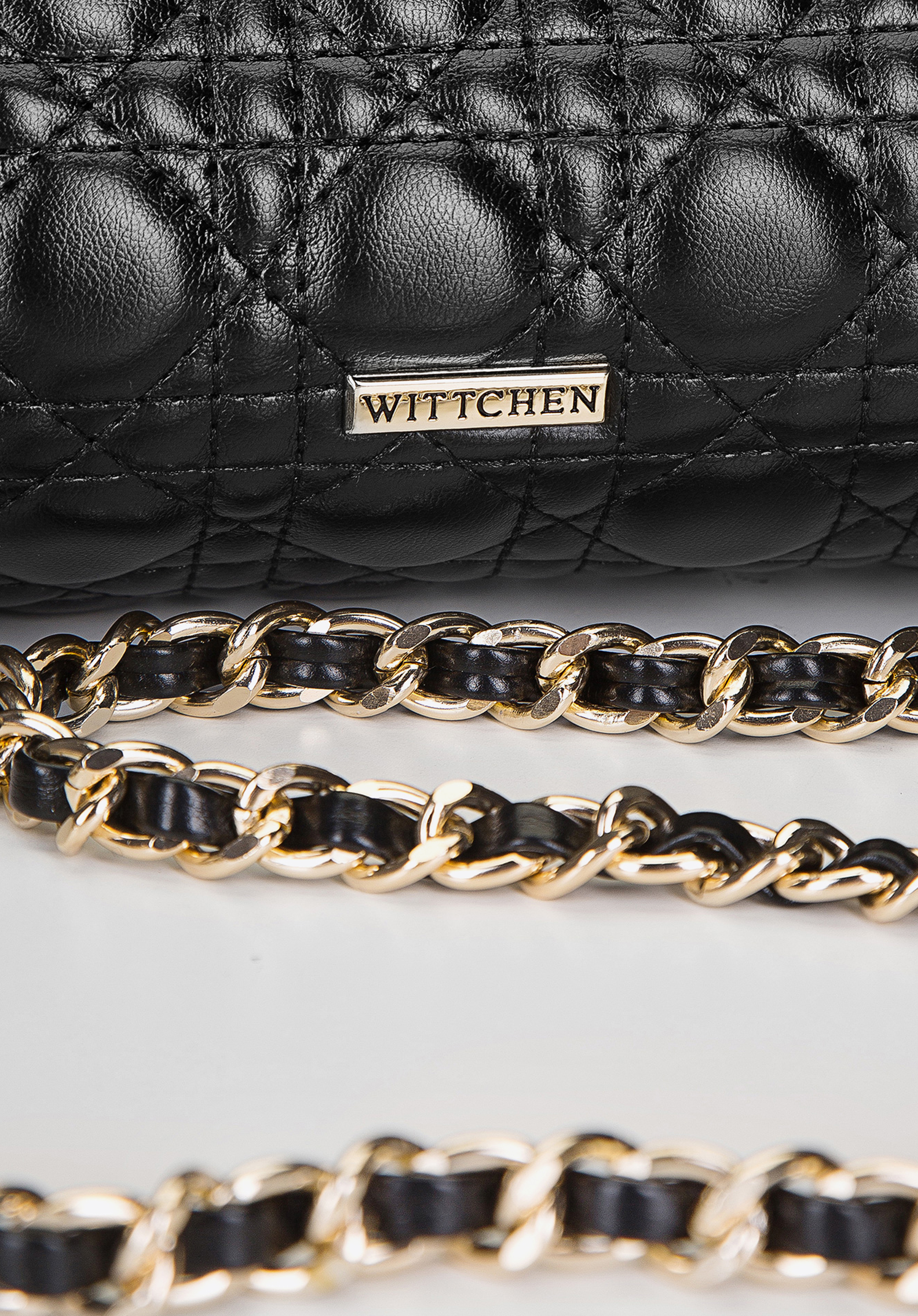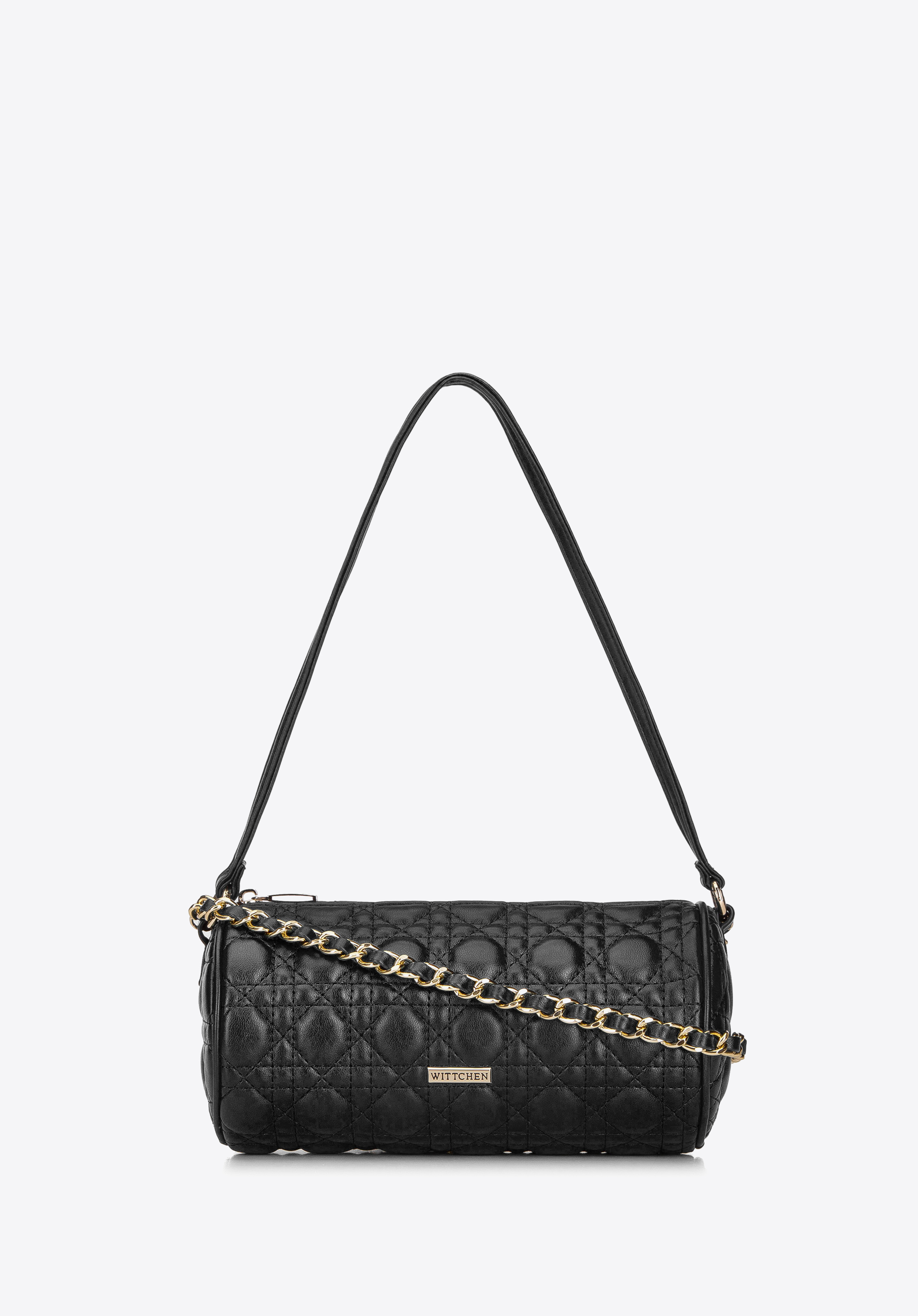 М''яка стьобана вечірня сумка на ланцюжку зі смаком сплетеним ремінцем і другим - коротким ремінцем до руки. Ви можете легко від’єднати та прикріпити їх до кільцеподібних карабінів. Матова, якісна екошкіра, з якої вона виготовлена, чудово виглядає в поєднанні з золотистими деталями. Цікава форма, прикрашена геометричними візерунками, набуває сучасного вигляду, який виділить ваш наряд з-поміж інших. Ідеальна сумка до елегантної сукні та високих підборів, а також до спортивної куртки та кросівок.