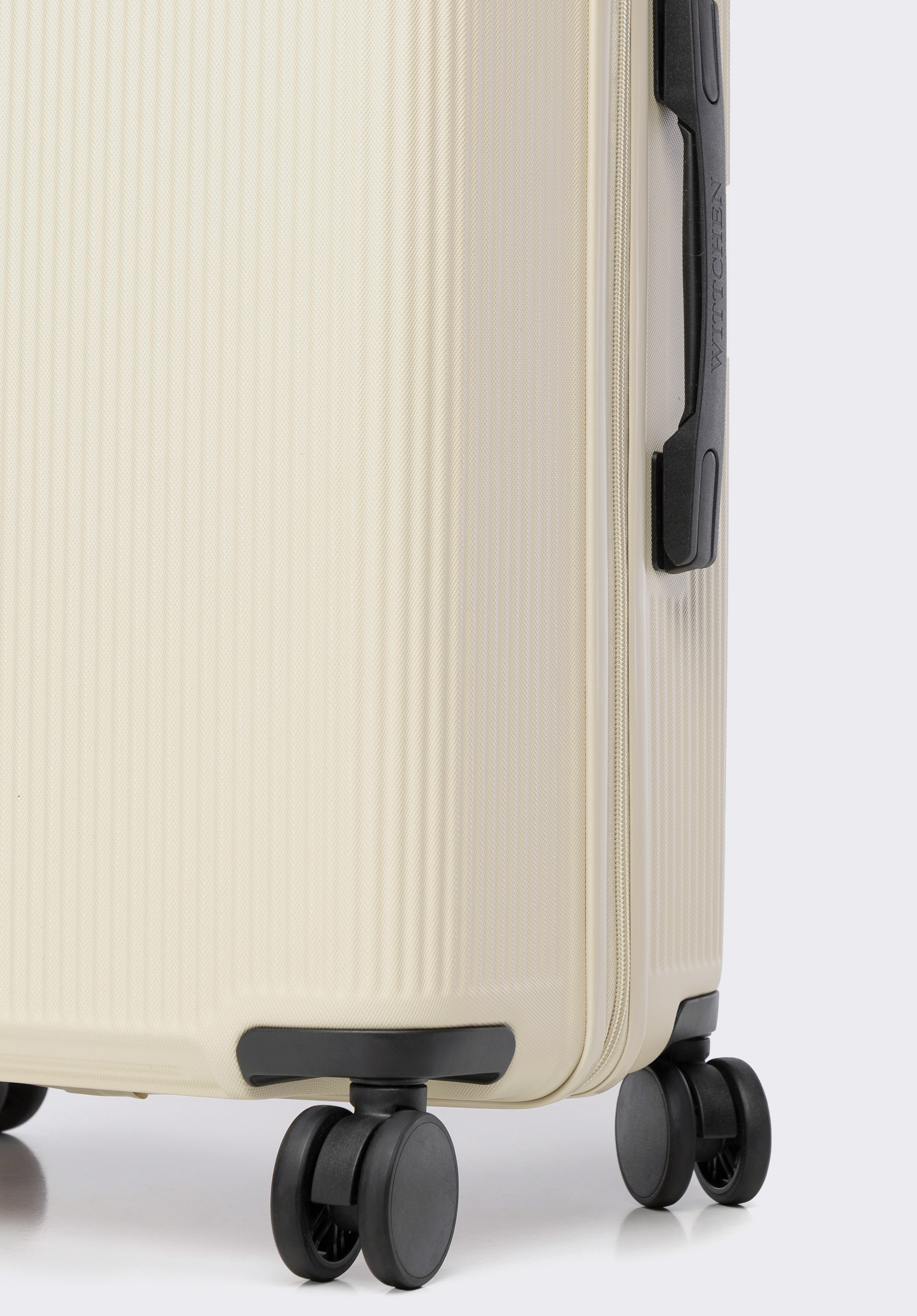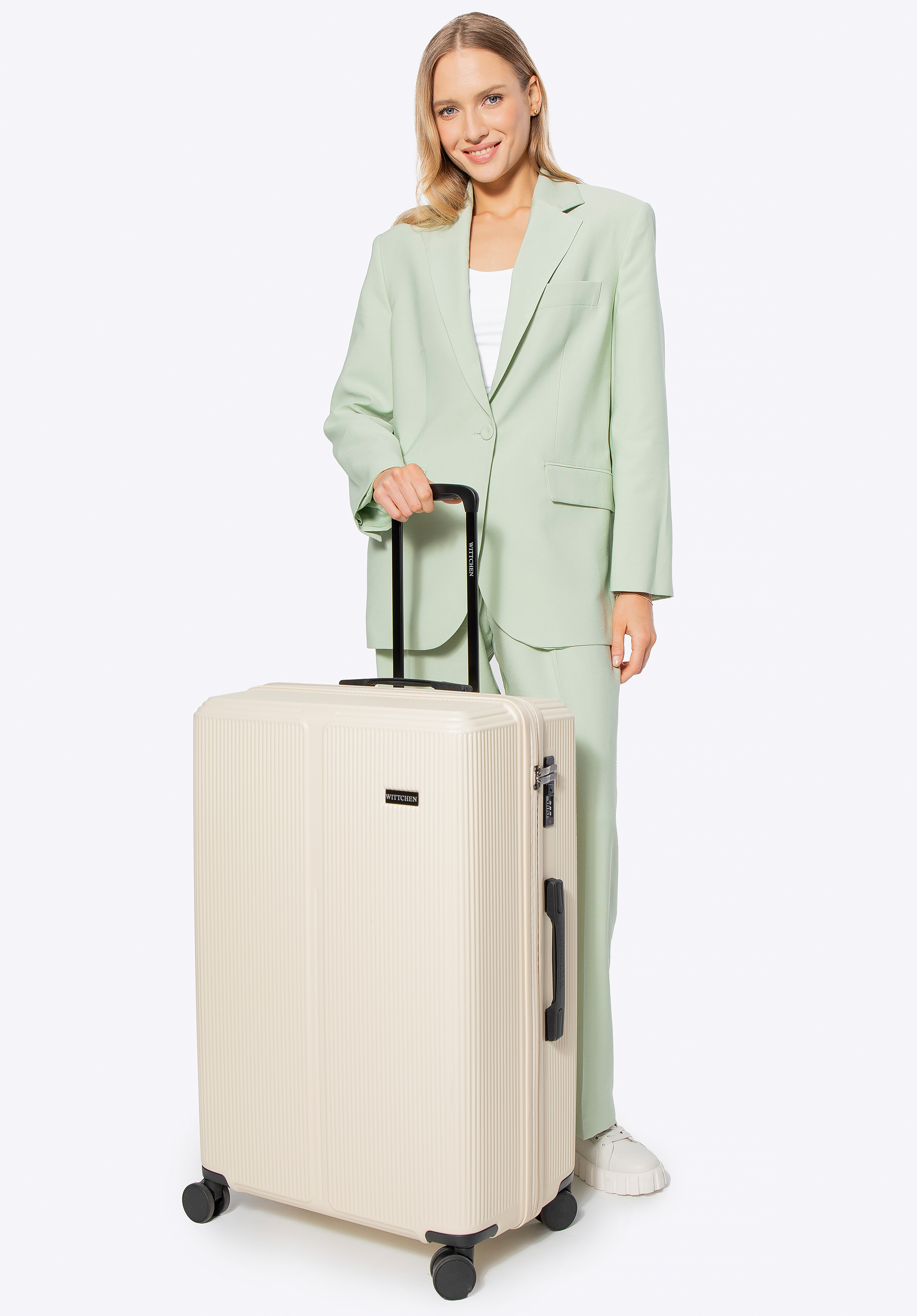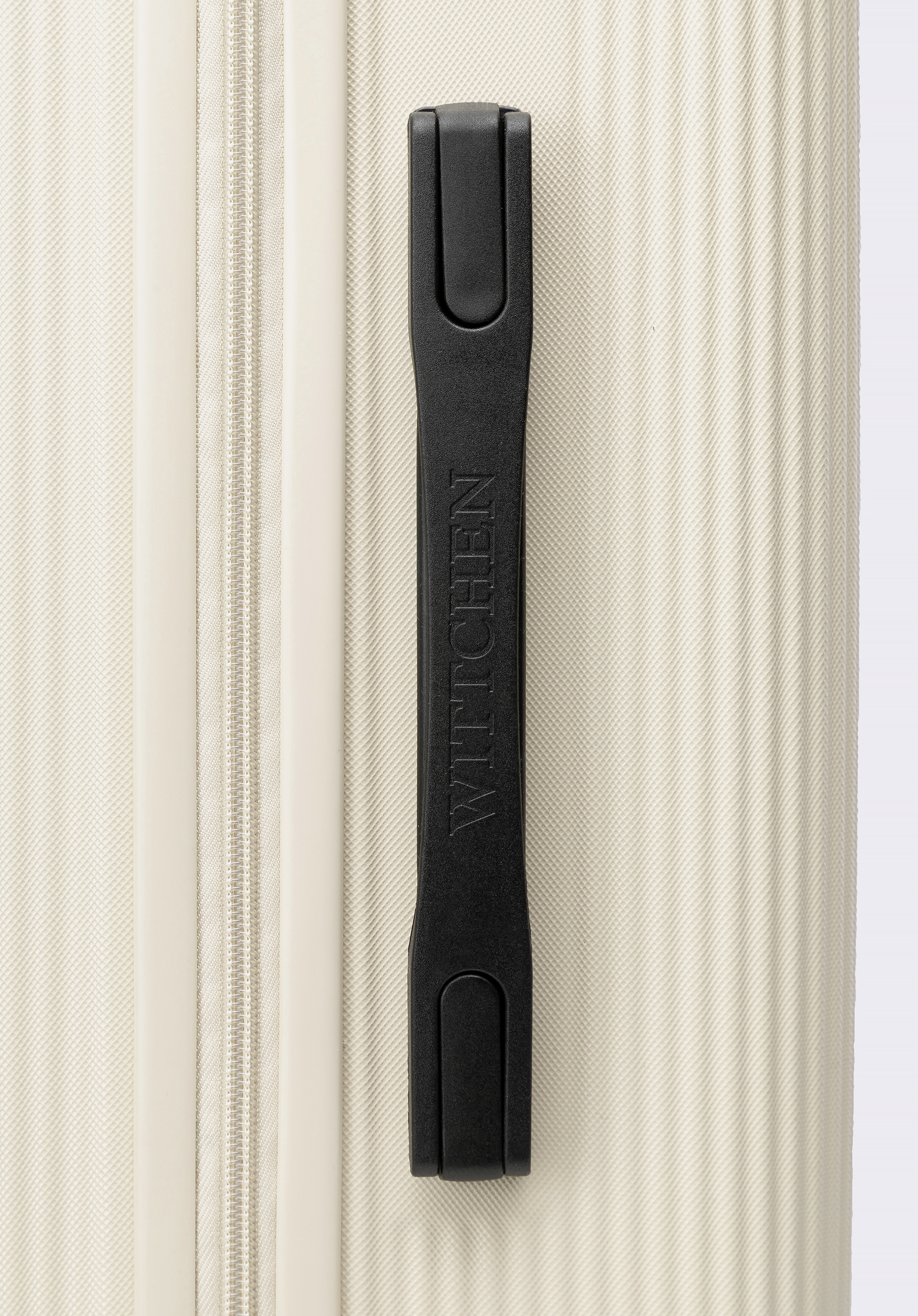 - Дизайн: Вертикальні виїмки та елегантні чорні деталі підкреслюють сучасний характер валізи.