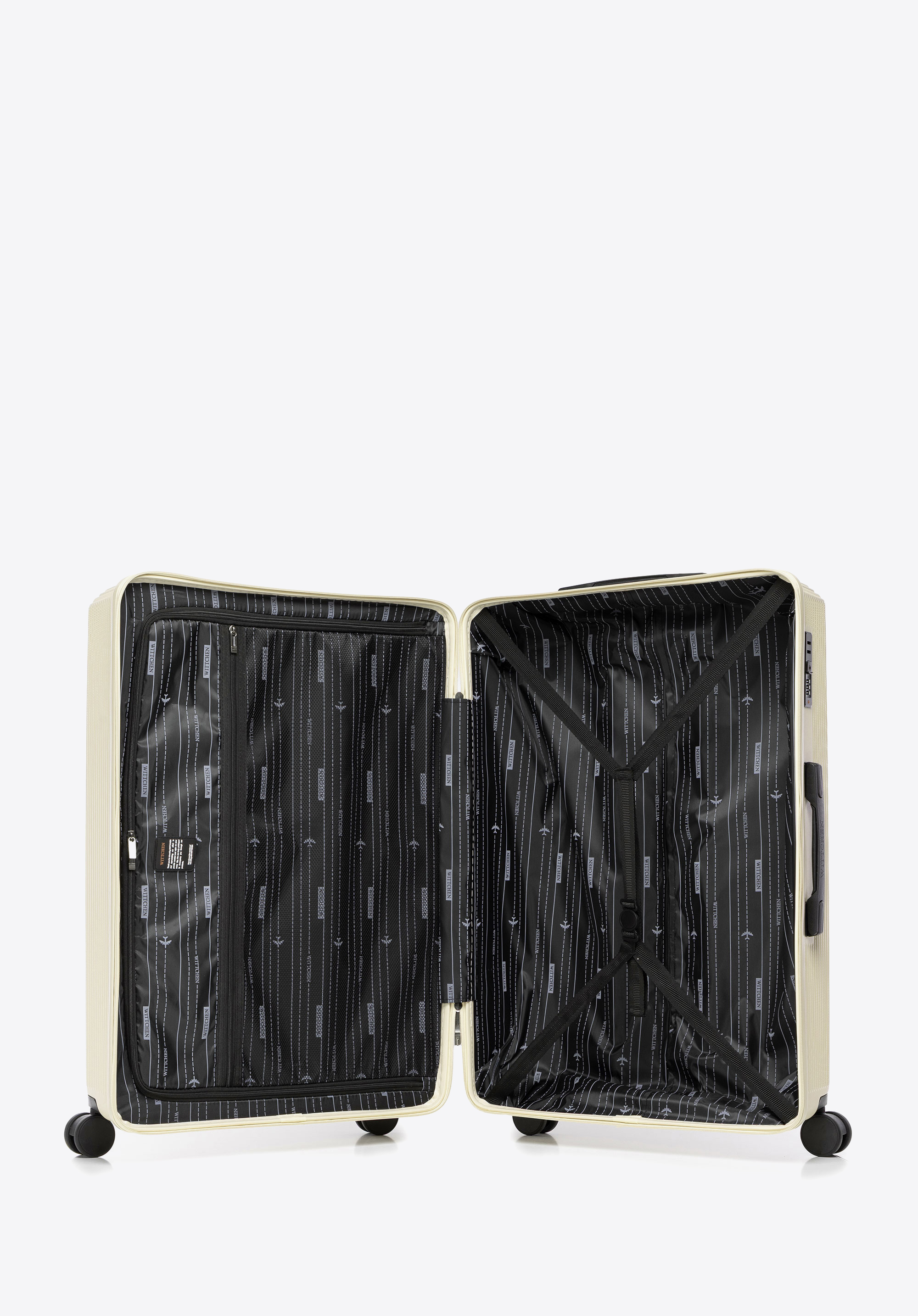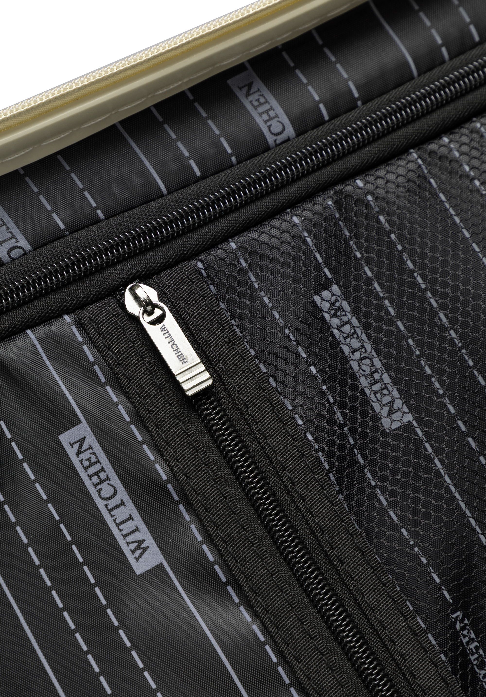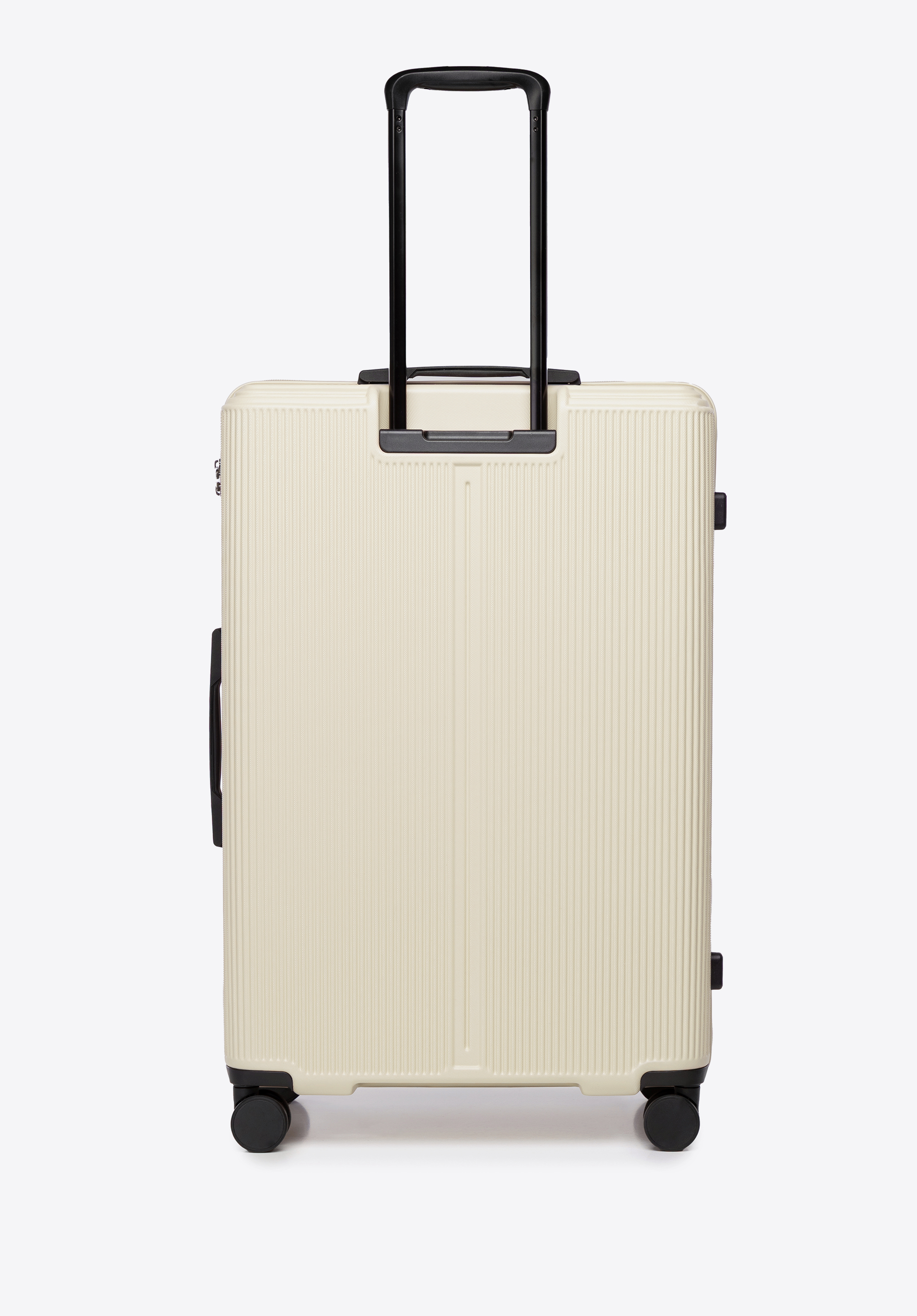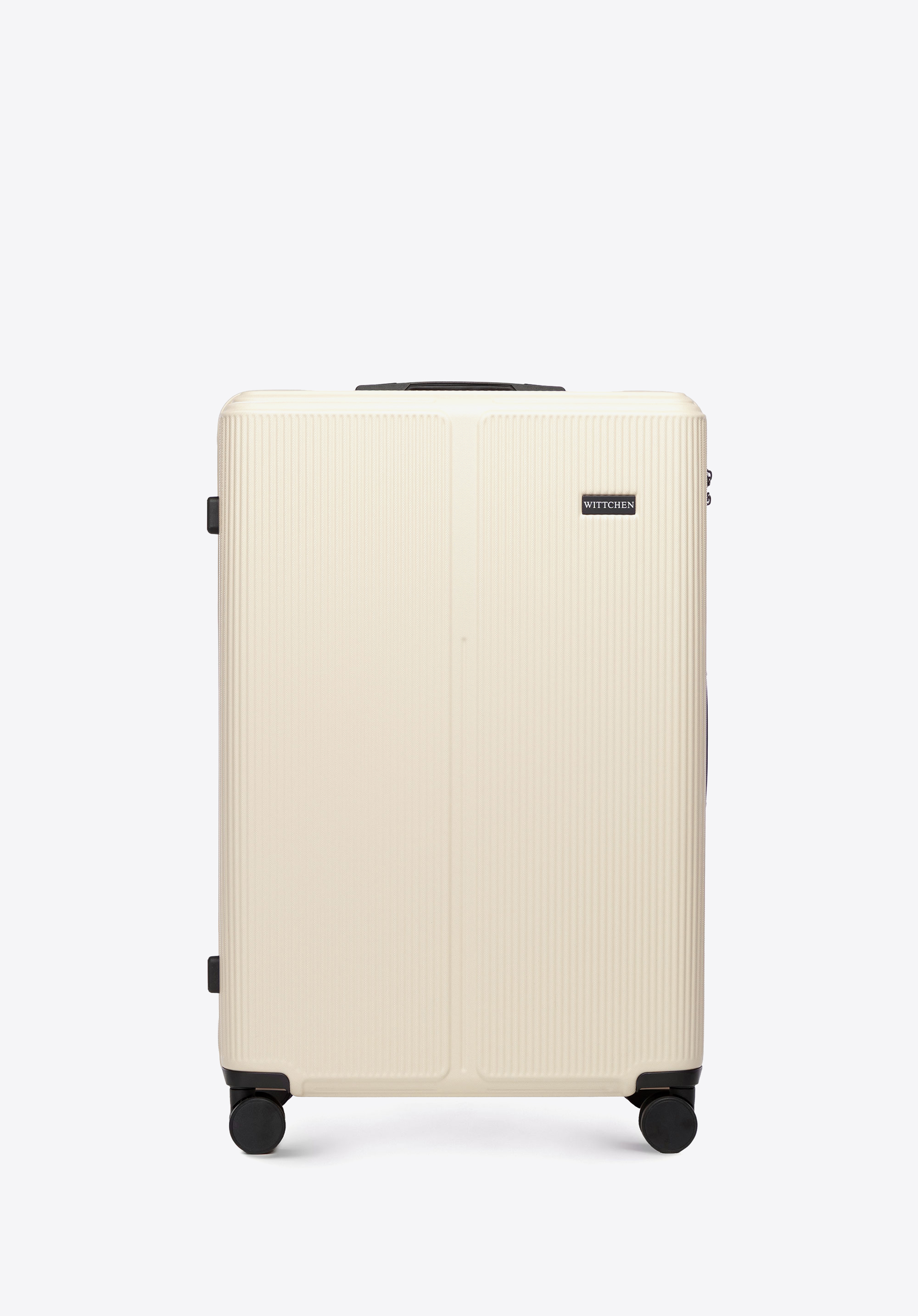 - Дизайн: Вертикальні виїмки та елегантні чорні деталі підкреслюють сучасний характер валізи.