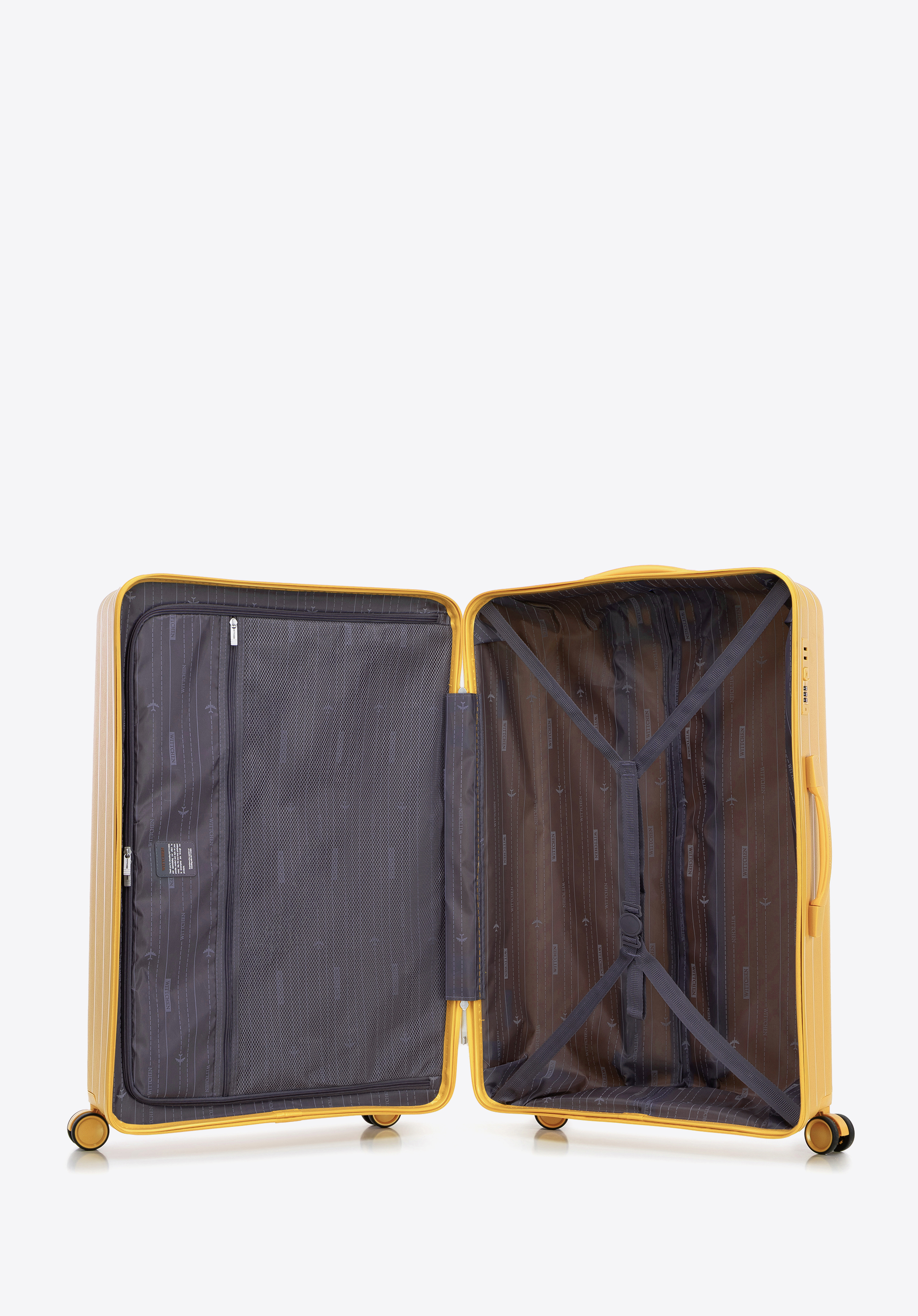 Наша велика валіза з колекції Raya Line поєднує місткість з елегантністю та довговічністю. Виготовлена з еластичного та міцного поліпропілену, вона вражає сучасним дизайном та функціональністю. Завдяки 4 подвійним колесам, телескопічній ручці та кодовому замку ви подорожуєте з максимальним комфортом – без стресу та компромісів.