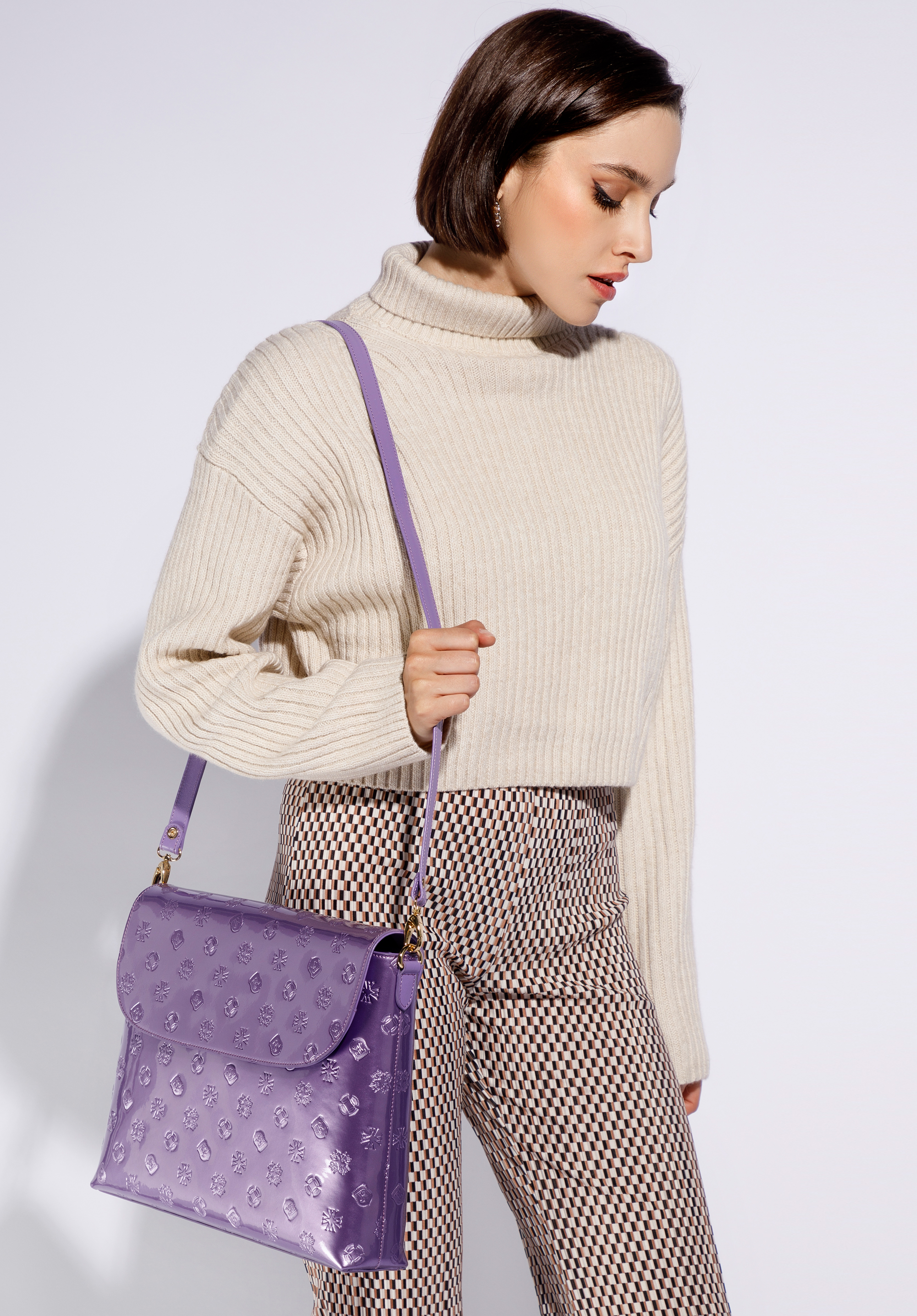Велика жіноча сумка через плече з металізованої лакованої шкіри пурпурна