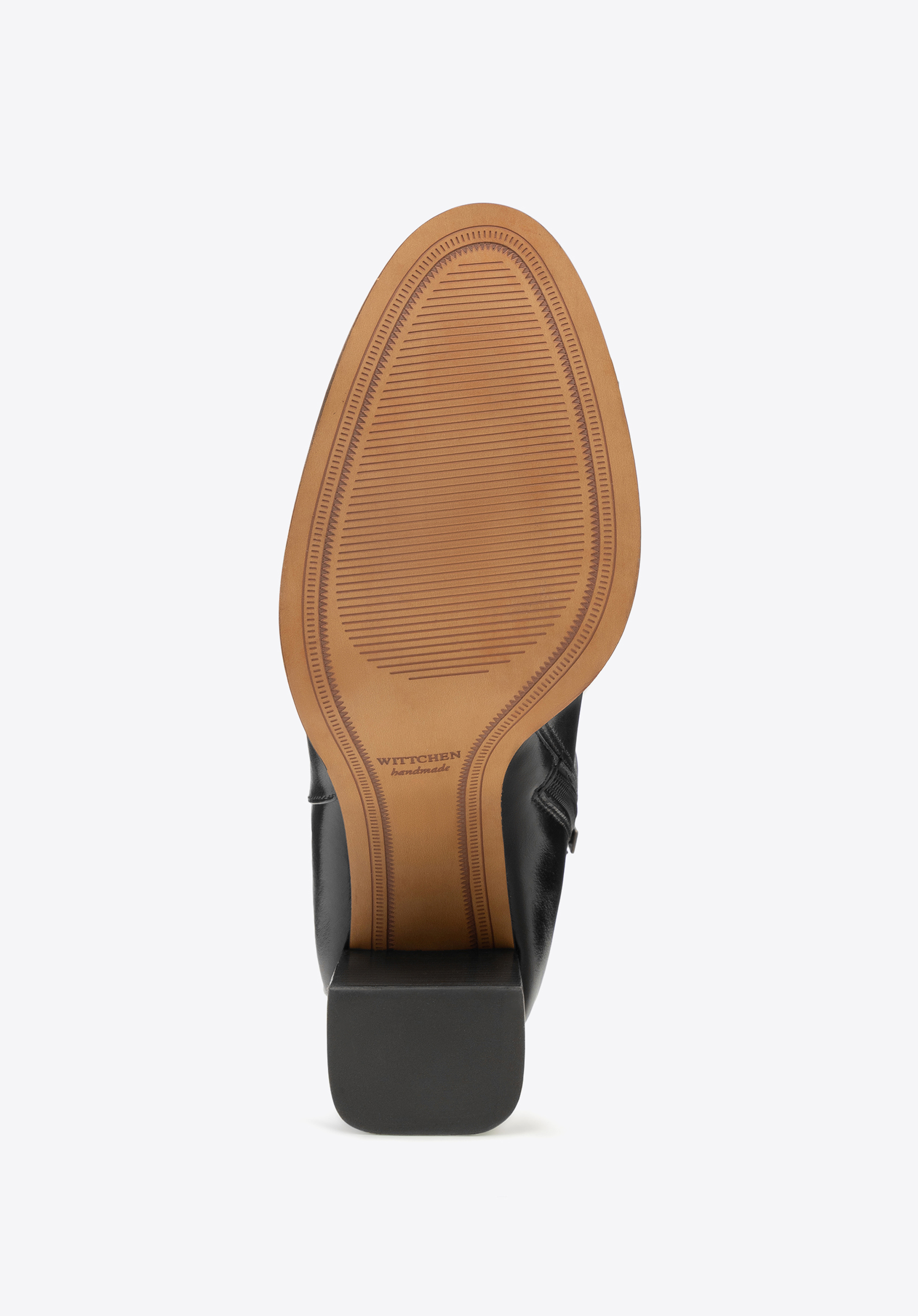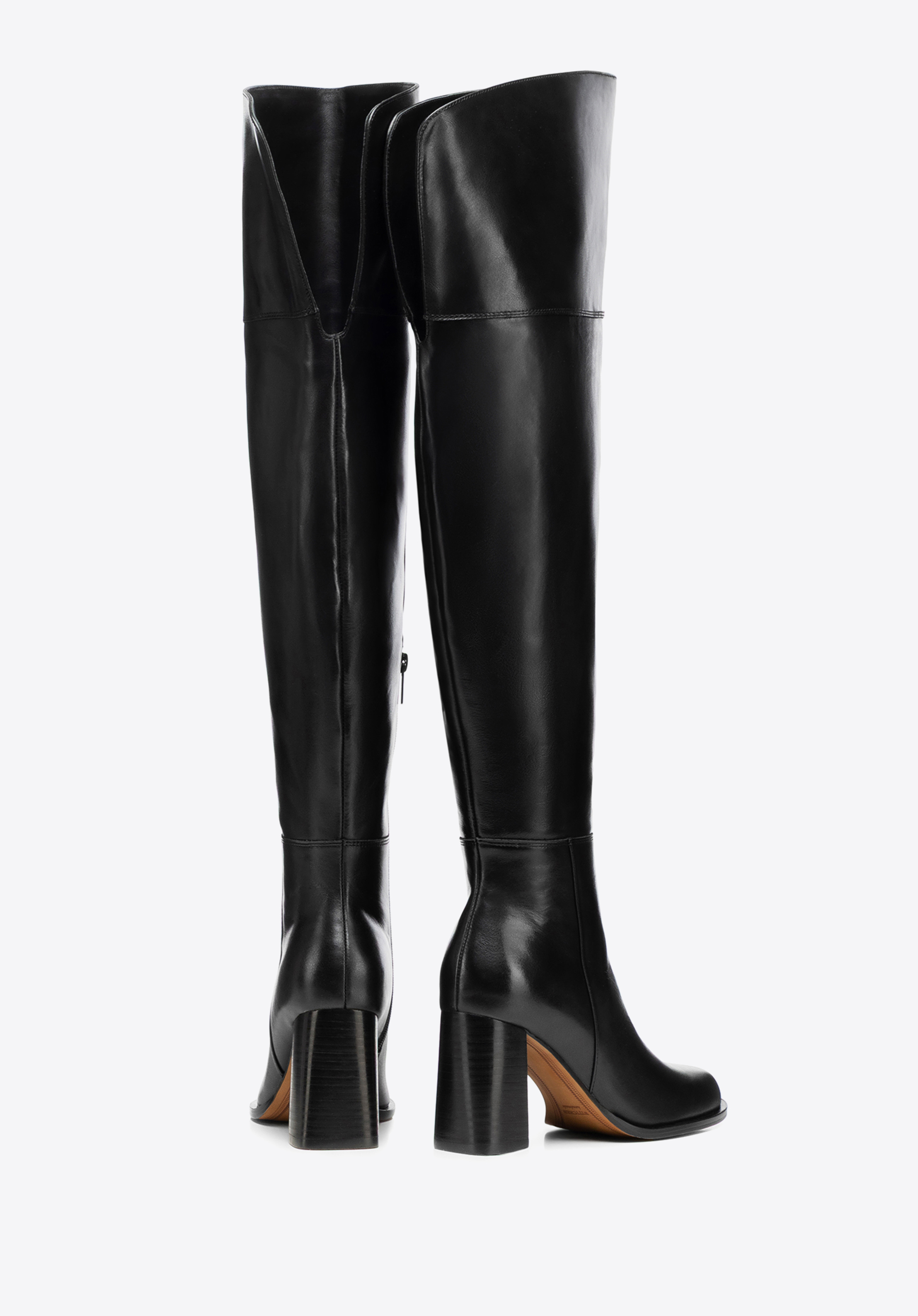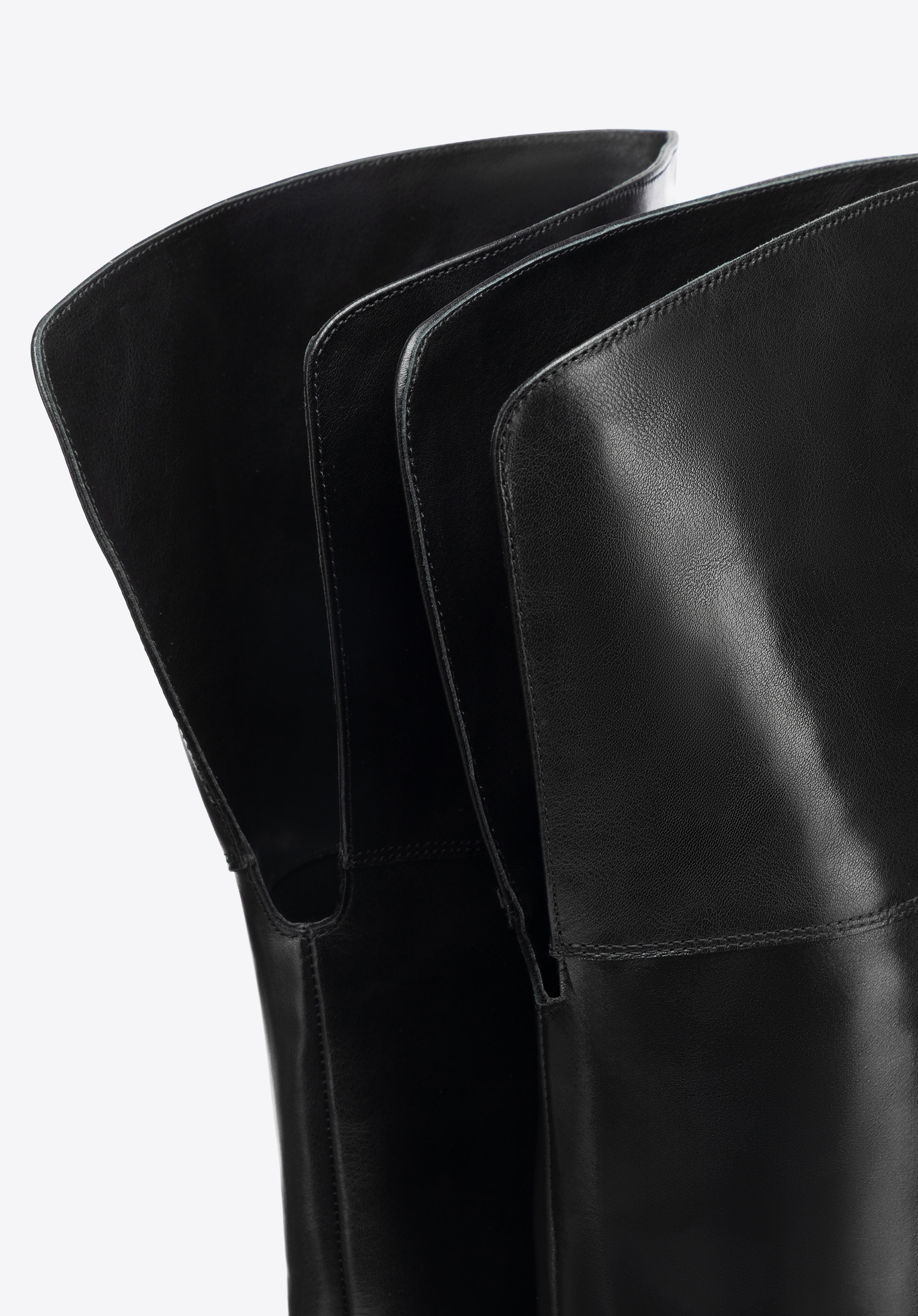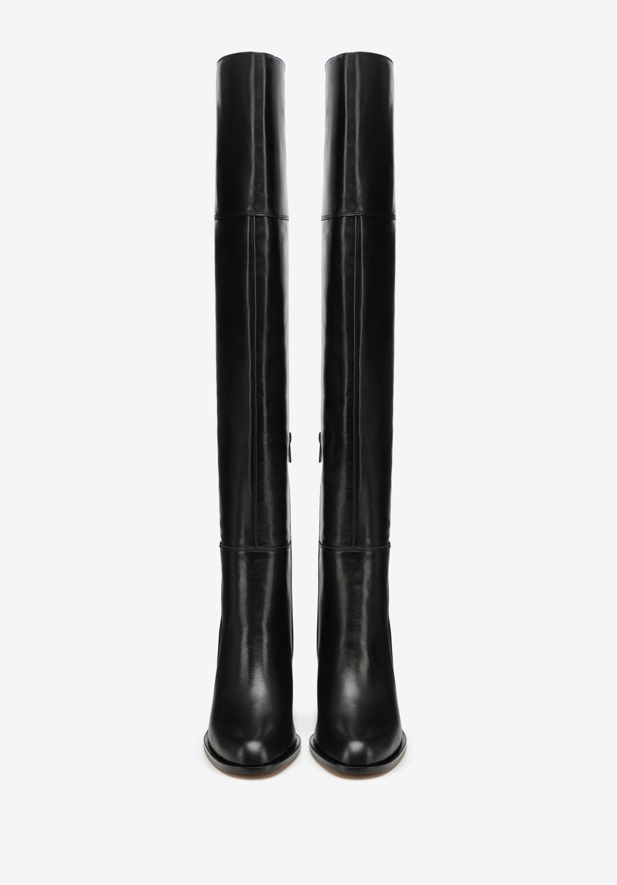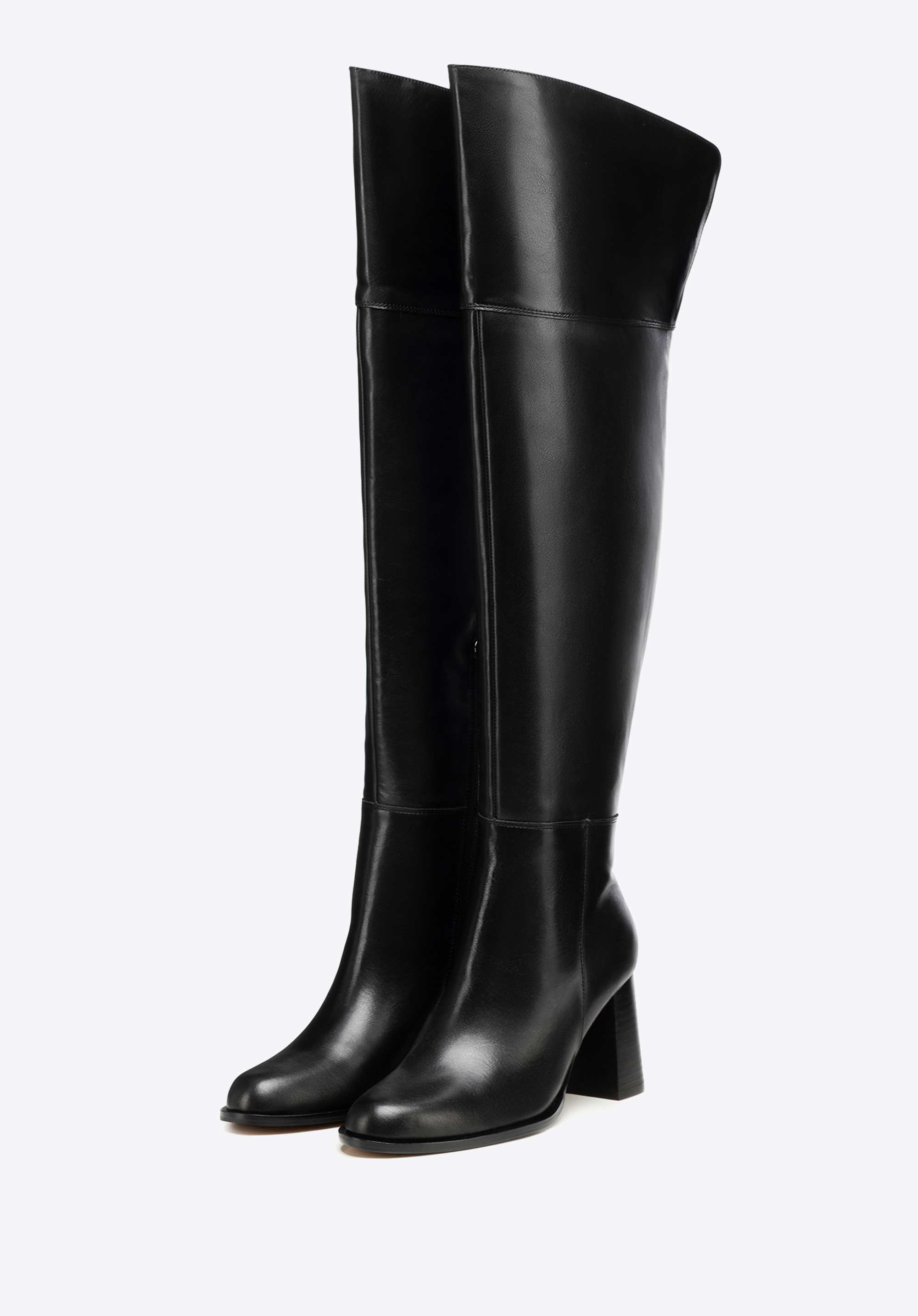 Високі чоботи вище коліна, які вражають поєднанням елегантності, комфорту та сучасного шику. Виготовлені з натуральної яловичої шкіри, з олійною обробкою та благородним полиском, вони випромінюють розкішний характер, а водночас є стійкими до щоденного використання. Міцний каблук-стовпчик гарантує комфорт протягом усього дня, а мигдалеподібний носок витончено подовжує стопу, додаючи силуету легкості та елегантності. Бічна блискавка дозволяє швидко взути чоботи, а можливість відвернути халяву додає модного акценту та дозволяє створювати різноманітні стильні образи.
