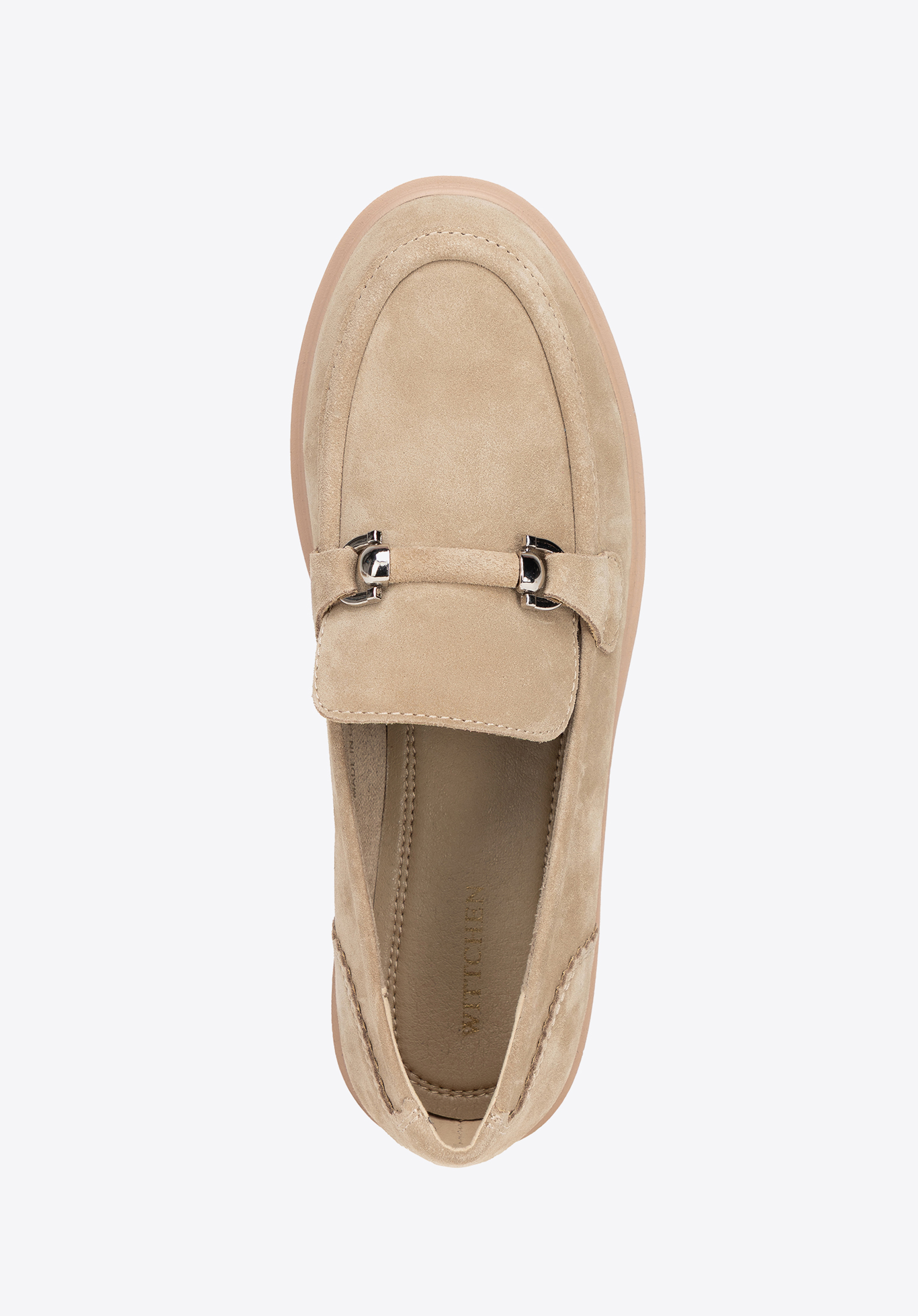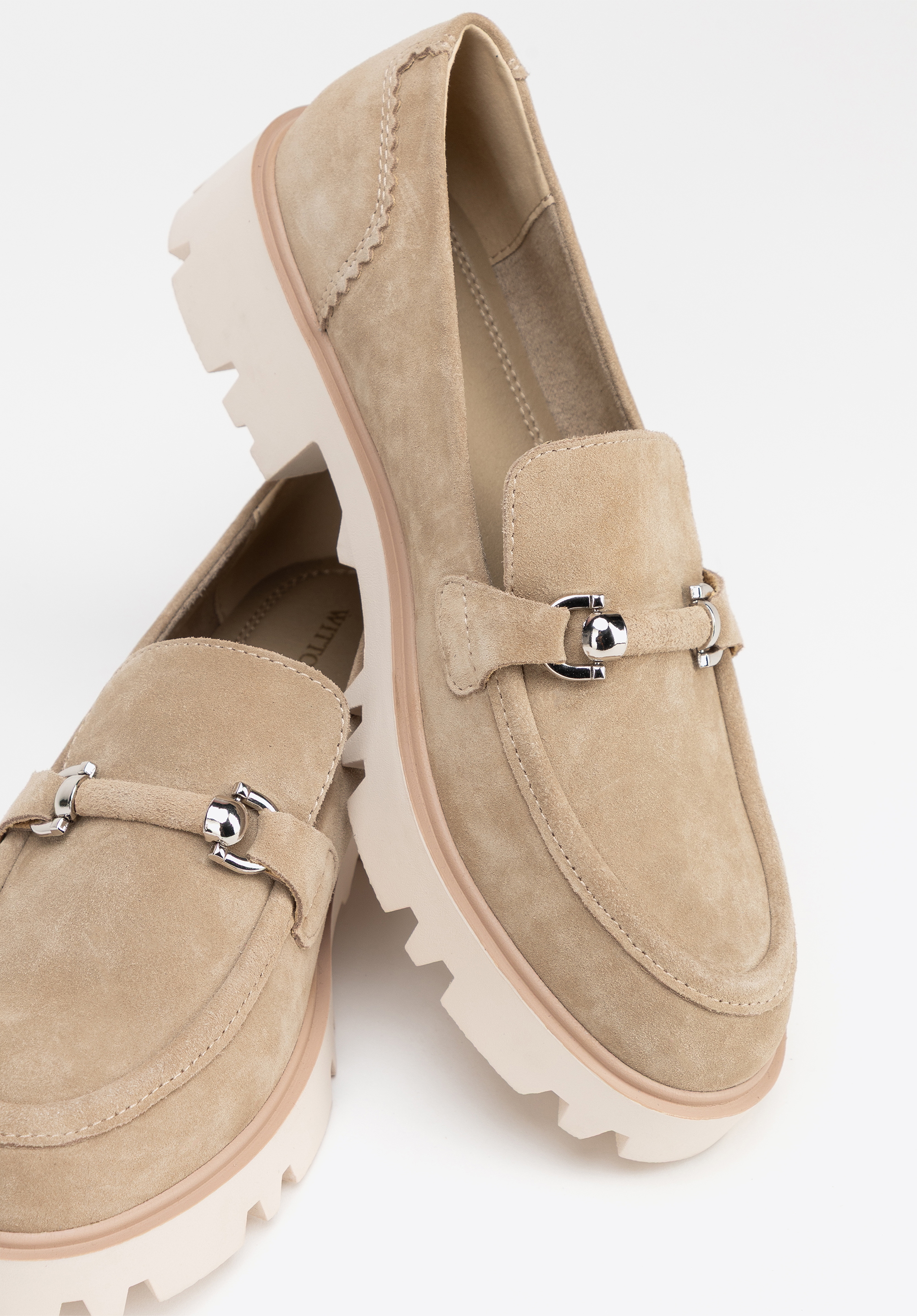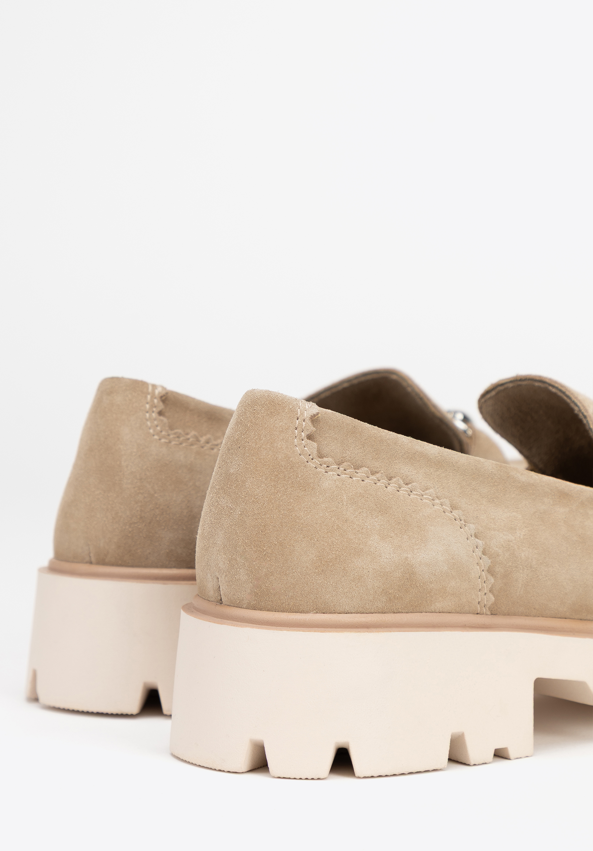 Ці лофери поєднують класичний стиль із сучасними нотками. Виготовлені з м’якої замшевої шкіри , вони випромінюють витончену елегантність, а блискуча пряжка додає витончений акцент. Сліп-он дизайн забезпечує зручність, а закруглений носок забезпечує комфорт протягом усього дня. Гусенична підошва не тільки підкреслює модний вигляд, але й підвищує стабільність і впевненість на кожному кроці. Інтер’єр оброблений штучною шкірою та м’якою мікрофіброю , що забезпечує комфорт навіть під час тривалого носіння.