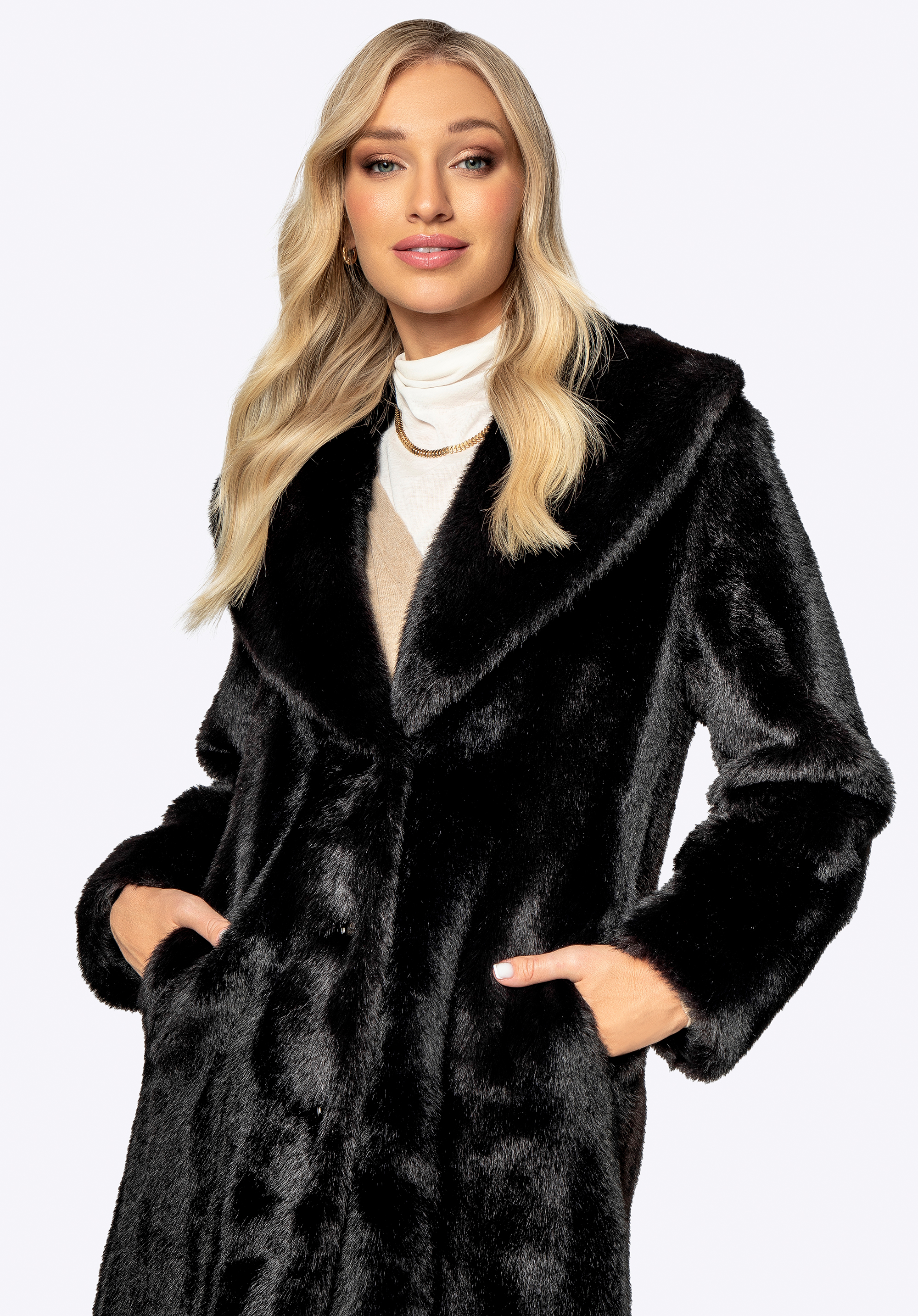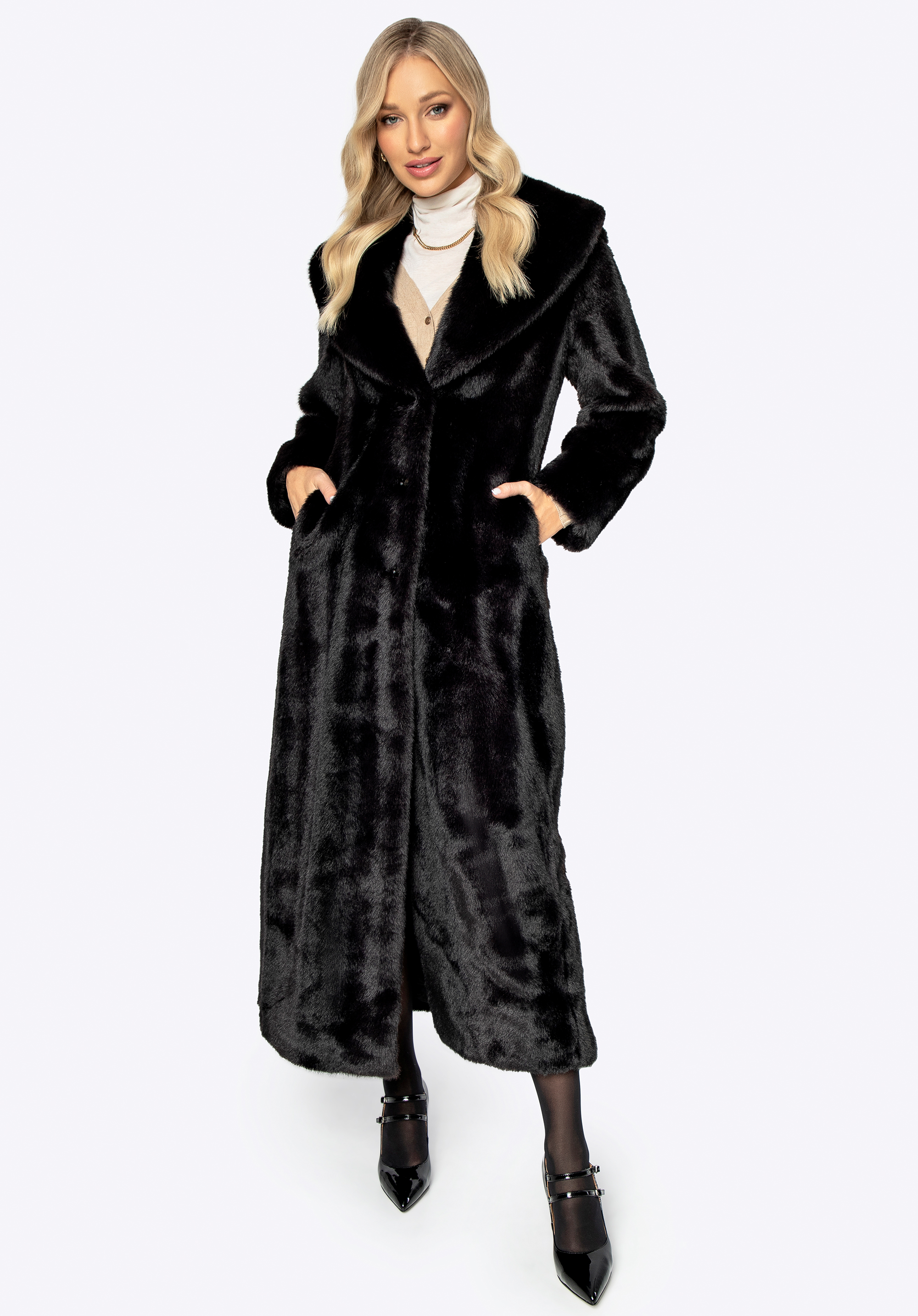Відчуйте розкіш із нашою останньою сенсацією сезону: жіноче пальто зі штучного хутра преміум-класу. Це вишукане поєднання позачасової елегантності та сучасного стилю обов’язково захопить вас і стане центром вашого гардеробу. Класичний комір з лацканами додає елегантності, забезпечуючи додаткове тепло та комфорт. Довгий фасон пальто підкреслює елегантність, а також ефективно захищає від холоду, забезпечуючи відчуття вишуканості та комфорту в будь-якій ситуації. Дві практичні глибокі кишені не тільки додають стилю, але й дозволяють зберігати необхідні речі. Бездоганна робота та висока якість використаних матеріалів гарантують, що це пальто супроводжуватиме вас довгі роки, забезпечуючи не тільки унікальний зовнішній вигляд, але й екологічне задоволення.