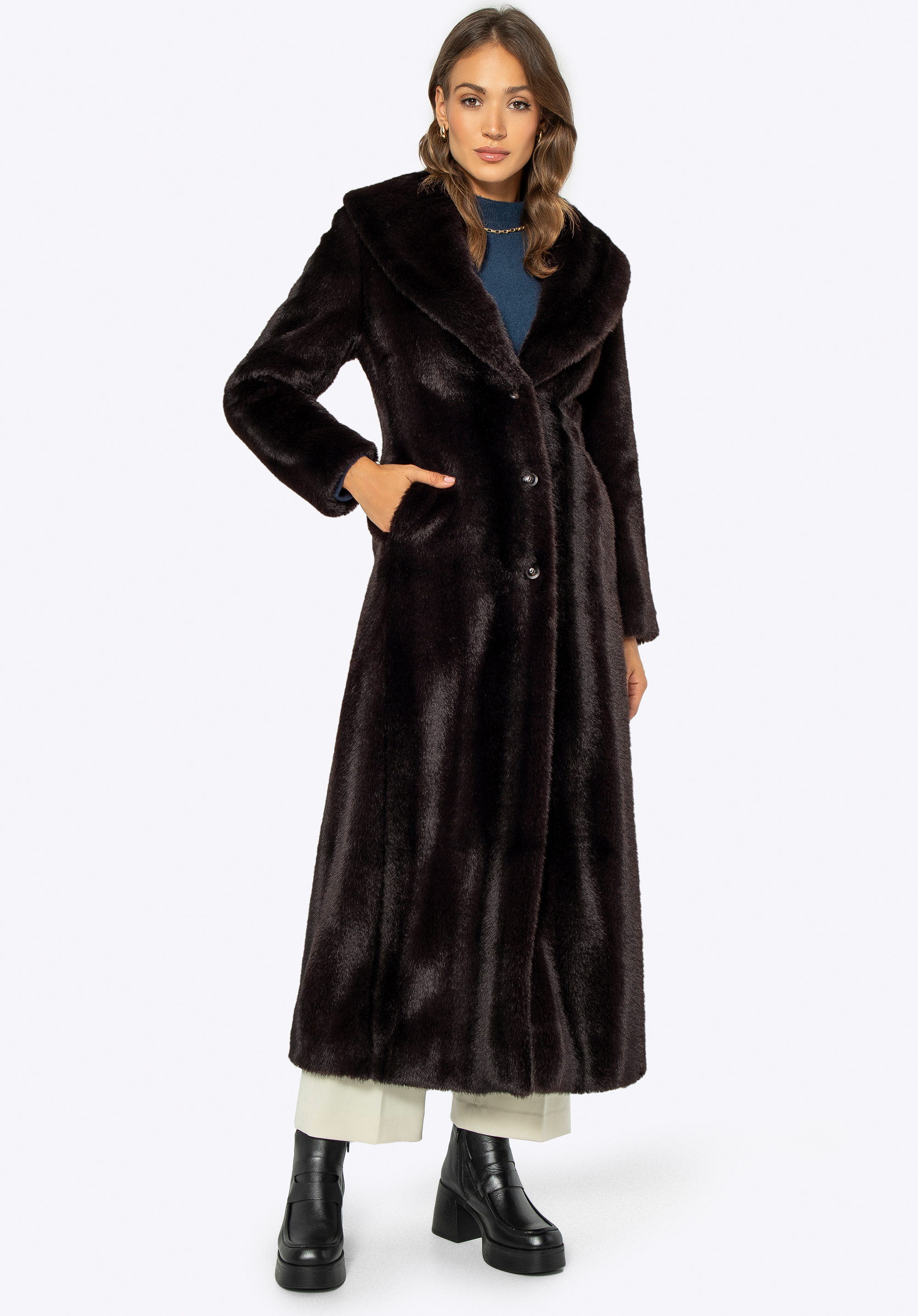 Відчуйте розкіш із нашою останньою сенсацією сезону: жіноче пальто зі штучного хутра преміум-класу. Це вишукане поєднання позачасової елегантності та сучасного стилю обов’язково захопить вас і стане центром вашого гардеробу. Класичний комір з лацканами додає елегантності, забезпечуючи додаткове тепло та комфорт. Довгий фасон пальто підкреслює елегантність, а також ефективно захищає від холоду, забезпечуючи відчуття вишуканості та комфорту в будь-якій ситуації. Дві практичні глибокі кишені не тільки додають стилю, але й дозволяють зберігати необхідні речі. Бездоганна робота та висока якість використаних матеріалів гарантують, що це пальто супроводжуватиме вас довгі роки, забезпечуючи не тільки унікальний зовнішній вигляд, але й екологічне задоволення.