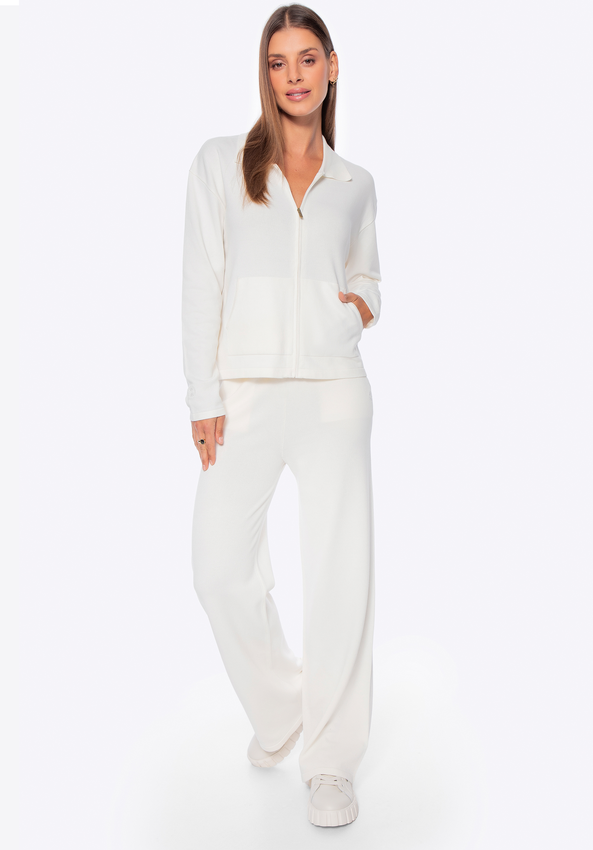 Цей светр – ідеальне поєднання повсякденного комфорту та вишуканого стилю. М'яка , легка віскоза з домішкою нейлону ніжно драпірується по фігурі, забезпечуючи комфорт на весь день. Простий комір і застібка на блискавці надають йому сучасної простоти, а дві відкриті передні кишені додають нотку практичної зручності. Вільний крій із заниженою лінією плечей ледь помітно підкреслює силует і забезпечує повну свободу рухів. Вишитий логотип на правому рукаві – елегантна деталь, яка відображає увагу до якості в кожному стібку.