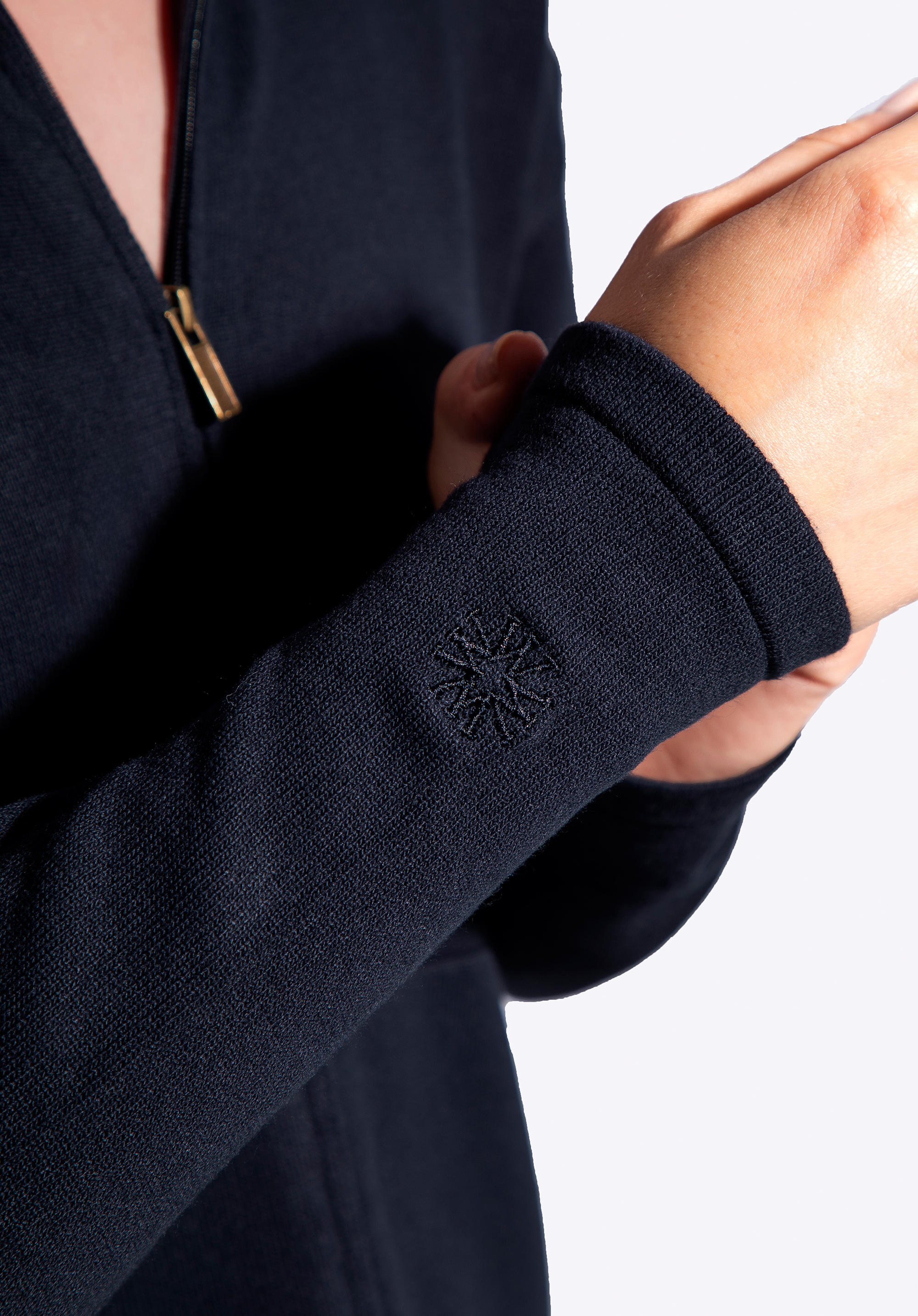 Цей светр – ідеальне поєднання повсякденного комфорту та вишуканого стилю. М'яка , легка віскоза з домішкою нейлону ніжно драпірується по фігурі, забезпечуючи комфорт на весь день. Простий комір і застібка на блискавці надають йому сучасної простоти, а дві відкриті передні кишені додають нотку практичної зручності. Вільний крій із заниженою лінією плечей ледь помітно підкреслює силует і забезпечує повну свободу рухів. Вишитий логотип на правому рукаві – елегантна деталь, яка відображає увагу до якості в кожному стібку.
