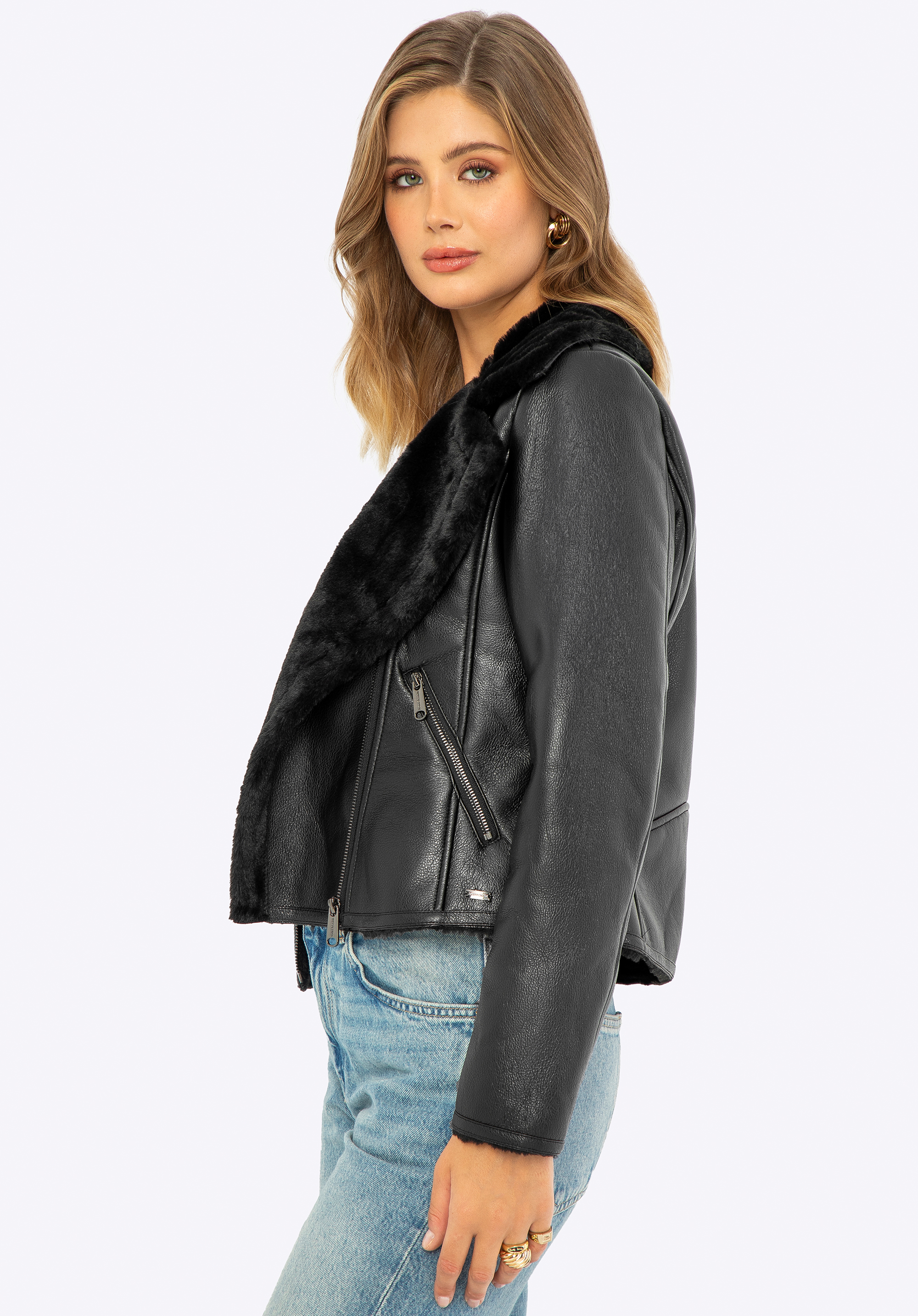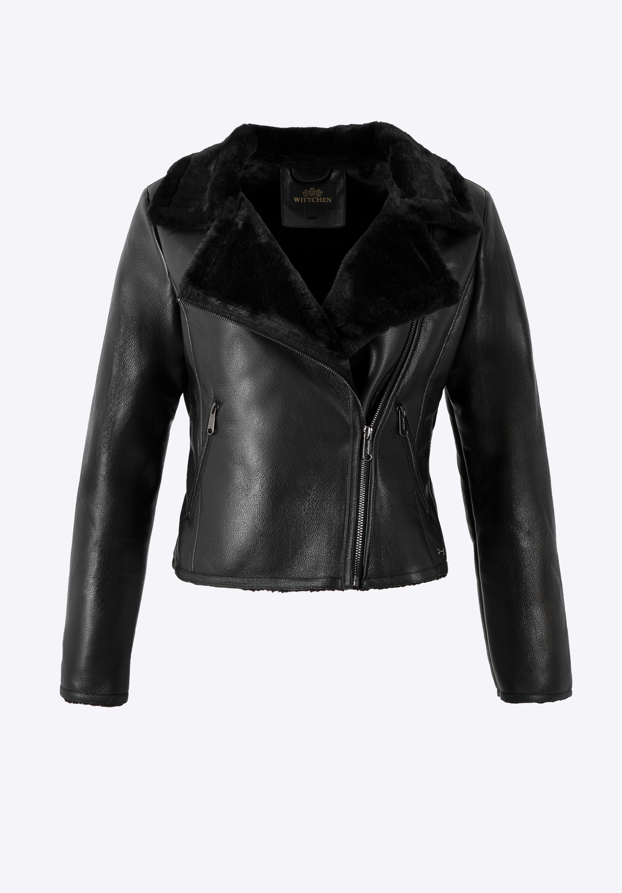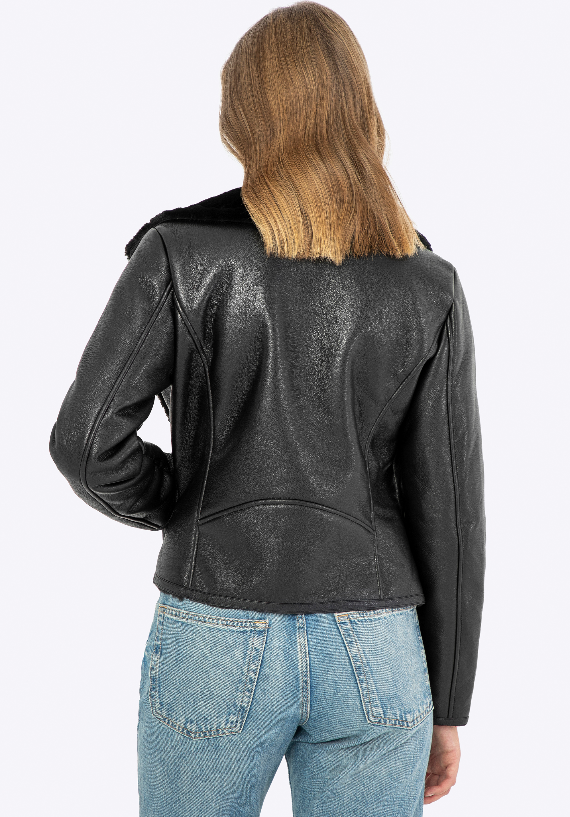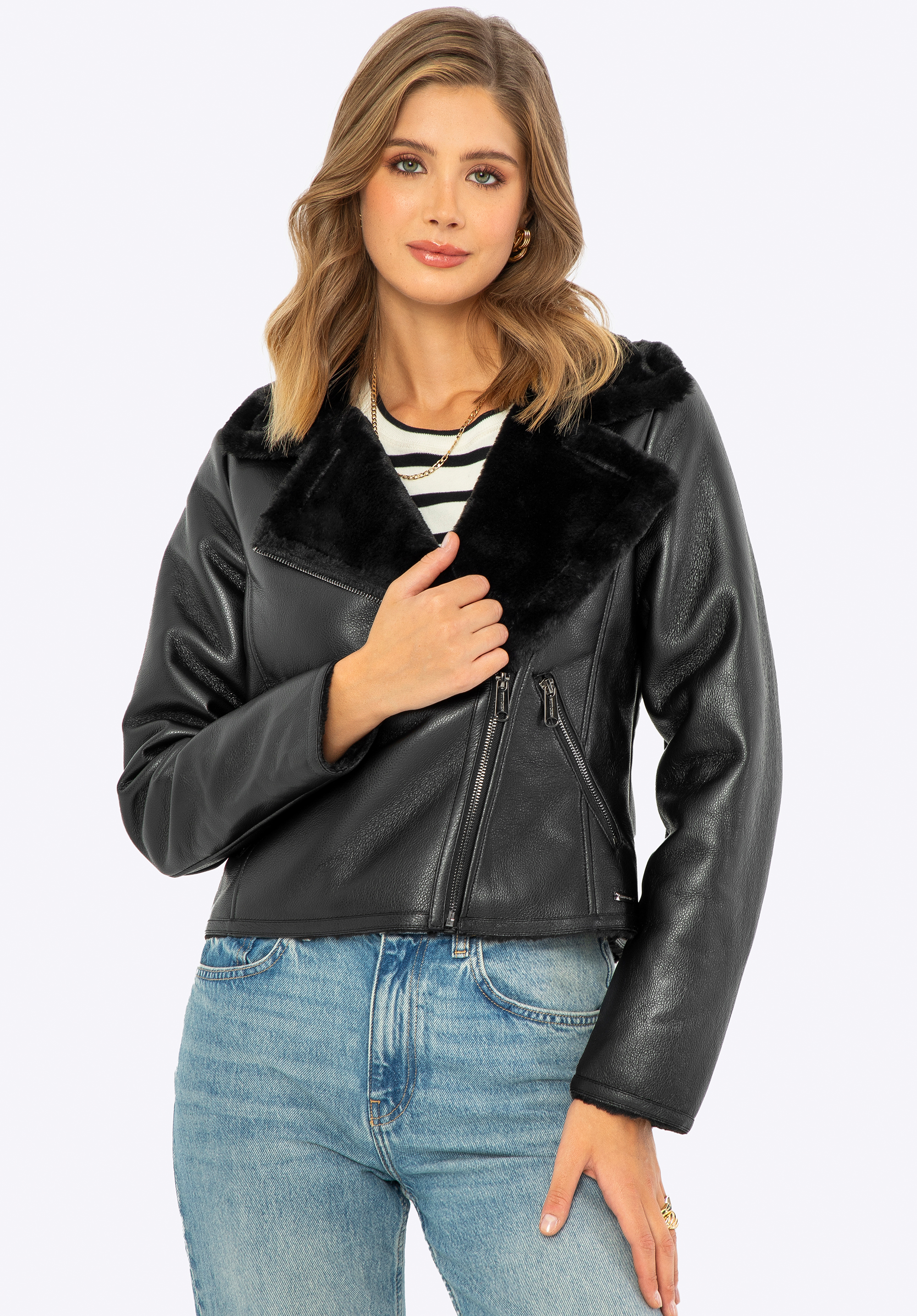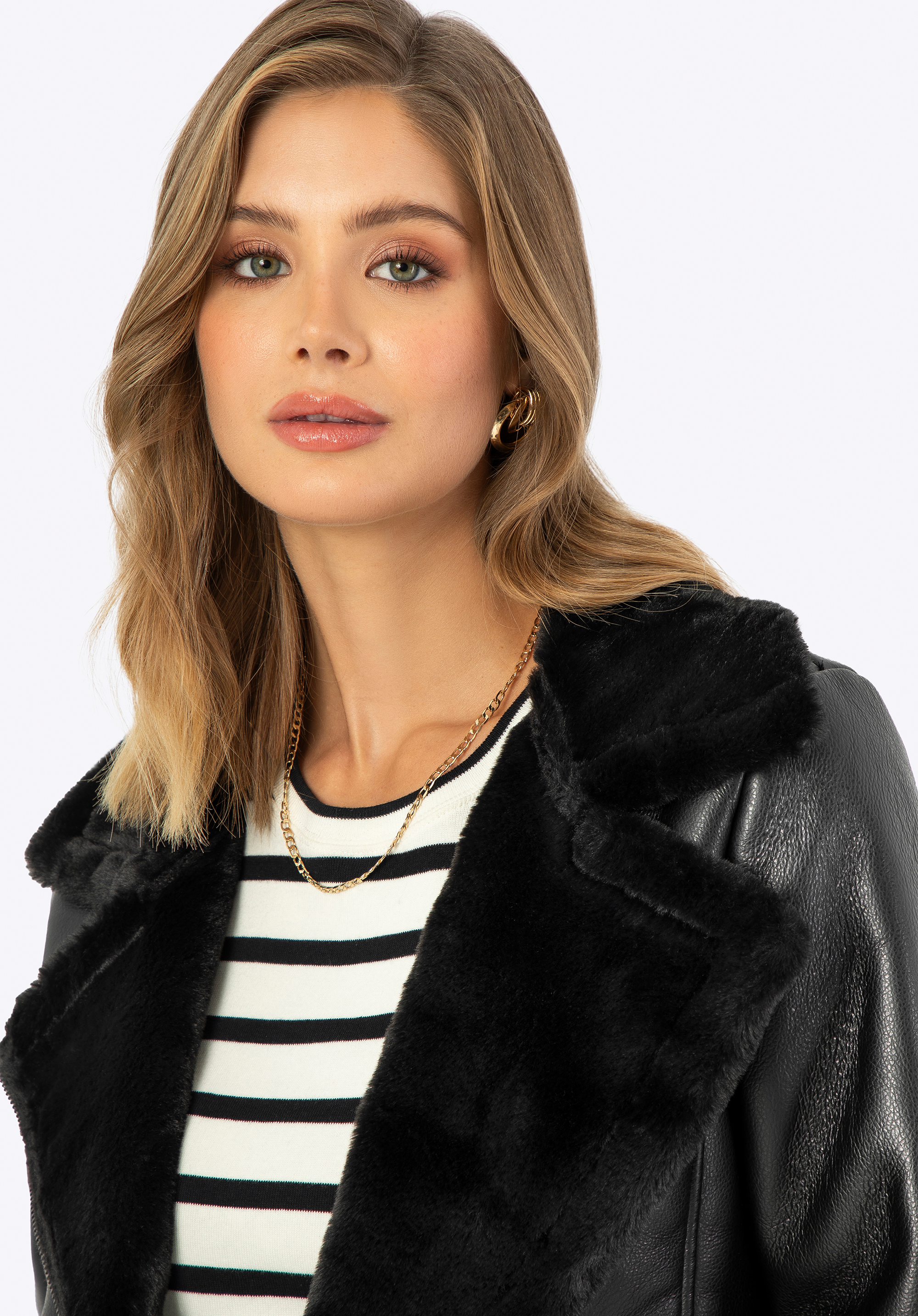Ось байкерська куртка, яка поєднує в собі все, що вам подобається в моді: сучасний дизайн, комфорт і елегантність. Ця жіноча куртка з екошкіри - ідеальний вибір для жінок, які хочуть виділятися не тільки стилем, але й увагою до деталей. Штучне хутро на комірі додає розкоші та тепла, ідеально підходить для холодних днів. Функціональні діагональні кишені на блискавці не тільки стильні, але й практичні, ідеально підходять для зберігання дрібниць.