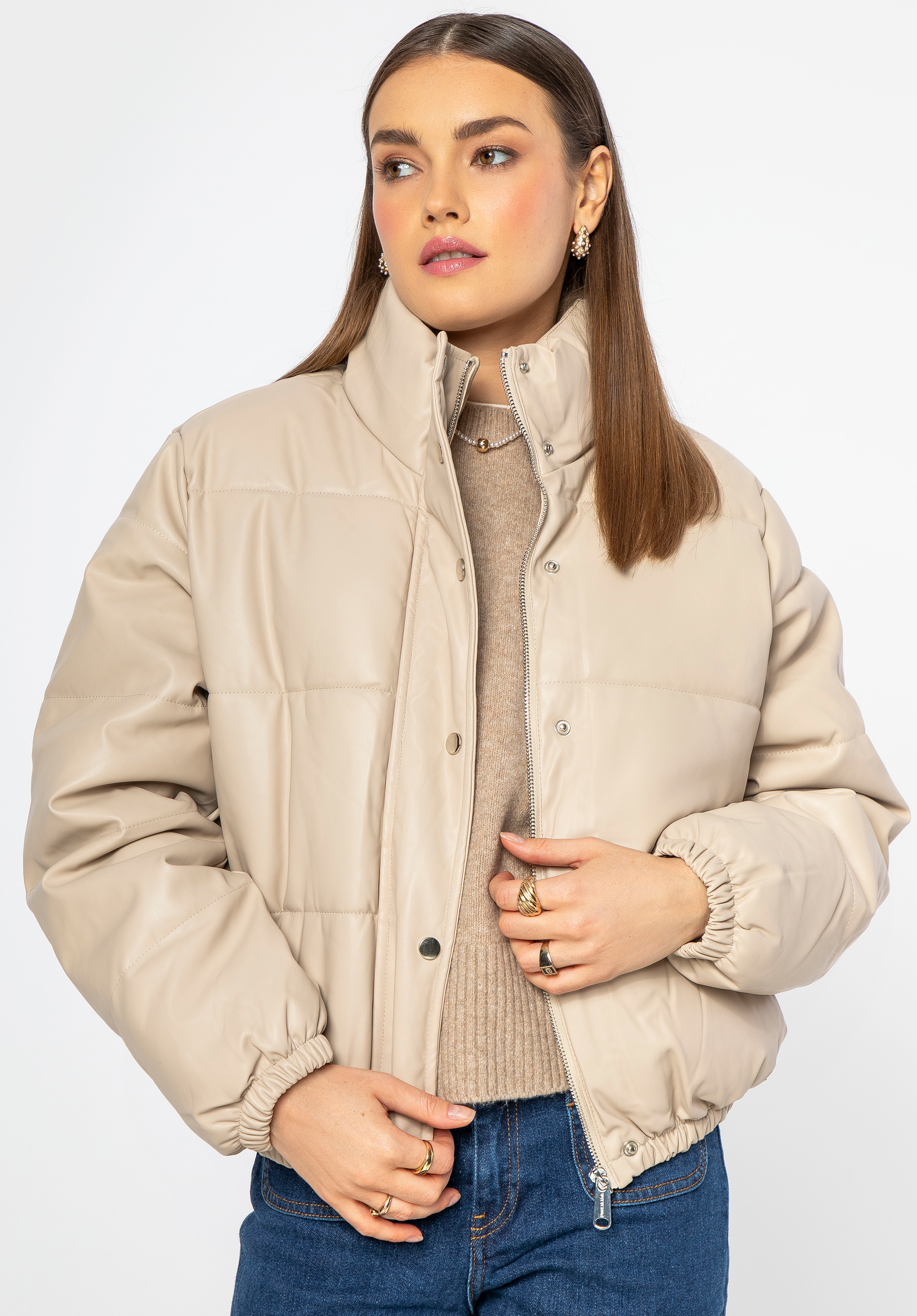 Жіноча куртка-пуховик з екошкіри світло-бежева