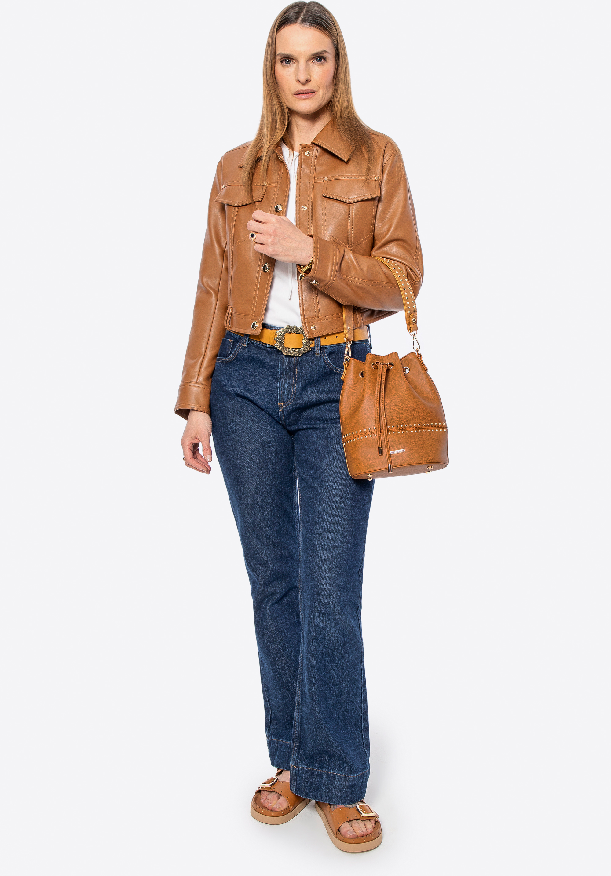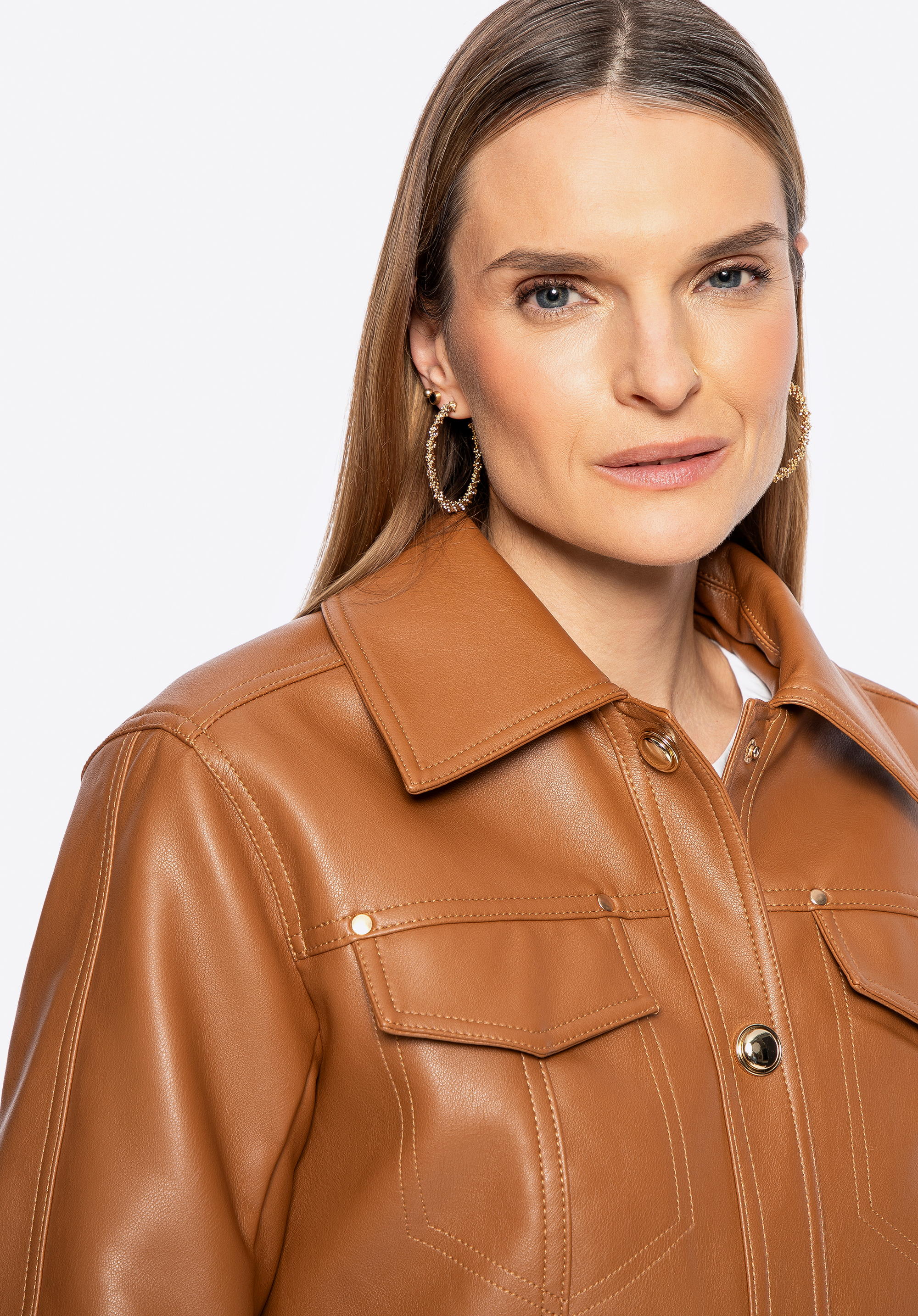 Ця куртка з екошкіри - справжня ікона стилю, яка одразу привертає увагу! Укорочений, приталений крій у поєднанні з великими, яскравими застібками створює ідеальне поєднання класики та сучасного стилю. Застібки на манжетах та декоративні нашивки на рівні грудей додають унікального штриху, а металевий логотип виробника тонко підкреслює елегантність.