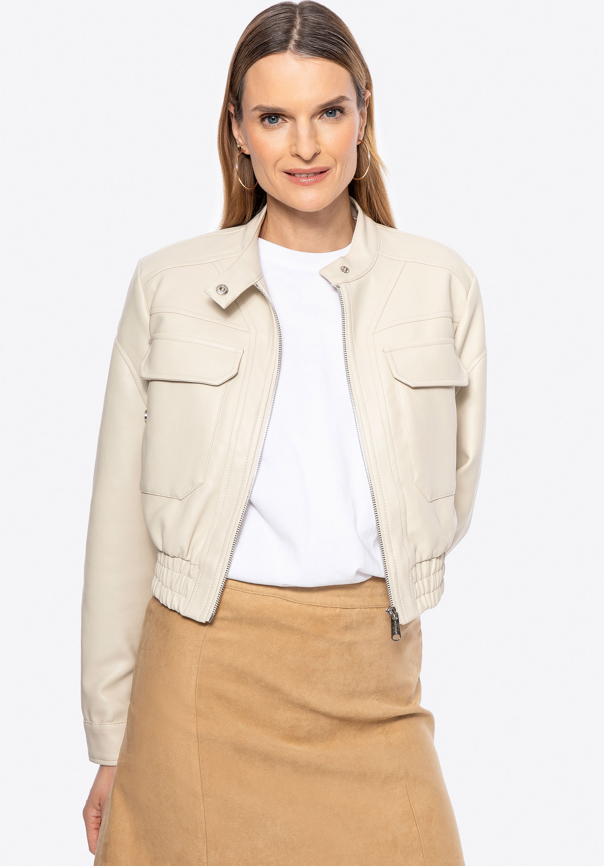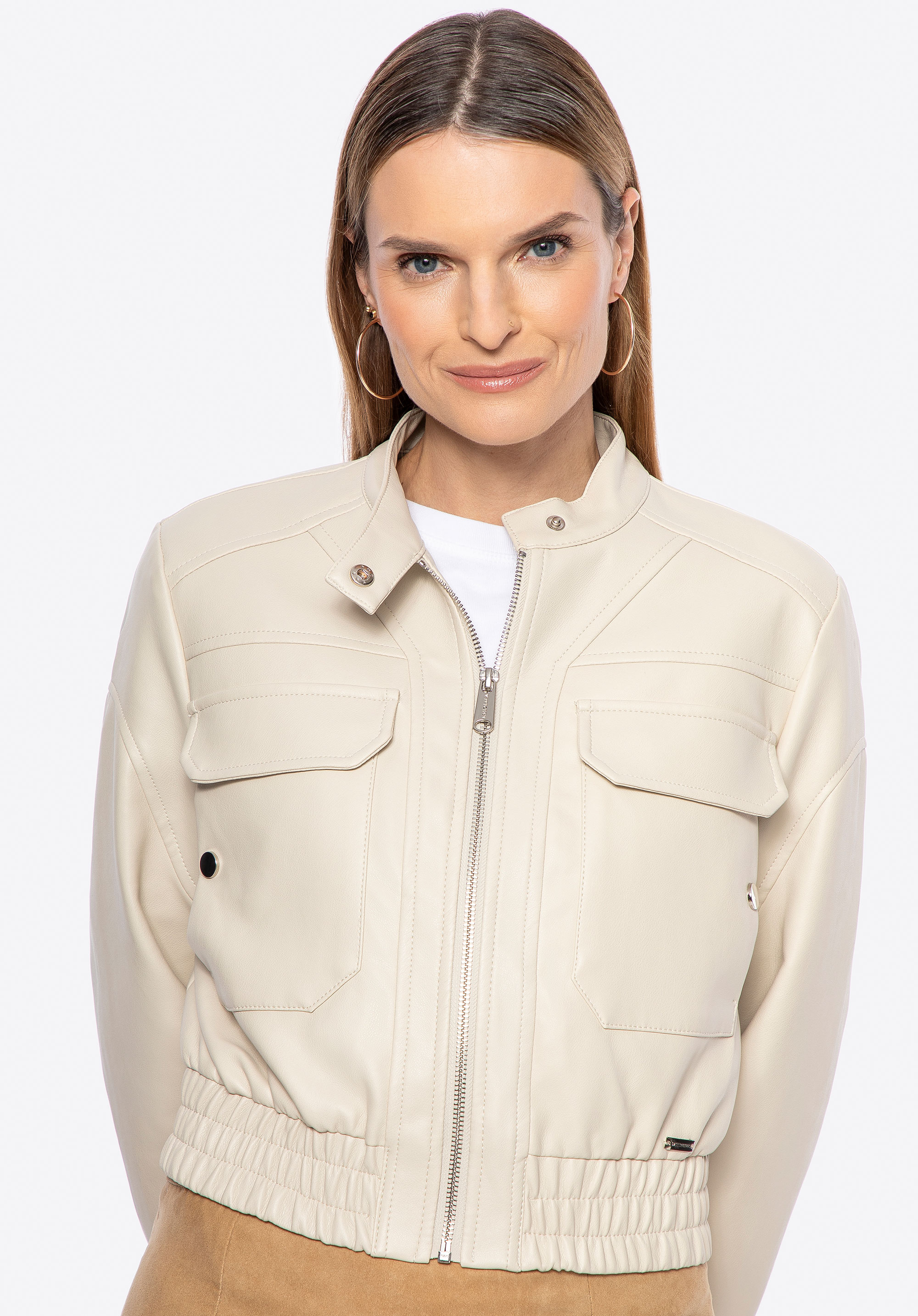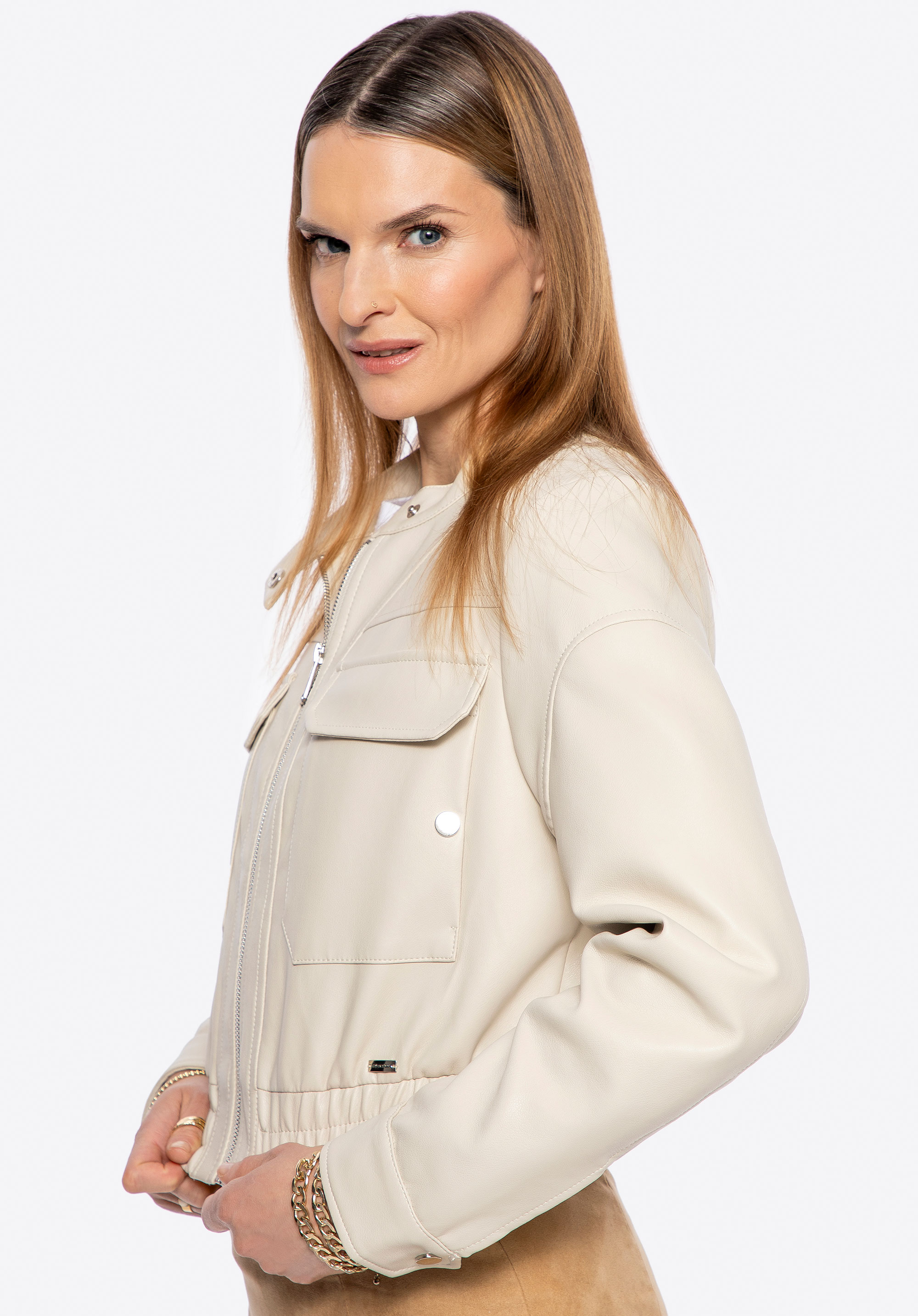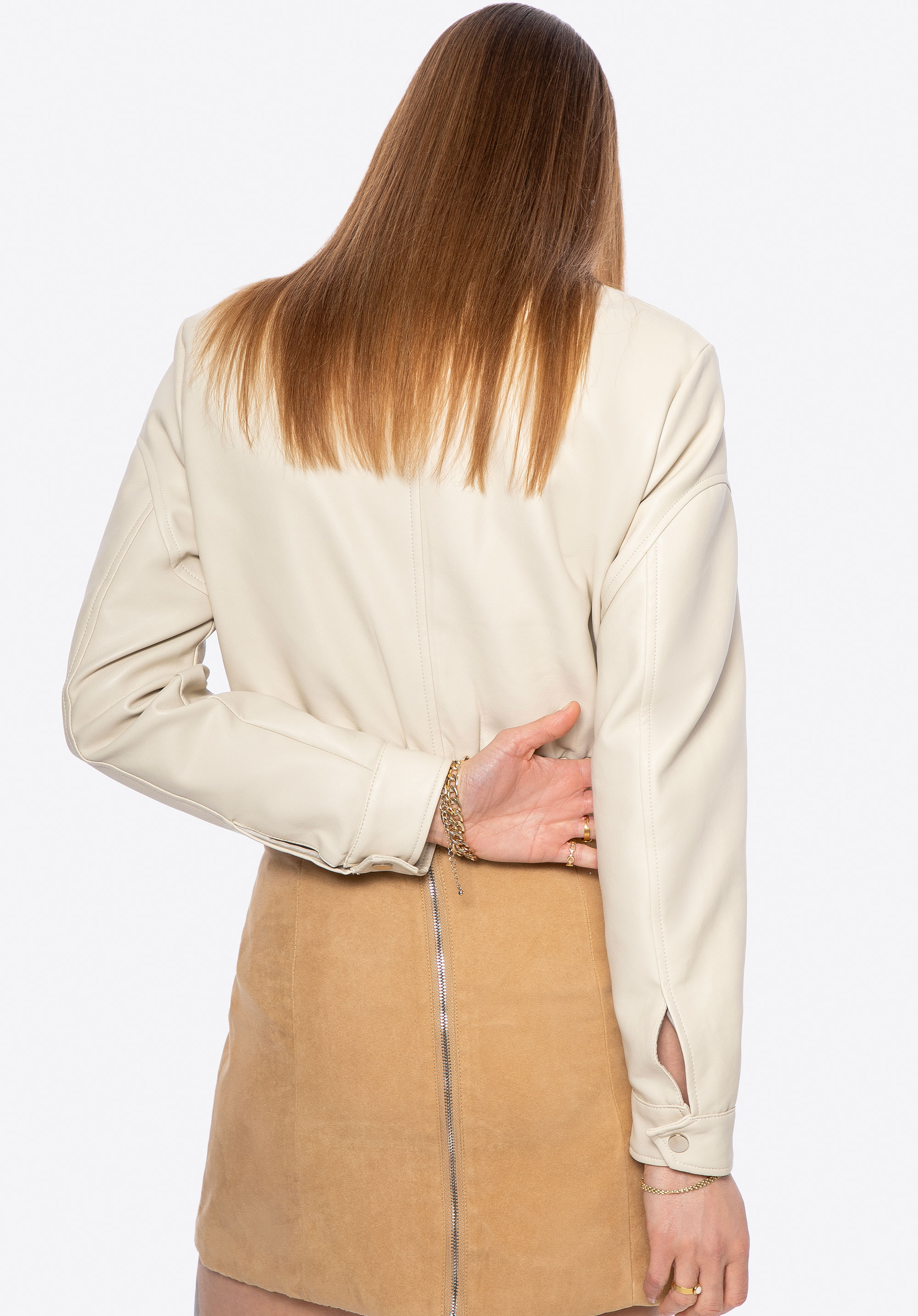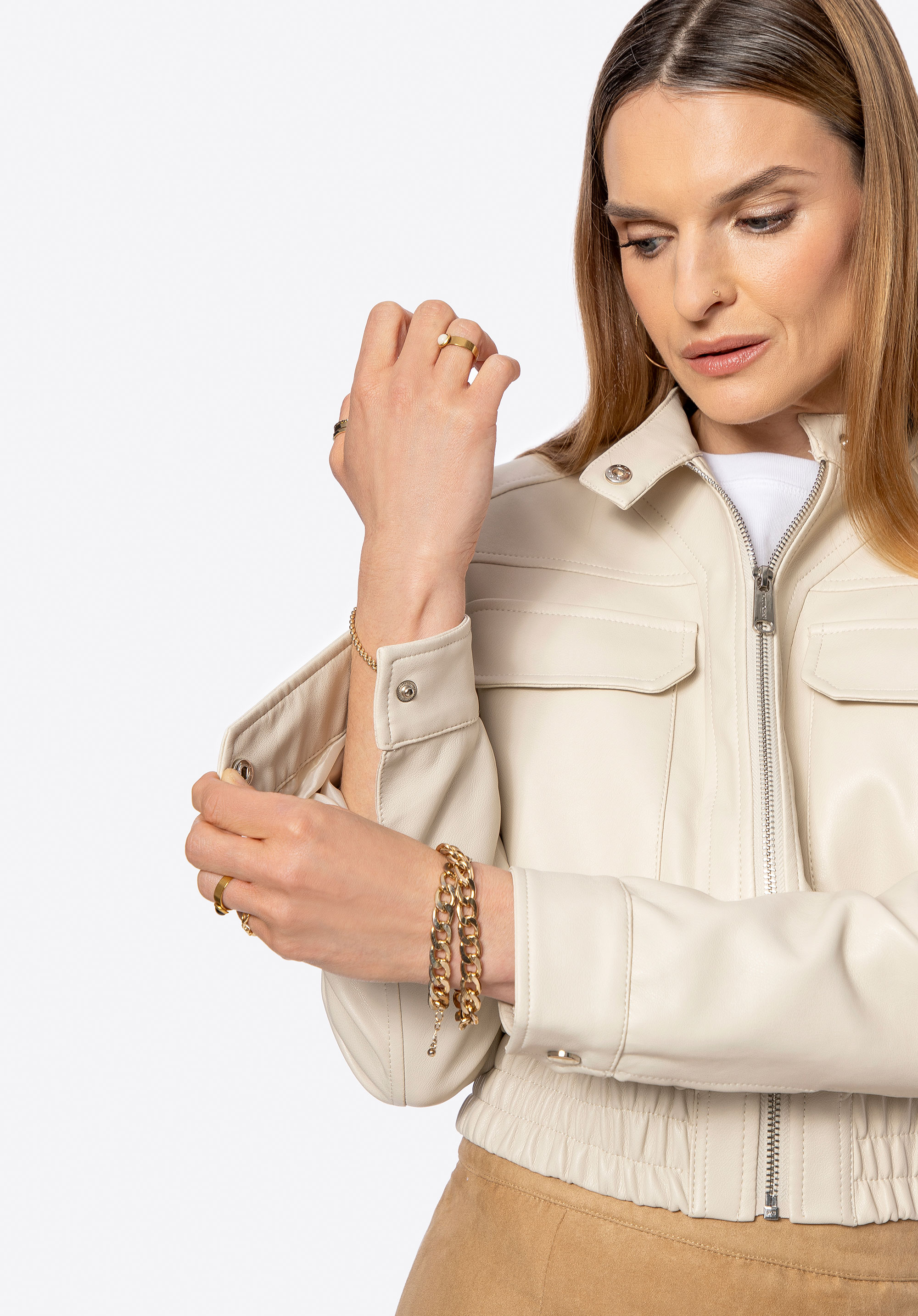 Порушуйте модні стандарти з нашою унікальною курткою з екошкіри, яка неодмінно стане вашим улюбленим предметом гардеробу! Коротка, з яскравими металевими деталями, вона дозволить вам відчувати себе особливою та впевненою кожного дня. Розстібні манжети та комір на застібці дають вам повний контроль над стилем та комфортом, а еластична резинка на подолі підкреслює ваш силует, надаючи неперевершеного вигляду. Декоративні нашивки та вертикальні кишені на кнопках додають куртці індивідуальності, роблячи її річчю, що привертає увагу.