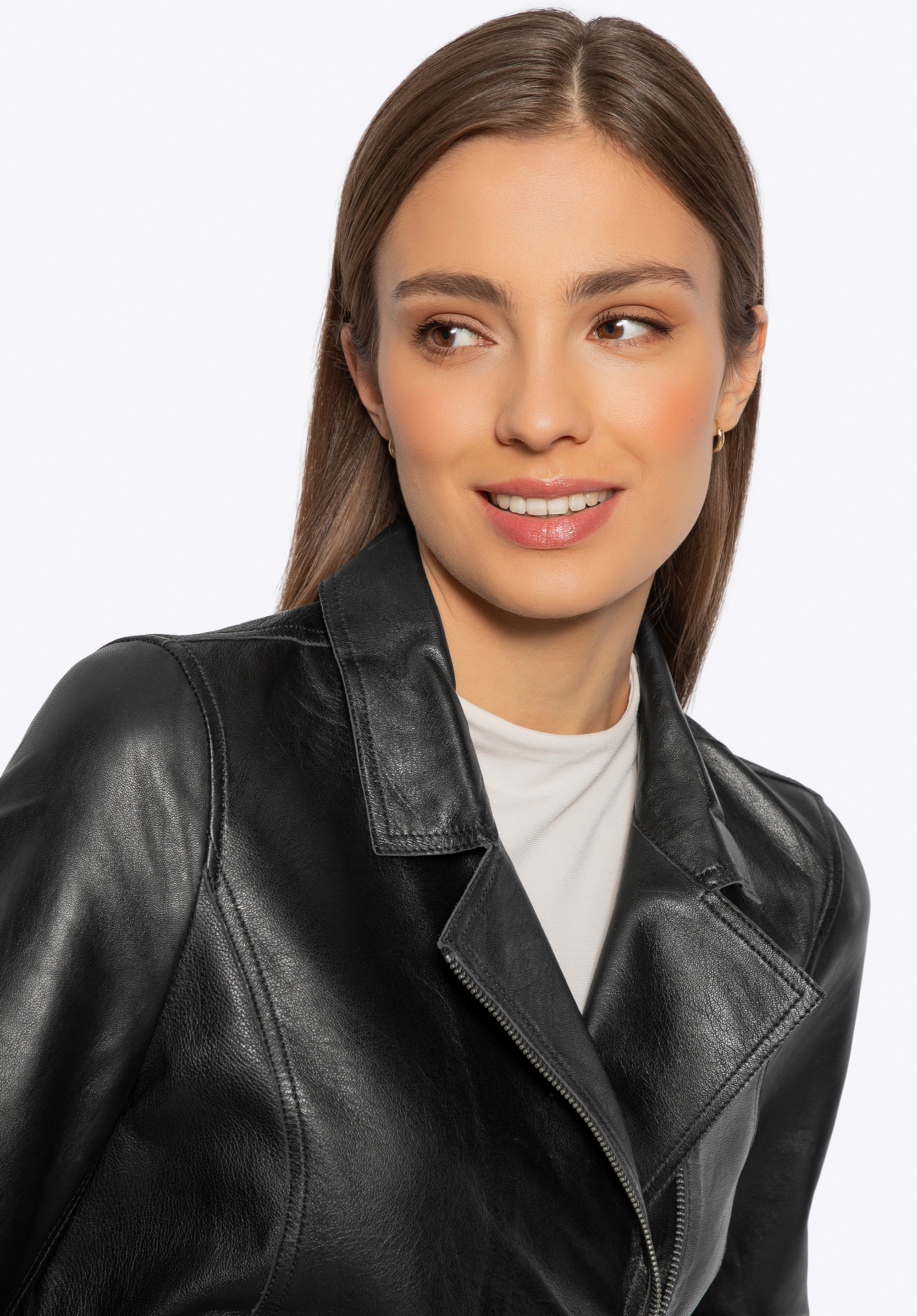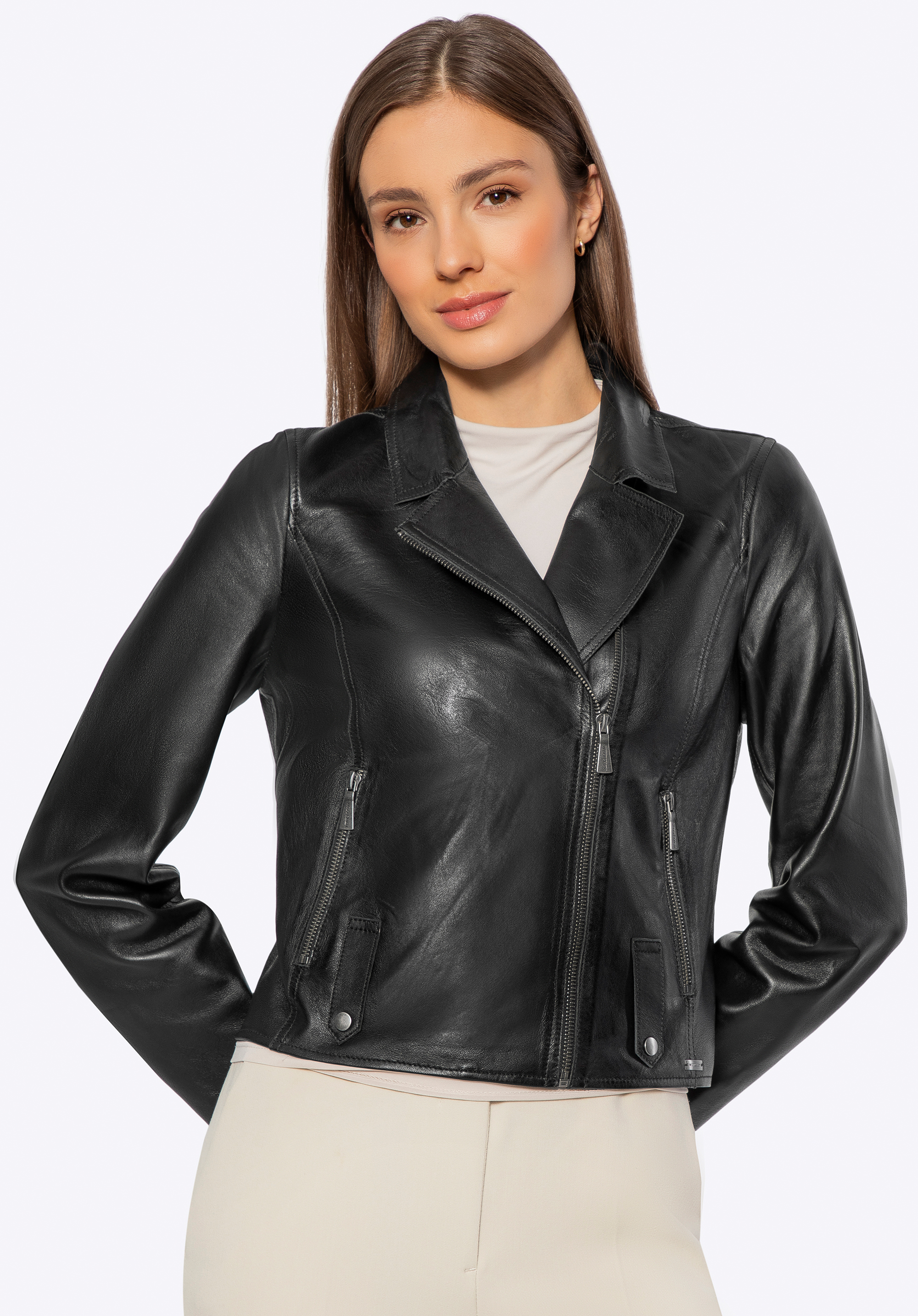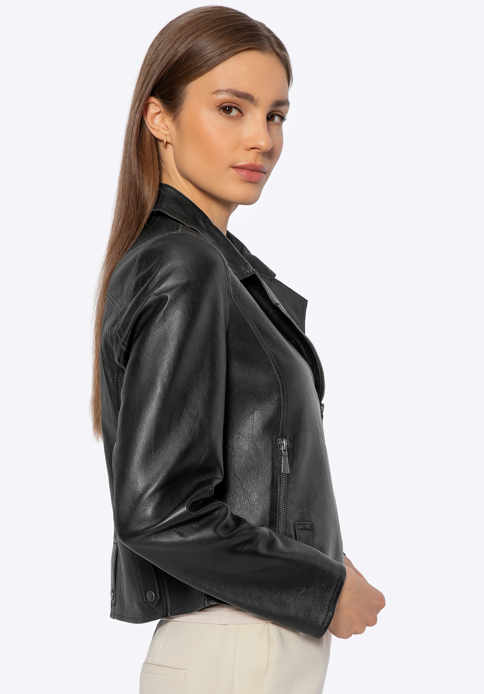 Елегантність і функціональність в одному – ця жіноча куртка – це інвестиція в стиль, який ніколи не виходить з моди. Виготовлена з натуральної овечої шкіри, вона поєднує вишукану естетику з практичністю. Її ніжна замшева текстура зсередини та ретельне виконання роблять куртку привабливою та забезпечують комфорт протягом усього дня.