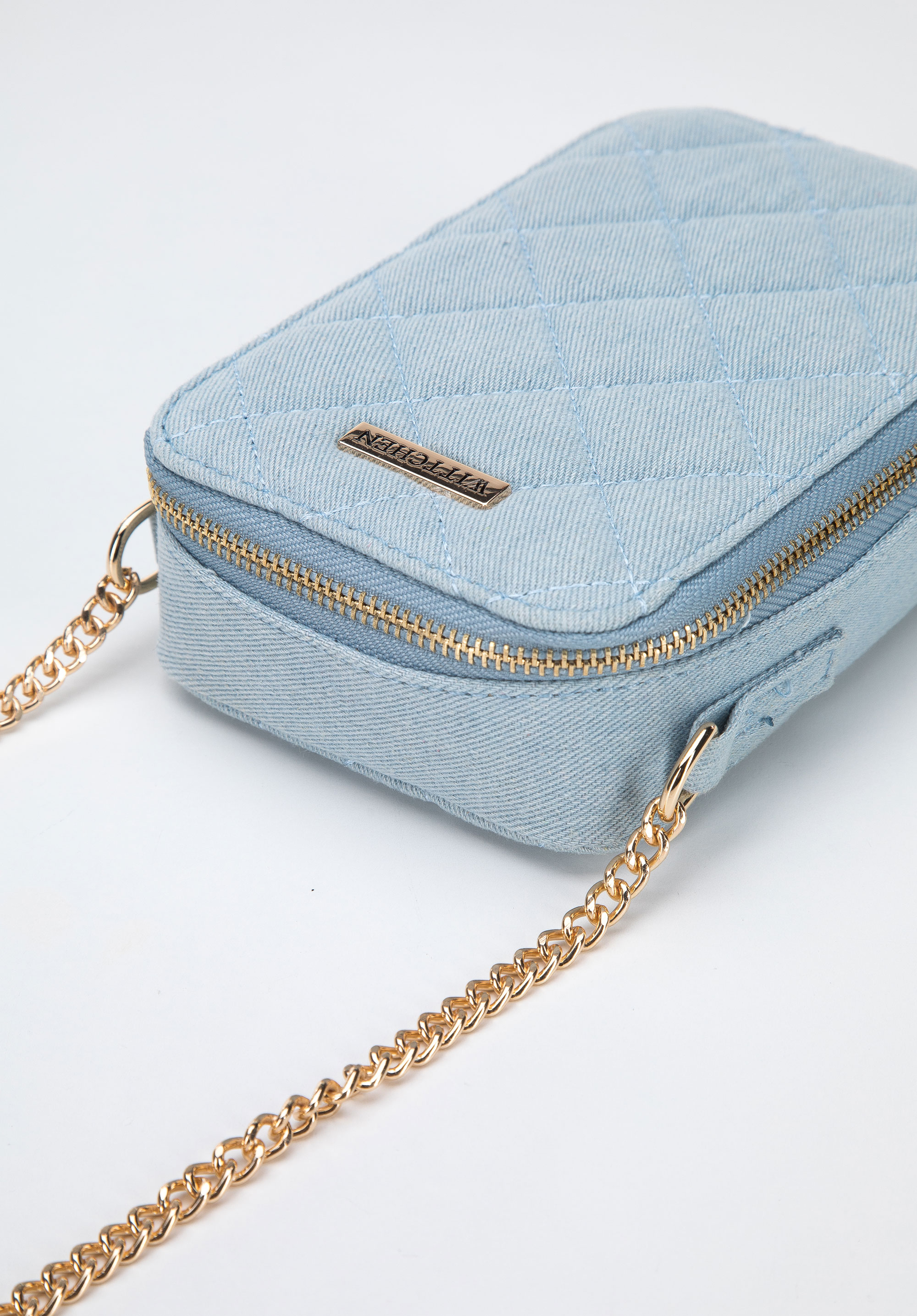 Ця стьобана сумка додасть елегантності будь-якому вашому образу. Вона виготовлена із вічного деніму, який, стьобаний спереду та ззаду, набуває нового характеру. Повсякденний денім створює цікавий контраст із елегантним ланцюжком, який додає блиску. Вона маленька, якраз для невеликого гаманця, телефону та губної помади, наприклад. Чудово виглядатиме щодня з джинсами та піджаком, а також із простим атласним платтям. Жіноча міні-сумка з стьобаного деніму на ланцюжку - практичний і елегантний аксесуар на багато випадків.