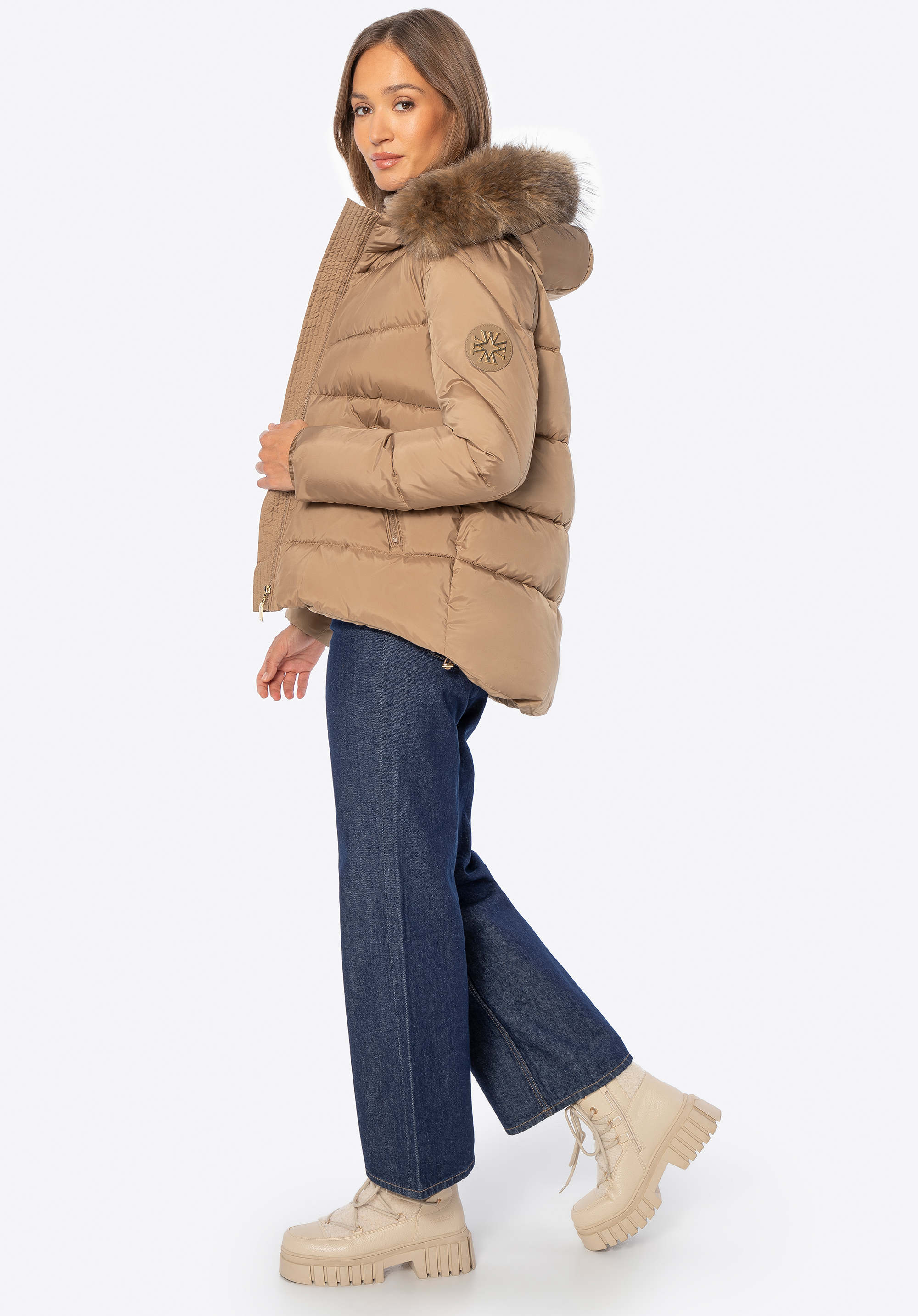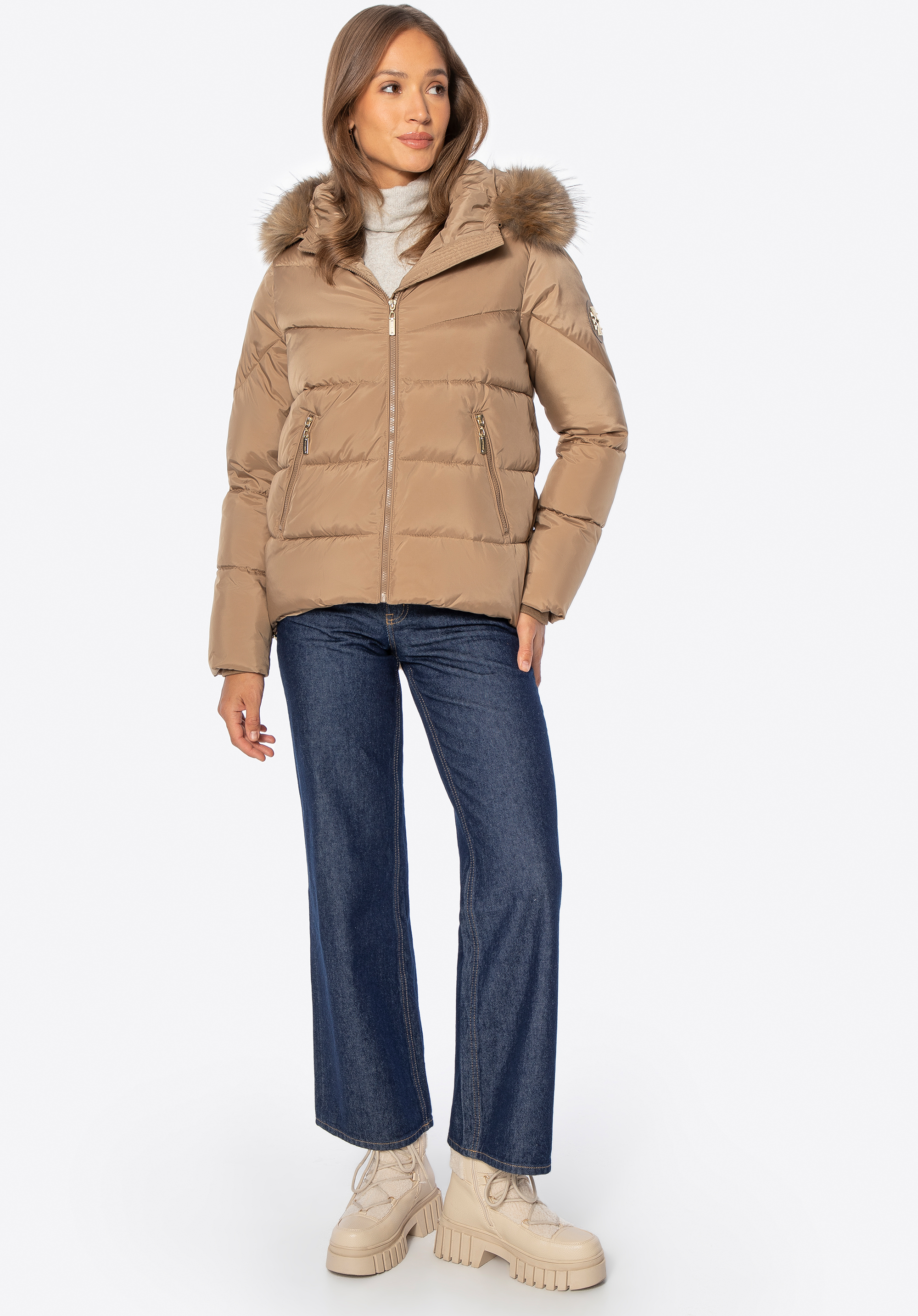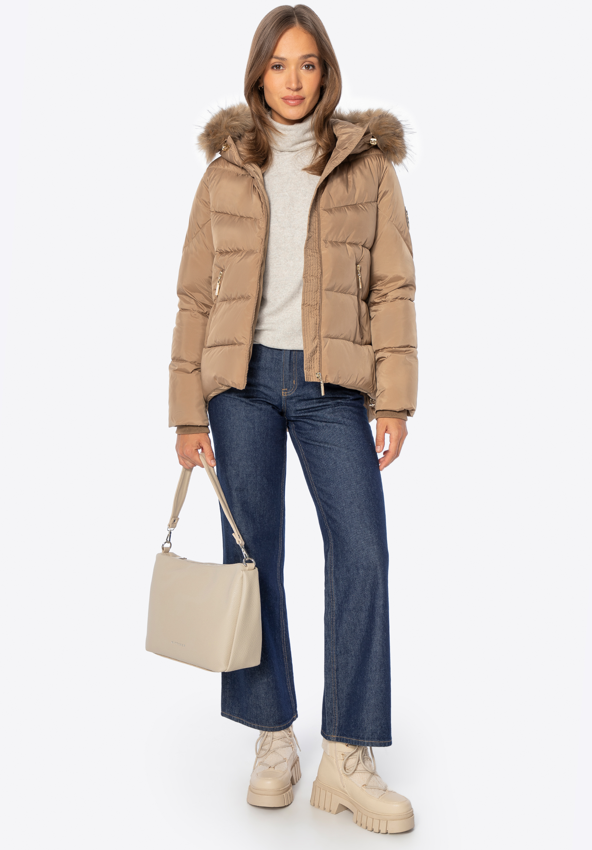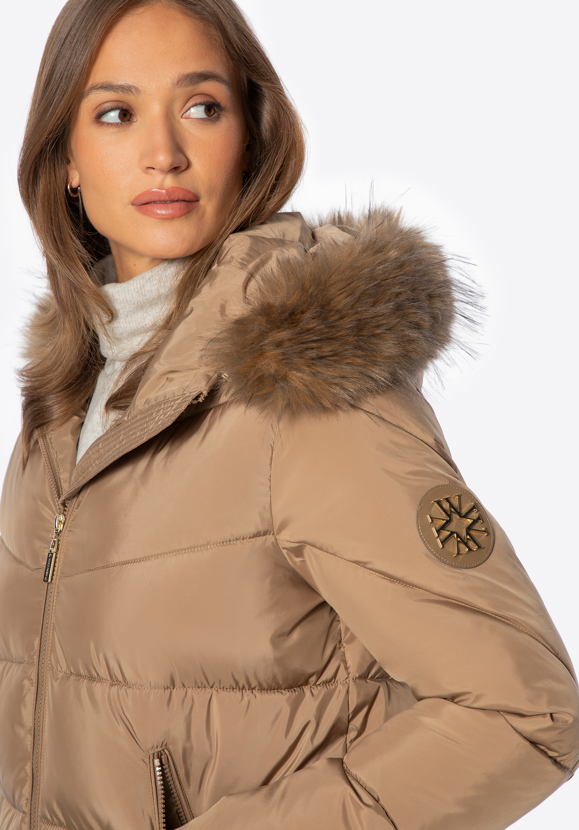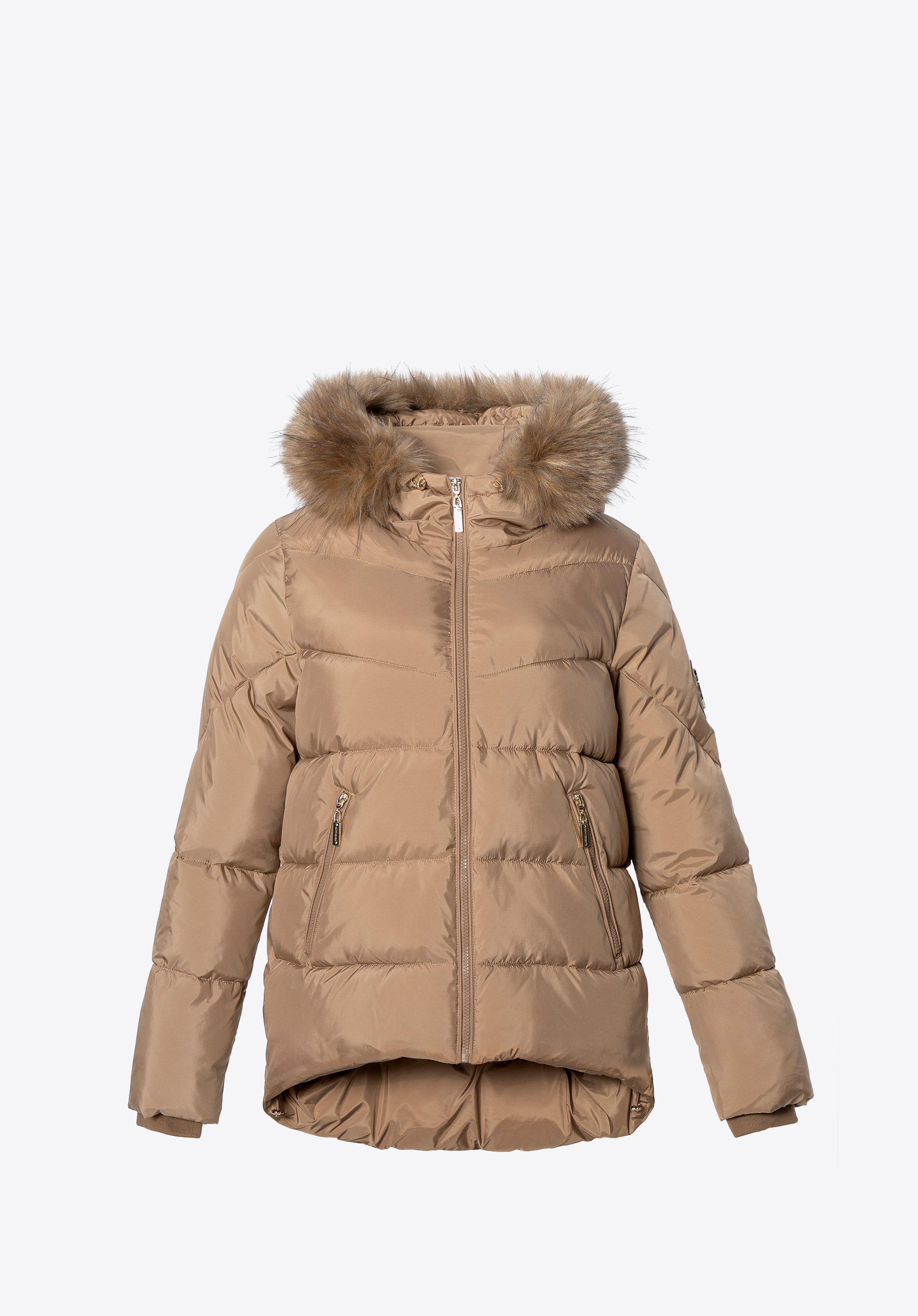 Шукаєте куртку, яка витримає зимові умови і водночас підкреслить ваш стиль? Ця модель – ідеальне поєднання функціональності та елегантності. Виготовлена з легкого, злегка блискучого поліестеру, вона чудово захищає від вітру та забезпечує комфорт навіть у найхолодніші дні. Пухова модель з стьобанням і м''яким наповнювачем огорне вас теплом, не перевантажуючи силует.