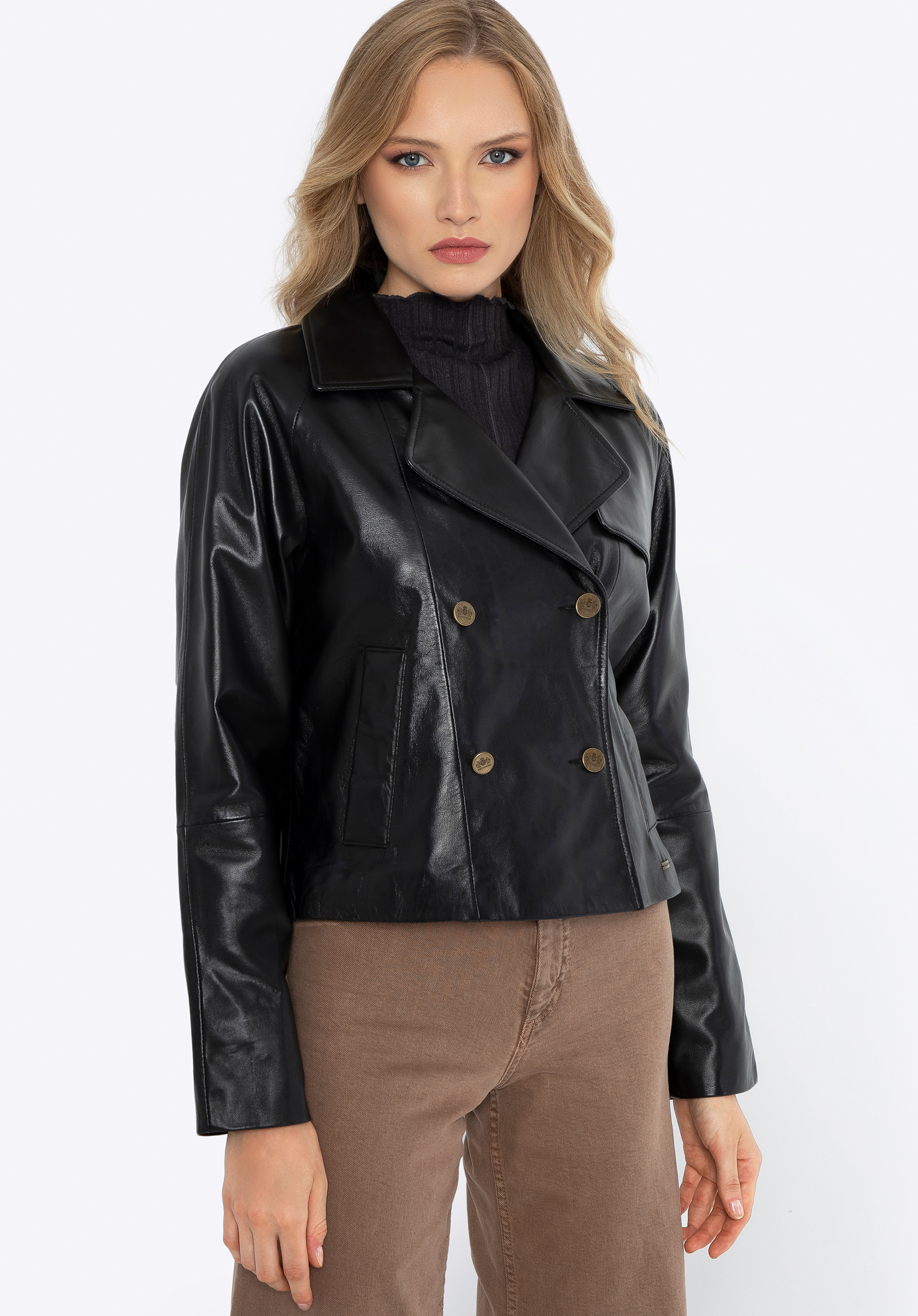 Жіноча шкіряна куртка - двобортна на гудзиках