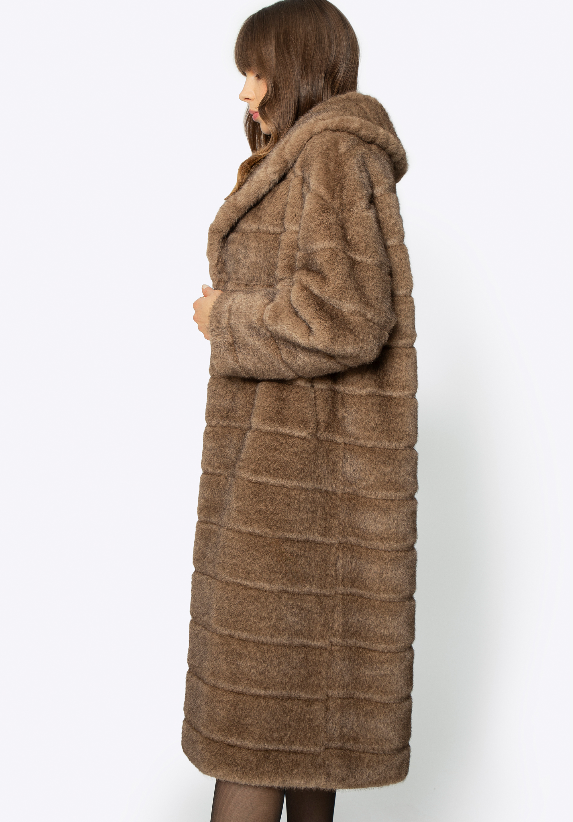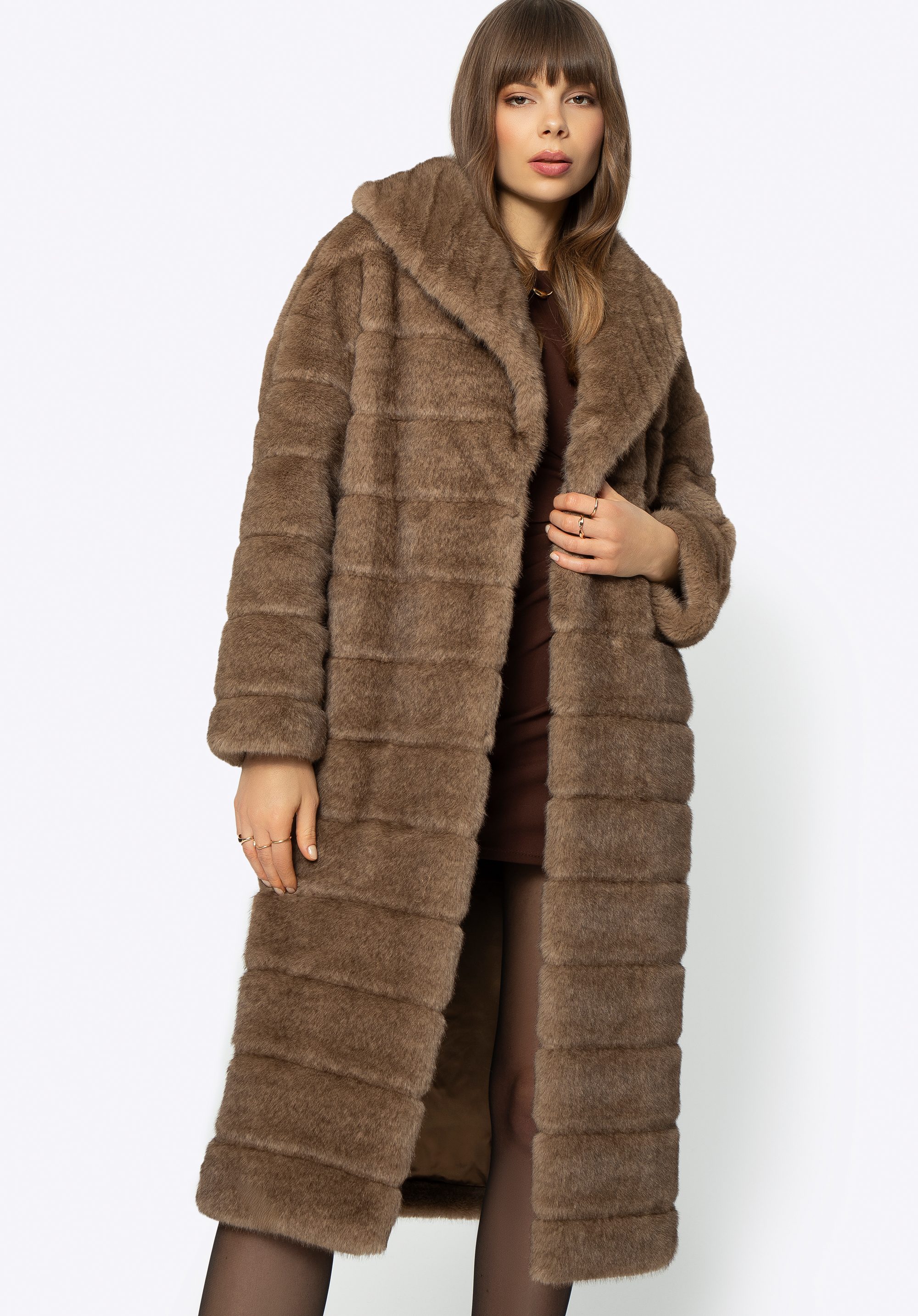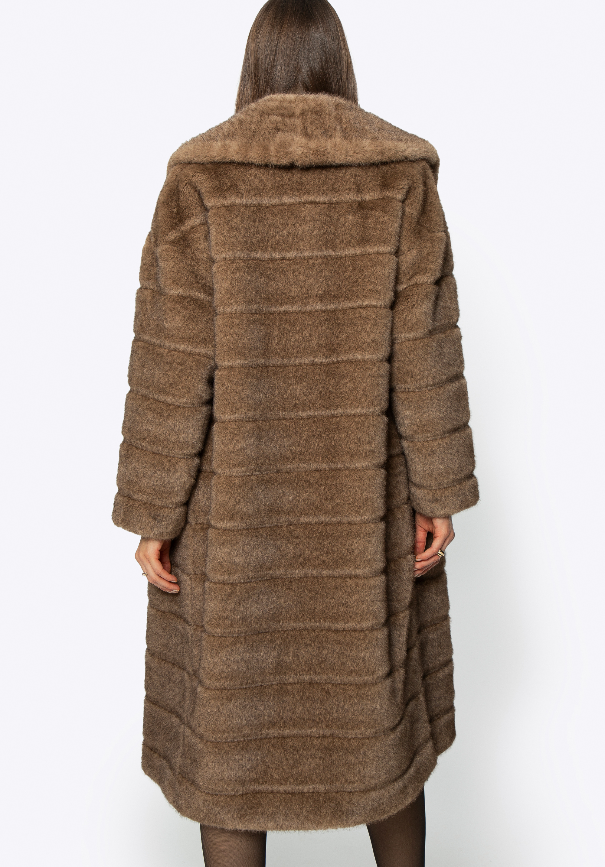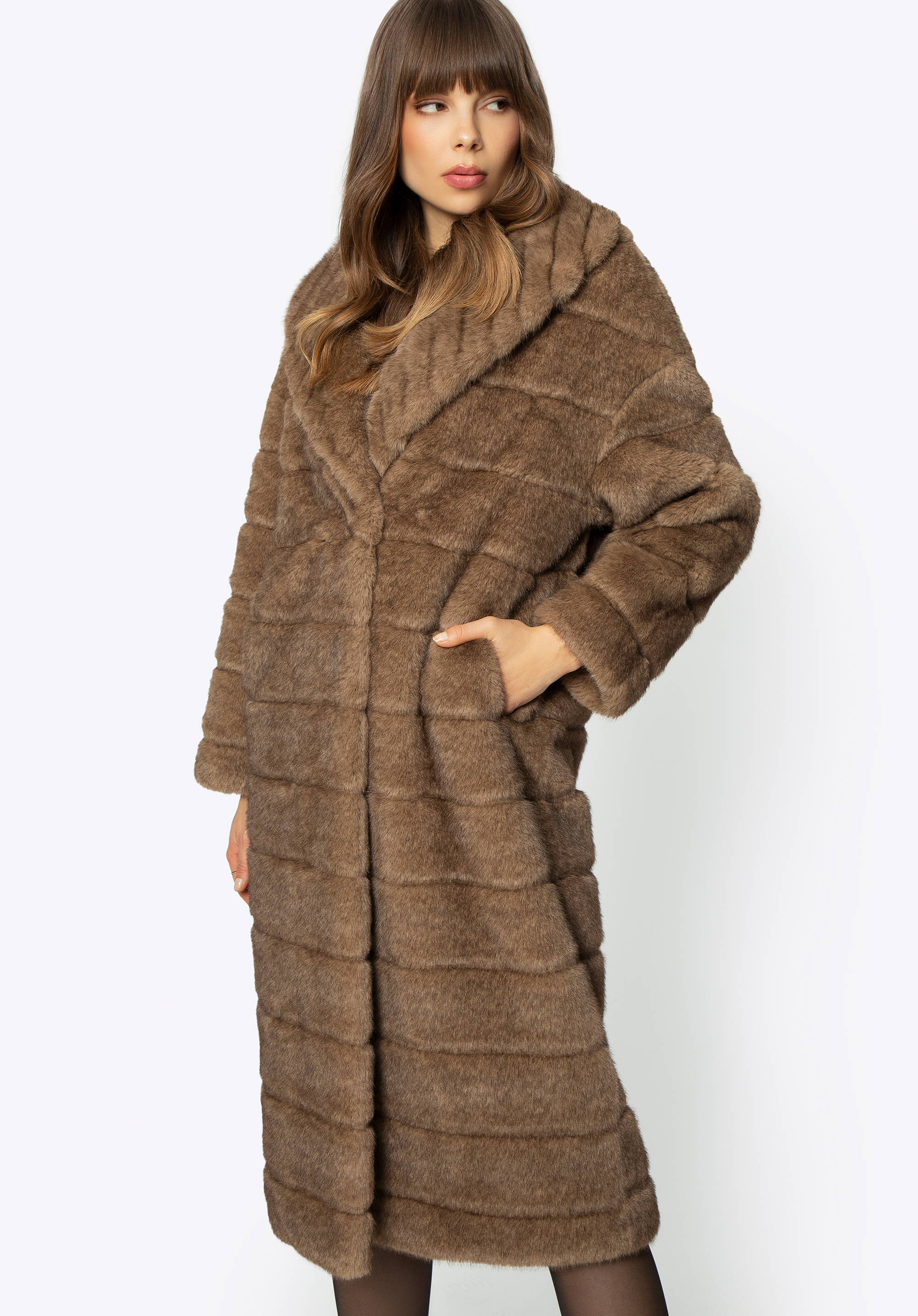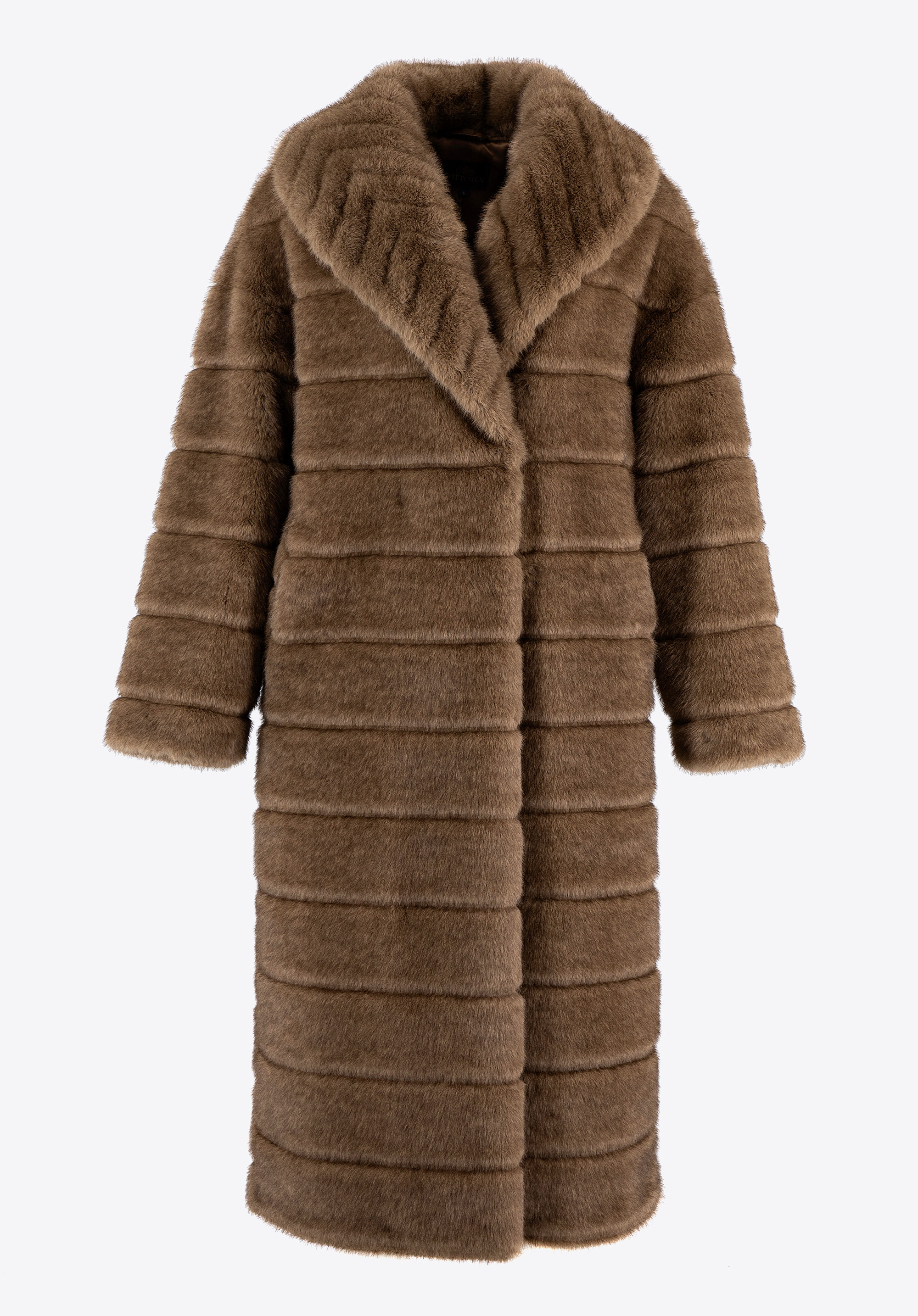 Наша шуба зі штучного хутра, яку цінують як ентузіасти моди, так і ті, хто шукає функціональний верхній одяг, поєднує в собі розкішний вигляд з етичним підходом до моди, пропонуючи елегантний стиль без компромісів. Простий, вільний крой створює багато можливостей для стилю, від елегантного до повсякденного. Пальто має приховану застібку зсередини та дві практичні кишені з боків, у які можна вмістити всі необхідні речі. Пишний хутряний комір великого розміру загортає вас у затишні обійми, підвищуючи стиль пальто своїм розкішним відтінком. Смуги на хутряному матеріалі створюють ефектні горизонтальні лінії, додаючи пальто сучасного стилю.