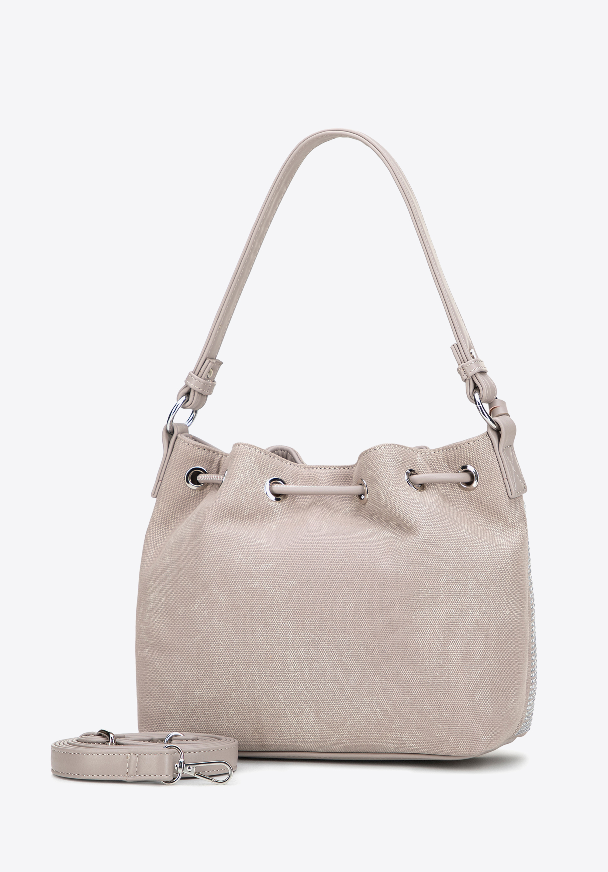 Оберіть сумочку, яка поєднує практичність з ніжним блиском. Виготовлена з бавовни з акцентами зі штучної шкіри на ручці, ремінці, шнурках, основі та оздобленні , вона може похвалитися стилем та сучасним виглядом. Застібка на шнурку та магнітна кнопка надійно зберігають ваші речі, а декоративна знімна китиця додає елегантності та дозволяє легко змінювати стиль. Ніжні стрази спереду додають блиску.