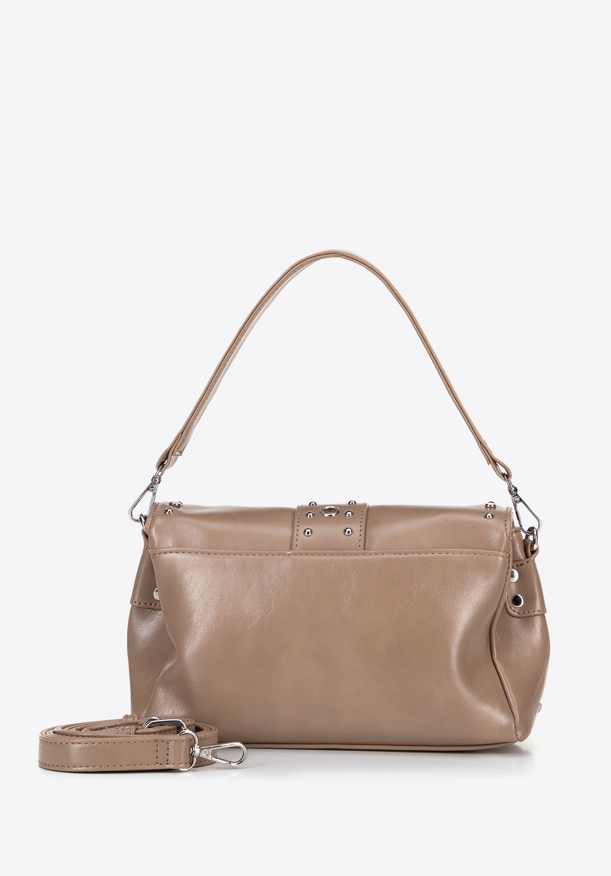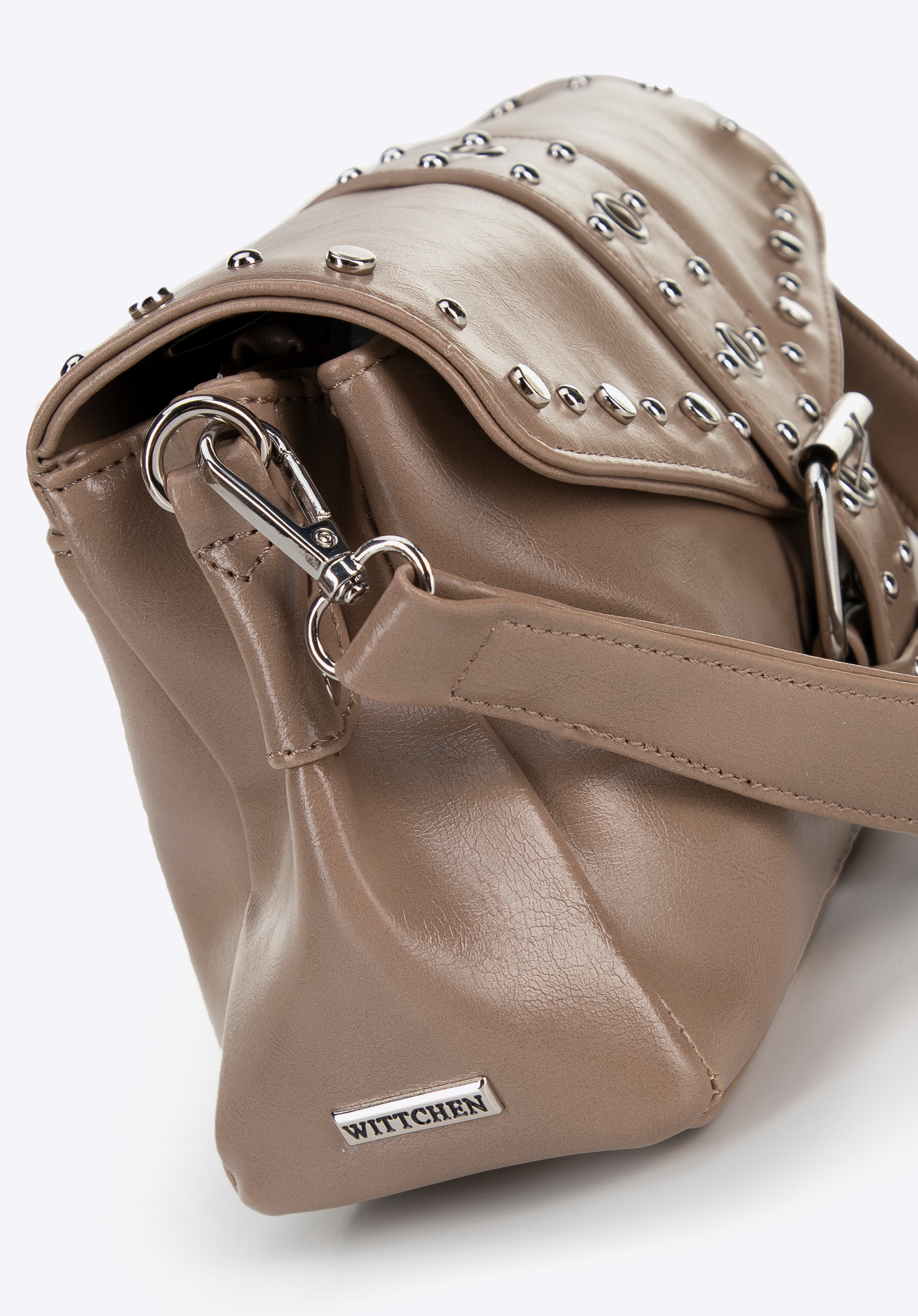 - Декоративні металеві заклепки та ремінь із пряжкою: ці деталі підкреслюють сміливий сучасний характер сумки.