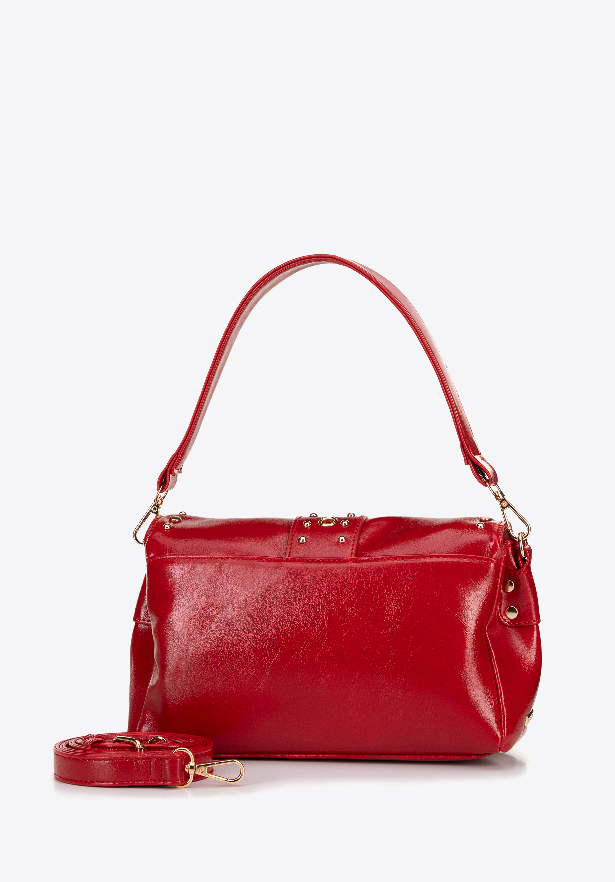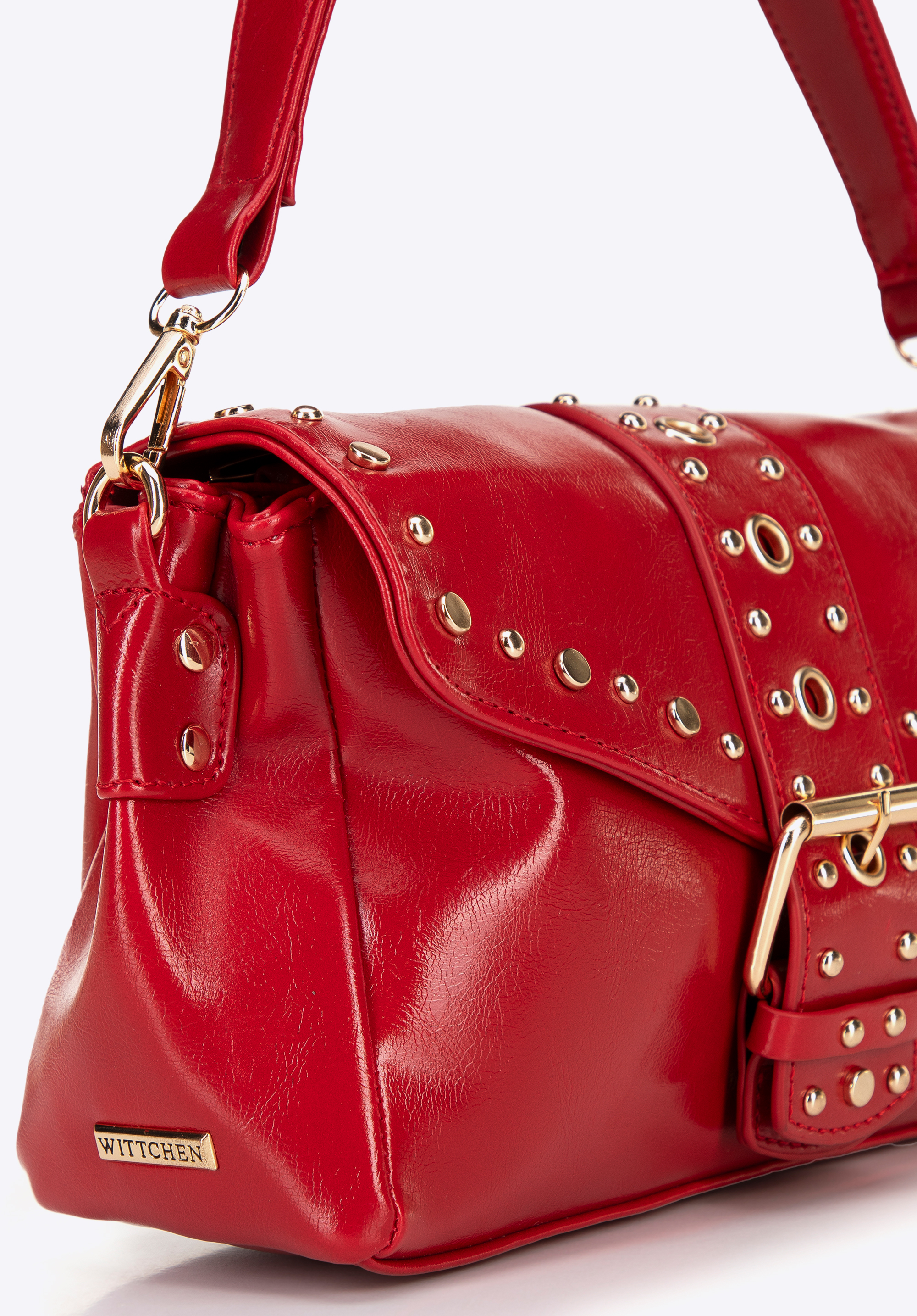 - Декоративні металеві заклепки та ремінь із пряжкою: ці деталі підкреслюють сміливий сучасний характер сумки.