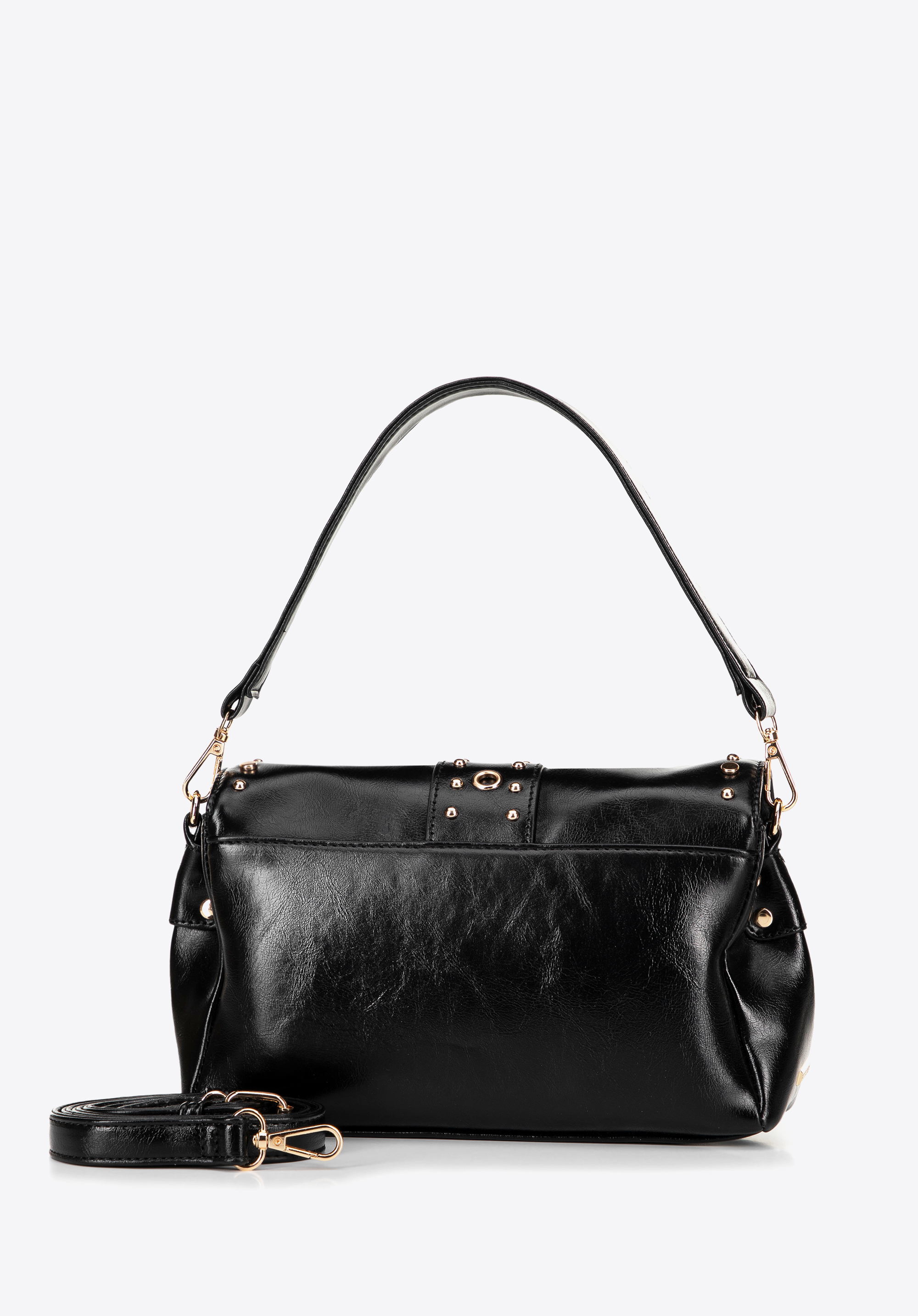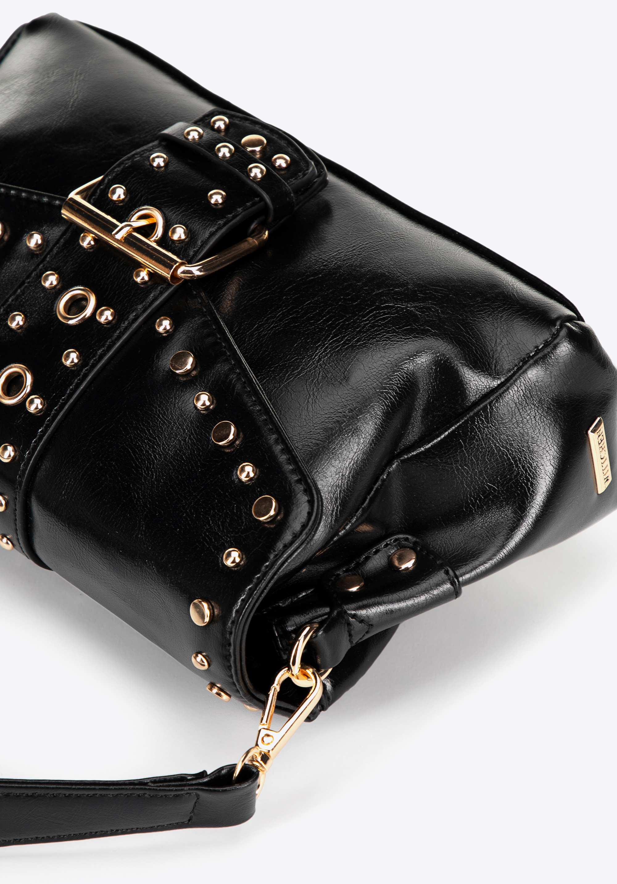 - Декоративні металеві заклепки та ремінь із пряжкою: ці деталі підкреслюють сміливий сучасний характер сумки.