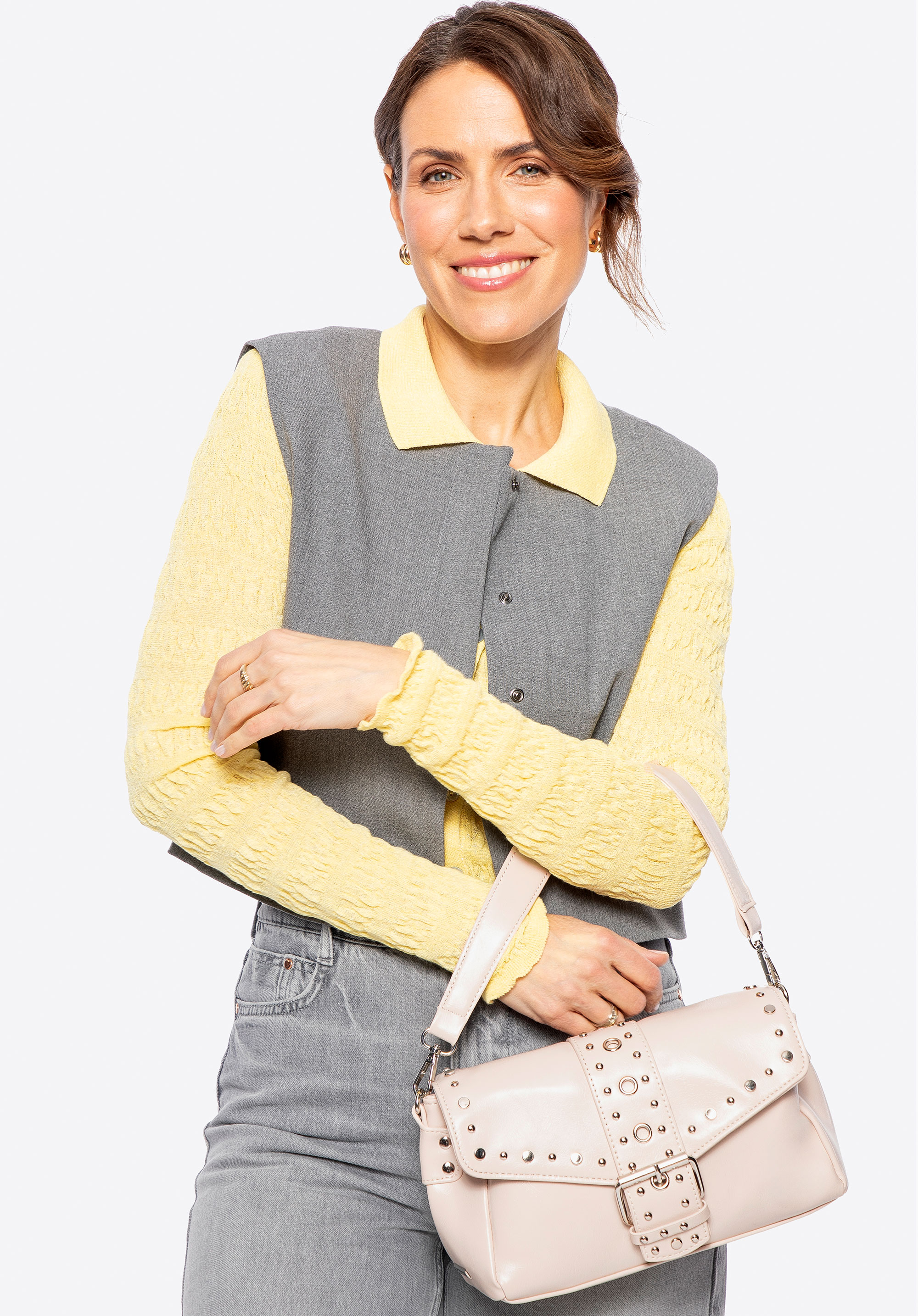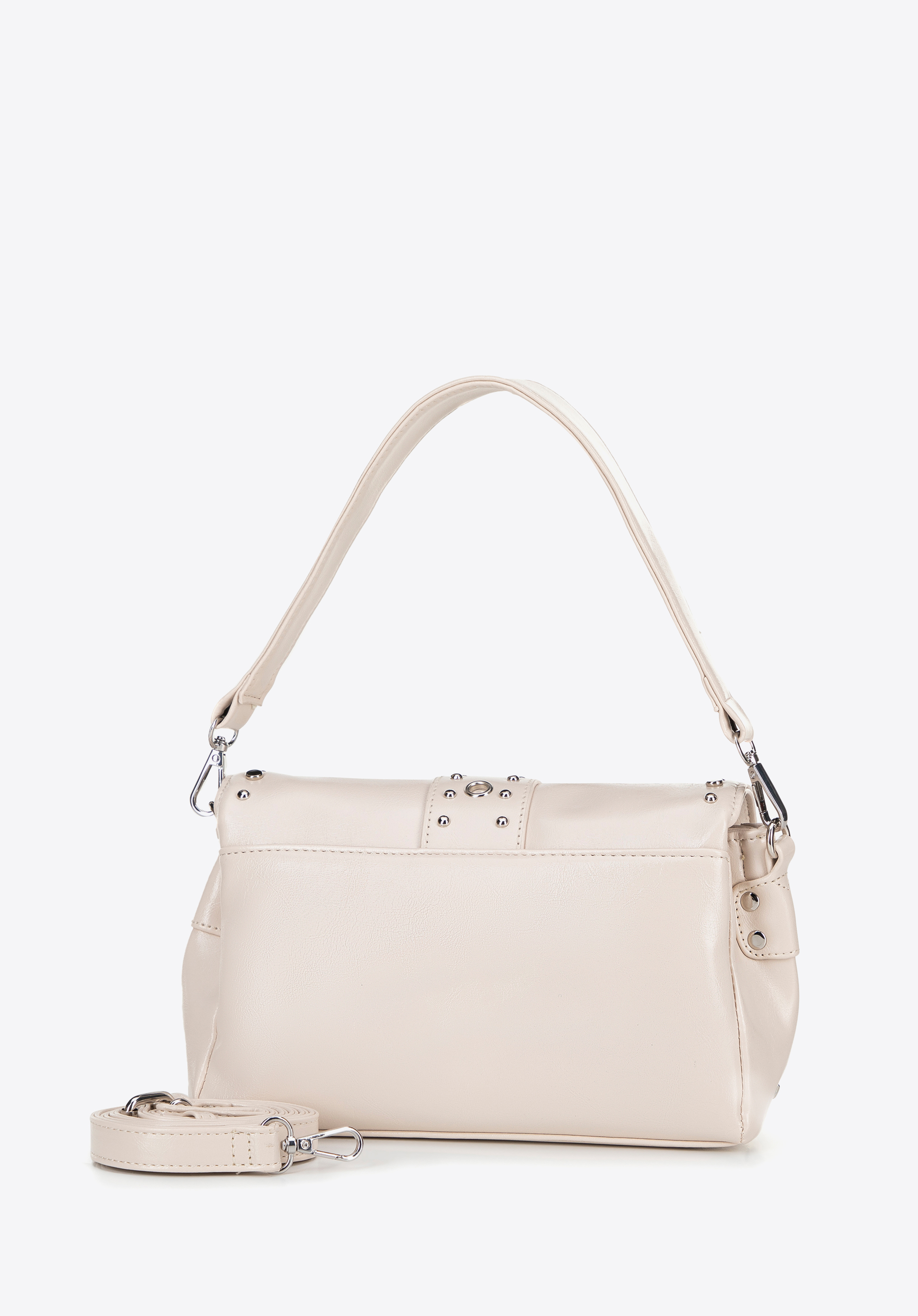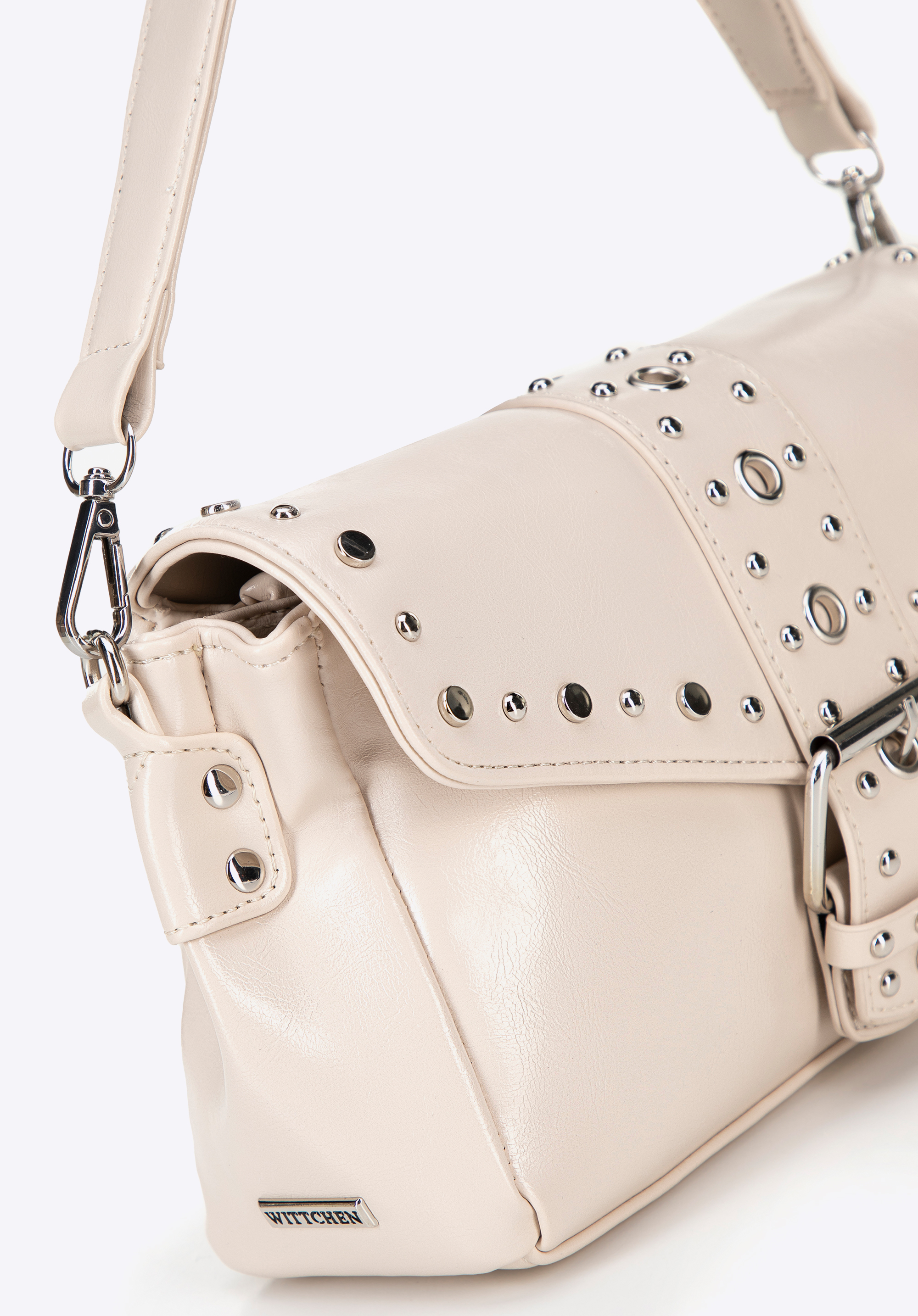 - Декоративні металеві заклепки та ремінь із пряжкою: ці деталі підкреслюють сміливий сучасний характер сумки.