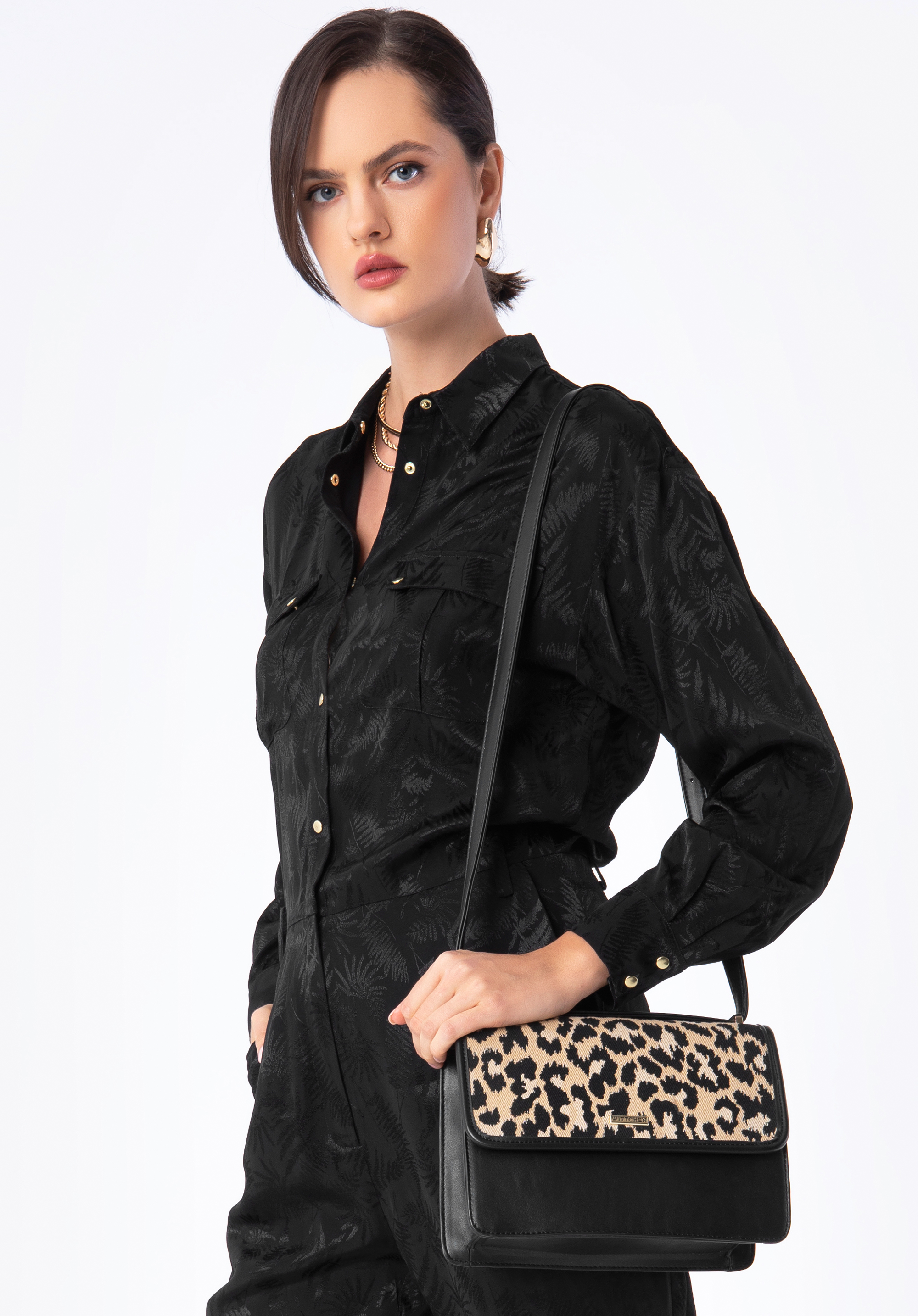 Ця унікальна сумка урізноманітнює кожен ваш стиль. Класичний дизайн сумки доповнено модним малюнком на клапані, що надає всьому неповторного характеру. Має жорсткий фасон, тому збереже гарну форму в будь-якій ситуації. Всередину можна помістити гаманець, телефон, невеликий календар, серветки та кілька дрібниць - ідеально підходить для походу з друзями, кінотеатру чи прогулянки. Жіноча сумка з екошкіри з клапаном з візерунком - це практичний і стильний аксесуар, який варто мати у своєму гардеробі.